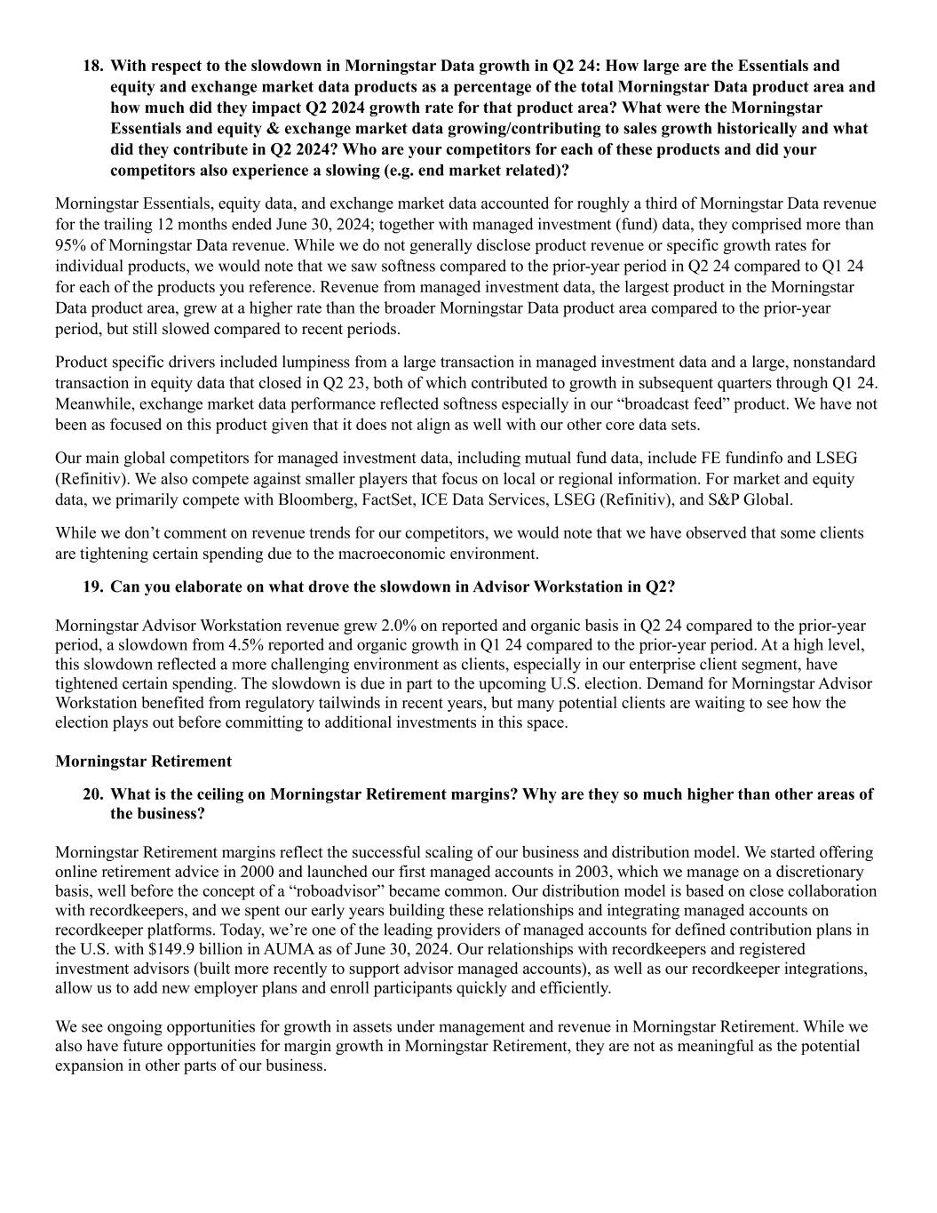 18. With respect to the slowdown in Morningstar Data growth in Q2 24: How large are the Essentials and equity and exchange market data products as a percentage of the total Morningstar Data product area and how much did they impact Q2 2024 growth rate for that product area? What were the Morningstar Essentials and equity & exchange market data growing/contributing to sales growth historically and what did they contribute in Q2 2024? Who are your competitors for each of these products and did your competitors also experience a slowing (e.g. end market related)? Morningstar Essentials, equity data, and exchange market data accounted for roughly a third of Morningstar Data revenue for the trailing 12 months ended June 30, 2024; together with managed investment (fund) data, they comprised more than 95% of Morningstar Data revenue. While we do not generally disclose product revenue or specific growth rates for individual products, we would note that we saw softness compared to the prior-year period in Q2 24 compared to Q1 24 for each of the products you reference. Revenue from managed investment data, the largest product in the Morningstar Data product area, grew at a higher rate than the broader Morningstar Data product area compared to the prior-year period, but still slowed compared to recent periods. Product specific drivers included lumpiness from a large transaction in managed investment data and a large, nonstandard transaction in equity data that closed in Q2 23, both of which contributed to growth in subsequent quarters through Q1 24. Meanwhile, exchange market data performance reflected softness especially in our “broadcast feed” product. We have not been as focused on this product given that it does not align as well with our other core data sets. Our main global competitors for managed investment data, including mutual fund data, include FE fundinfo and LSEG (Refinitiv). We also compete against smaller players that focus on local or regional information. For market and equity data, we primarily compete with Bloomberg, FactSet, ICE Data Services, LSEG (Refinitiv), and S&P Global. While we don’t comment on revenue trends for our competitors, we would note that we have observed that some clients are tightening certain spending due to the macroeconomic environment. 19. Can you elaborate on what drove the slowdown in Advisor Workstation in Q2? Morningstar Advisor Workstation revenue grew 2.0% on reported and organic basis in Q2 24 compared to the prior-year period, a slowdown from 4.5% reported and organic growth in Q1 24 compared to the prior-year period. At a high level, this slowdown reflected a more challenging environment as clients, especially in our enterprise client segment, have tightened certain spending. The slowdown is due in part to the upcoming U.S. election. Demand for Morningstar Advisor Workstation benefited from regulatory tailwinds in recent years, but many potential clients are waiting to see how the election plays out before committing to additional investments in this space. Morningstar Retirement 20. What is the ceiling on Morningstar Retirement margins? Why are they so much higher than other areas of the business? Morningstar Retirement margins reflect the successful scaling of our business and distribution model. We started offering online retirement advice in 2000 and launched our first managed accounts in 2003, which we manage on a discretionary basis, well before the concept of a “roboadvisor” became common. Our distribution model is based on close collaboration with recordkeepers, and we spent our early years building these relationships and integrating managed accounts on recordkeeper platforms. Today, we’re one of the leading providers of managed accounts for defined contribution plans in the U.S. with $149.9 billion in AUMA as of June 30, 2024. Our relationships with recordkeepers and registered investment advisors (built more recently to support advisor managed accounts), as well as our recordkeeper integrations, allow us to add new employer plans and enroll participants quickly and efficiently. We see ongoing opportunities for growth in assets under management and revenue in Morningstar Retirement. While we also have future opportunities for margin growth in Morningstar Retirement, they are not as meaningful as the potential expansion in other parts of our business.