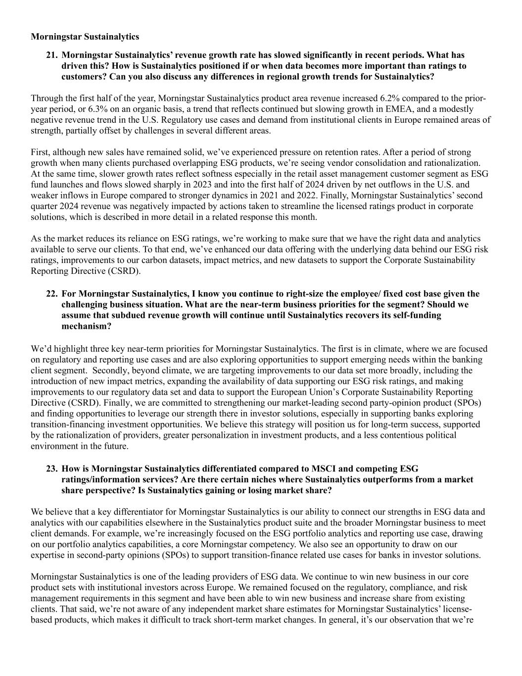 Morningstar Sustainalytics 21. Morningstar Sustainalytics’ revenue growth rate has slowed significantly in recent periods. What has driven this? How is Sustainalytics positioned if or when data becomes more important than ratings to customers? Can you also discuss any differences in regional growth trends for Sustainalytics? Through the first half of the year, Morningstar Sustainalytics product area revenue increased 6.2% compared to the prior- year period, or 6.3% on an organic basis, a trend that reflects continued but slowing growth in EMEA, and a modestly negative revenue trend in the U.S. Regulatory use cases and demand from institutional clients in Europe remained areas of strength, partially offset by challenges in several different areas. First, although new sales have remained solid, we’ve experienced pressure on retention rates. After a period of strong growth when many clients purchased overlapping ESG products, we’re seeing vendor consolidation and rationalization. At the same time, slower growth rates reflect softness especially in the retail asset management customer segment as ESG fund launches and flows slowed sharply in 2023 and into the first half of 2024 driven by net outflows in the U.S. and weaker inflows in Europe compared to stronger dynamics in 2021 and 2022. Finally, Morningstar Sustainalytics’ second quarter 2024 revenue was negatively impacted by actions taken to streamline the licensed ratings product in corporate solutions, which is described in more detail in a related response this month. As the market reduces its reliance on ESG ratings, we’re working to make sure that we have the right data and analytics available to serve our clients. To that end, we’ve enhanced our data offering with the underlying data behind our ESG risk ratings, improvements to our carbon datasets, impact metrics, and new datasets to support the Corporate Sustainability Reporting Directive (CSRD). 22. For Morningstar Sustainalytics, I know you continue to right-size the employee/ fixed cost base given the challenging business situation. What are the near-term business priorities for the segment? Should we assume that subdued revenue growth will continue until Sustainalytics recovers its self-funding mechanism? We’d highlight three key near-term priorities for Morningstar Sustainalytics. The first is in climate, where we are focused on regulatory and reporting use cases and are also exploring opportunities to support emerging needs within the banking client segment. Secondly, beyond climate, we are targeting improvements to our data set more broadly, including the introduction of new impact metrics, expanding the availability of data supporting our ESG risk ratings, and making improvements to our regulatory data set and data to support the European Union’s Corporate Sustainability Reporting Directive (CSRD). Finally, we are committed to strengthening our market-leading second party-opinion product (SPOs) and finding opportunities to leverage our strength there in investor solutions, especially in supporting banks exploring transition-financing investment opportunities. We believe this strategy will position us for long-term success, supported by the rationalization of providers, greater personalization in investment products, and a less contentious political environment in the future. 23. How is Morningstar Sustainalytics differentiated compared to MSCI and competing ESG ratings/information services? Are there certain niches where Sustainalytics outperforms from a market share perspective? Is Sustainalytics gaining or losing market share? We believe that a key differentiator for Morningstar Sustainalytics is our ability to connect our strengths in ESG data and analytics with our capabilities elsewhere in the Sustainalytics product suite and the broader Morningstar business to meet client demands. For example, we’re increasingly focused on the ESG portfolio analytics and reporting use case, drawing on our portfolio analytics capabilities, a core Morningstar competency. We also see an opportunity to draw on our expertise in second-party opinions (SPOs) to support transition-finance related use cases for banks in investor solutions. Morningstar Sustainalytics is one of the leading providers of ESG data. We continue to win new business in our core product sets with institutional investors across Europe. We remained focused on the regulatory, compliance, and risk management requirements in this segment and have been able to win new business and increase share from existing clients. That said, we’re not aware of any independent market share estimates for Morningstar Sustainalytics’ license- based products, which makes it difficult to track short-term market changes. In general, it’s our observation that we’re