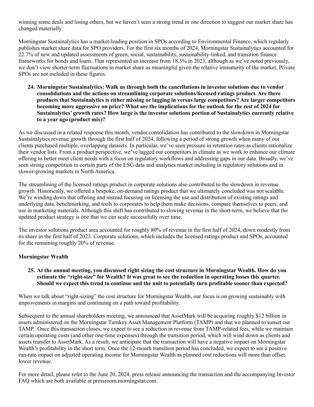 winning some deals and losing others, but we haven’t seen a strong trend in one direction to suggest our market share has changed materially. Morningstar Sustainalytics has a market-leading position in SPOs according to Environmental Finance, which regularly publishes market share data for SPO providers. For the first six months of 2024, Morningstar Sustainalytics accounted for 22.7% of new and updated assessments of green, social, sustainability, sustainability-linked, and transition finance frameworks for bonds and loans. That represented an increase from 18.3% in 2023, although as we’ve noted previously, we don’t view shorter-term fluctuations in market share as meaningful given the relative immaturity of the market. Private SPOs are not included in these figures. 24. Morningstar Sustainalytics: Walk us through both the cancellations in investor solutions due to vendor consolidations and the actions on streamlining corporate solutions/licensed ratings product. Are there products that Sustainalytics is either missing or lagging in versus large competitors? Are larger competitors becoming more aggressive on price? What are the implications for the outlook for the rest of 2024 for Sustainalytics’ growth rates? How large is the investor solutions portion of Sustainalytics currently relative to a year ago (product mix)? As we discussed in a related response this month, vendor consolidation has contributed to the slowdown in Morningstar Sustainalytics revenue growth through the first half of 2024, following a period of strong growth when many of our clients purchased multiple, overlapping datasets. In particular, we’ve seen pressure in retention rates as clients rationalize their vendor lists. From a product perspective, we’ve lagged our competitors in climate as we work to enhance our climate offering to better meet client needs with a focus on regulatory workflows and addressing gaps in our data. Broadly, we’ve seen strong competition in certain parts of the ESG data and analytics market including in regulatory solutions and in slower-growing markets in North America. The streamlining of the licensed ratings product in corporate solutions also contributed to the slowdown in revenue growth. Historically, we offered a bespoke, on-demand ratings product that we ultimately concluded was not scalable. We’re winding down that offering and instead focusing on licensing the use and distribution of existing ratings and underlying data, benchmarking, and tools to corporates to help them make decisions, compare themselves to peers, and use in marketing materials. Although this shift has contributed to slowing revenue in the short-term, we believe that the updated product strategy is one that we can scale successfully over time. The investor solutions product area accounted for roughly 80% of revenue in the first half of 2024, down modestly from its share in the first half of 2023. Corporate solutions, which includes the licensed ratings product and SPOs, accounted for the remaining roughly 20% of revenue. Morningstar Wealth 25. At the annual meeting, you discussed right sizing the cost structure in Morningstar Wealth. How do you estimate the “right-size” for Wealth? It was great to see the reduction in operating losses this quarter. Should we expect this trend to continue and the unit to potentially turn profitable sooner than expected? When we talk about “right-sizing” the cost structure for Morningstar Wealth, our focus is on growing sustainably with improvements in margins and continuing on a path toward profitability. Subsequent to the annual shareholders meeting, we announced that AssetMark will be acquiring roughly $12 billion in assets administered on the Morningstar Turnkey Asset Management Platform (TAMP) and that we planned to sunset our TAMP. Once this transaction closes, we expect to see a reduction in revenue from TAMP-related fees, while we maintain certain operating costs (and other one-time expenses) through the transition period, which will wind down as clients and assets transfer to AssetMark. As a result, we anticipate that the transaction will have a negative impact on Morningstar Wealth’s profitability in the short term. Once the 12-month transition period has concluded, we expect to see a positive run-rate impact on adjusted operating income for Morningstar Wealth as planned cost reductions will more than offset lower revenue. For more detail, please refer to the June 20, 2024, press release announcing the transaction and the accompanying Investor FAQ which are both available at pressroom.morningstar.com.