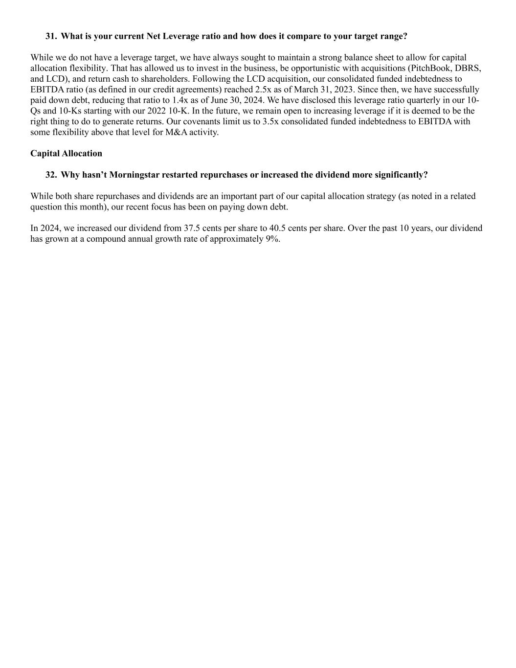 31. What is your current Net Leverage ratio and how does it compare to your target range? While we do not have a leverage target, we have always sought to maintain a strong balance sheet to allow for capital allocation flexibility. That has allowed us to invest in the business, be opportunistic with acquisitions (PitchBook, DBRS, and LCD), and return cash to shareholders. Following the LCD acquisition, our consolidated funded indebtedness to EBITDA ratio (as defined in our credit agreements) reached 2.5x as of March 31, 2023. Since then, we have successfully paid down debt, reducing that ratio to 1.4x as of June 30, 2024. We have disclosed this leverage ratio quarterly in our 10- Qs and 10-Ks starting with our 2022 10-K. In the future, we remain open to increasing leverage if it is deemed to be the right thing to do to generate returns. Our covenants limit us to 3.5x consolidated funded indebtedness to EBITDA with some flexibility above that level for M&A activity. Capital Allocation 32. Why hasn’t Morningstar restarted repurchases or increased the dividend more significantly? While both share repurchases and dividends are an important part of our capital allocation strategy (as noted in a related question this month), our recent focus has been on paying down debt. In 2024, we increased our dividend from 37.5 cents per share to 40.5 cents per share. Over the past 10 years, our dividend has grown at a compound annual growth rate of approximately 9%.