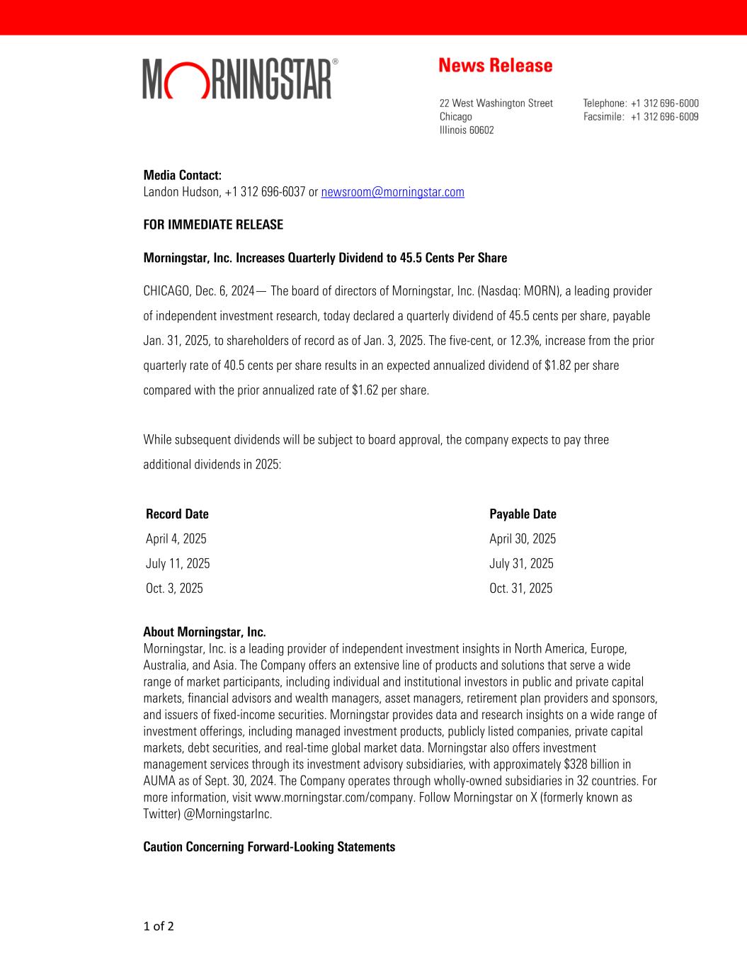 1 of 2 Media Contact: Landon Hudson, +1 312 696-6037 or newsroom@morningstar.com FOR IMMEDIATE RELEASE Morningstar, Inc. Increases Quarterly Dividend to 45.5 Cents Per Share CHICAGO, Dec. 6, 2024— The board of directors of Morningstar, Inc. (Nasdaq: MORN), a leading provider of independent investment research, today declared a quarterly dividend of 45.5 cents per share, payable Jan. 31, 2025, to shareholders of record as of Jan. 3, 2025. The five-cent, or 12.3%, increase from the prior quarterly rate of 40.5 cents per share results in an expected annualized dividend of $1.82 per share compared with the prior annualized rate of $1.62 per share. While subsequent dividends will be subject to board approval, the company expects to pay three additional dividends in 2025: Record Date Payable Date April 4, 2025 April 30, 2025 July 11, 2025 July 31, 2025 Oct. 3, 2025 Oct. 31, 2025 About Morningstar, Inc. Morningstar, Inc. is a leading provider of independent investment insights in North America, Europe, Australia, and Asia. The Company offers an extensive line of products and solutions that serve a wide range of market participants, including individual and institutional investors in public and private capital markets, financial advisors and wealth managers, asset managers, retirement plan providers and sponsors, and issuers of fixed-income securities. Morningstar provides data and research insights on a wide range of investment offerings, including managed investment products, publicly listed companies, private capital markets, debt securities, and real-time global market data. Morningstar also offers investment management services through its investment advisory subsidiaries, with approximately $328 billion in AUMA as of Sept. 30, 2024. The Company operates through wholly-owned subsidiaries in 32 countries. For more information, visit www.morningstar.com/company. Follow Morningstar on X (formerly known as Twitter) @MorningstarInc. Caution Concerning Forward-Looking Statements