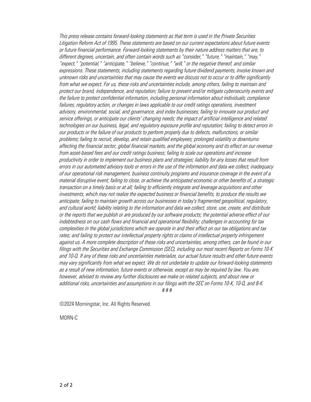 2 of 2 This press release contains forward-looking statements as that term is used in the Private Securities Litigation Reform Act of 1995. These statements are based on our current expectations about future events or future financial performance. Forward-looking statements by their nature address matters that are, to different degrees, uncertain, and often contain words such as “consider,” “future,” “maintain,” “may,” “expect,” “potential,” “anticipate,” “believe,” “continue,” “will,” or the negative thereof, and similar expressions. These statements, including statements regarding future dividend payments, involve known and unknown risks and uncertainties that may cause the events we discuss not to occur or to differ significantly from what we expect. For us, these risks and uncertainties include, among others, failing to maintain and protect our brand, independence, and reputation; failure to prevent and/or mitigate cybersecurity events and the failure to protect confidential information, including personal information about individuals; compliance failures, regulatory action, or changes in laws applicable to our credit ratings operations, investment advisory, environmental, social, and governance, and index businesses; failing to innovate our product and service offerings, or anticipate our clients’ changing needs; the impact of artificial intelligence and related technologies on our business, legal, and regulatory exposure profile and reputation; failing to detect errors in our products or the failure of our products to perform properly due to defects, malfunctions, or similar problems; failing to recruit, develop, and retain qualified employees; prolonged volatility or downturns affecting the financial sector, global financial markets, and the global economy and its effect on our revenue from asset-based fees and our credit ratings business; failing to scale our operations and increase productivity in order to implement our business plans and strategies; liability for any losses that result from errors in our automated advisory tools or errors in the use of the information and data we collect; inadequacy of our operational risk management, business continuity programs and insurance coverage in the event of a material disruptive event; failing to close, or achieve the anticipated economic or other benefits of, a strategic transaction on a timely basis or at all; failing to efficiently integrate and leverage acquisitions and other investments, which may not realize the expected business or financial benefits, to produce the results we anticipate; failing to maintain growth across our businesses in today's fragmented geopolitical, regulatory, and cultural world; liability relating to the information and data we collect, store, use, create, and distribute or the reports that we publish or are produced by our software products; the potential adverse effect of our indebtedness on our cash flows and financial and operational flexibility; challenges in accounting for tax complexities in the global jurisdictions which we operate in and their effect on our tax obligations and tax rates; and failing to protect our intellectual property rights or claims of intellectual property infringement against us. A more complete description of these risks and uncertainties, among others, can be found in our filings with the Securities and Exchange Commission (SEC), including our most recent Reports on Forms 10-K and 10-Q. If any of these risks and uncertainties materialize, our actual future results and other future events may vary significantly from what we expect. We do not undertake to update our forward-looking statements as a result of new information, future events or otherwise, except as may be required by law. You are, however, advised to review any further disclosures we make on related subjects, and about new or additional risks, uncertainties and assumptions in our filings with the SEC on Forms 10-K, 10-Q, and 8-K. # # # ©2024 Morningstar, Inc. All Rights Reserved. MORN-C
