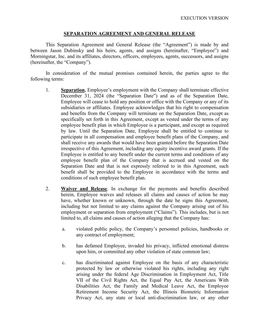 EXECUTION VERSION SEPARATION AGREEMENT AND GENERAL RELEASE This Separation Agreement and General Release (the “Agreement”) is made by and between Jason Dubinsky and his heirs, agents, and assigns (hereinafter, “Employee”) and Morningstar, Inc. and its affiliates, directors, officers, employees, agents, successors, and assigns (hereinafter, the “Company”). In consideration of the mutual promises contained herein, the parties agree to the following terms: 1. Separation. Employee’s employment with the Company shall terminate effective December 31, 2024 (the “Separation Date”) and as of the Separation Date, Employee will cease to hold any position or office with the Company or any of its subsidiaries or affiliates. Employee acknowledges that his right to compensation and benefits from the Company will terminate on the Separation Date, except as specifically set forth in this Agreement, except as vested under the terms of any employee benefit plan in which Employee is a participant, and except as required by law. Until the Separation Date, Employee shall be entitled to continue to participate in all compensation and employee benefit plans of the Company, and shall receive any awards that would have been granted before the Separation Date irrespective of this Agreement, including any equity incentive award grants. If the Employee is entitled to any benefit under the current terms and conditions of any employee benefit plan of the Company that is accrued and vested on the Separation Date and that is not expressly referred to in this Agreement, such benefit shall be provided to the Employee in accordance with the terms and conditions of such employee benefit plan. 2. Waiver and Release. In exchange for the payments and benefits described herein, Employee waives and releases all claims and causes of action he may have, whether known or unknown, through the date he signs this Agreement, including but not limited to any claims against the Company arising out of his employment or separation from employment (“Claims”). This includes, but is not limited to, all claims and causes of action alleging that the Company has: a. violated public policy, the Company’s personnel policies, handbooks or any contract of employment; b. has defamed Employee, invaded his privacy, inflicted emotional distress upon him, or committed any other violation of state common law; c. has discriminated against Employee on the basis of any characteristic protected by law or otherwise violated his rights, including any right arising under the federal Age Discrimination in Employment Act, Title VII of the Civil Rights Act, the Equal Pay Act, the Americans With Disabilities Act, the Family and Medical Leave Act, the Employee Retirement Income Security Act, the Illinois Biometric Information Privacy Act, any state or local anti-discrimination law, or any other