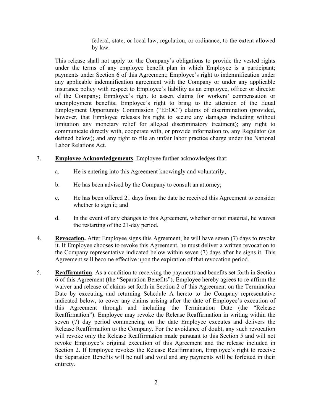 2 federal, state, or local law, regulation, or ordinance, to the extent allowed by law. This release shall not apply to: the Company’s obligations to provide the vested rights under the terms of any employee benefit plan in which Employee is a participant; payments under Section 6 of this Agreement; Employee’s right to indemnification under any applicable indemnification agreement with the Company or under any applicable insurance policy with respect to Employee’s liability as an employee, officer or director of the Company; Employee’s right to assert claims for workers’ compensation or unemployment benefits; Employee’s right to bring to the attention of the Equal Employment Opportunity Commission (“EEOC”) claims of discrimination (provided, however, that Employee releases his right to secure any damages including without limitation any monetary relief for alleged discriminatory treatment); any right to communicate directly with, cooperate with, or provide information to, any Regulator (as defined below); and any right to file an unfair labor practice charge under the National Labor Relations Act. 3. Employee Acknowledgements. Employee further acknowledges that: a. He is entering into this Agreement knowingly and voluntarily; b. He has been advised by the Company to consult an attorney; c. He has been offered 21 days from the date he received this Agreement to consider whether to sign it; and d. In the event of any changes to this Agreement, whether or not material, he waives the restarting of the 21-day period. 4. Revocation. After Employee signs this Agreement, he will have seven (7) days to revoke it. If Employee chooses to revoke this Agreement, he must deliver a written revocation to the Company representative indicated below within seven (7) days after he signs it. This Agreement will become effective upon the expiration of that revocation period. 5. Reaffirmation. As a condition to receiving the payments and benefits set forth in Section 6 of this Agreement (the “Separation Benefits”), Employee hereby agrees to re-affirm the waiver and release of claims set forth in Section 2 of this Agreement on the Termination Date by executing and returning Schedule A hereto to the Company representative indicated below, to cover any claims arising after the date of Employee’s execution of this Agreement through and including the Termination Date (the “Release Reaffirmation”). Employee may revoke the Release Reaffirmation in writing within the seven (7) day period commencing on the date Employee executes and delivers the Release Reaffirmation to the Company. For the avoidance of doubt, any such revocation will revoke only the Release Reaffirmation made pursuant to this Section 5 and will not revoke Employee’s original execution of this Agreement and the release included in Section 2. If Employee revokes the Release Reaffirmation, Employee’s right to receive the Separation Benefits will be null and void and any payments will be forfeited in their entirety.