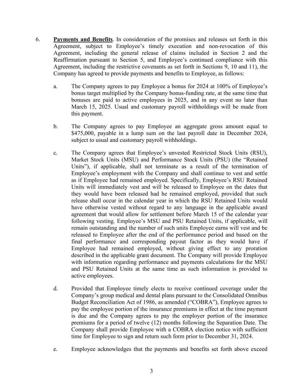 3 6. Payments and Benefits. In consideration of the promises and releases set forth in this Agreement, subject to Employee’s timely execution and non-revocation of this Agreement, including the general release of claims included in Section 2 and the Reaffirmation pursuant to Section 5, and Employee’s continued compliance with this Agreement, including the restrictive covenants as set forth in Sections 9, 10 and 11), the Company has agreed to provide payments and benefits to Employee, as follows: a. The Company agrees to pay Employee a bonus for 2024 at 100% of Employee’s bonus target multiplied by the Company bonus-funding rate, at the same time that bonuses are paid to active employees in 2025, and in any event no later than March 15, 2025. Usual and customary payroll withholdings will be made from this payment. b. The Company agrees to pay Employee an aggregate gross amount equal to $475,000, payable in a lump sum on the last payroll date in December 2024, subject to usual and customary payroll withholdings. c. The Company agrees that Employee’s unvested Restricted Stock Units (RSU), Market Stock Units (MSU) and Performance Stock Units (PSU) (the “Retained Units”), if applicable, shall not terminate as a result of the termination of Employee’s employment with the Company and shall continue to vest and settle as if Employee had remained employed. Specifically, Employee’s RSU Retained Units will immediately vest and will be released to Employee on the dates that they would have been released had he remained employed, provided that such release shall occur in the calendar year in which the RSU Retained Units would have otherwise vested without regard to any language in the applicable award agreement that would allow for settlement before March 15 of the calendar year following vesting. Employee’s MSU and PSU Retained Units, if applicable, will remain outstanding and the number of such units Employee earns will vest and be released to Employee after the end of the performance period and based on the final performance and corresponding payout factor as they would have if Employee had remained employed, without giving effect to any proration described in the applicable grant document. The Company will provide Employee with information regarding performance and payments calculations for the MSU and PSU Retained Units at the same time as such information is provided to active employees. d. Provided that Employee timely elects to receive continued coverage under the Company’s group medical and dental plans pursuant to the Consolidated Omnibus Budget Reconciliation Act of 1986, as amended (“COBRA”), Employee agrees to pay the employee portion of the insurance premiums in effect at the time payment is due and the Company agrees to pay the employer portion of the insurance premiums for a period of twelve (12) months following the Separation Date. The Company shall provide Employee with a COBRA election notice with sufficient time for Employee to sign and return such form prior to December 31, 2024. e. Employee acknowledges that the payments and benefits set forth above exceed