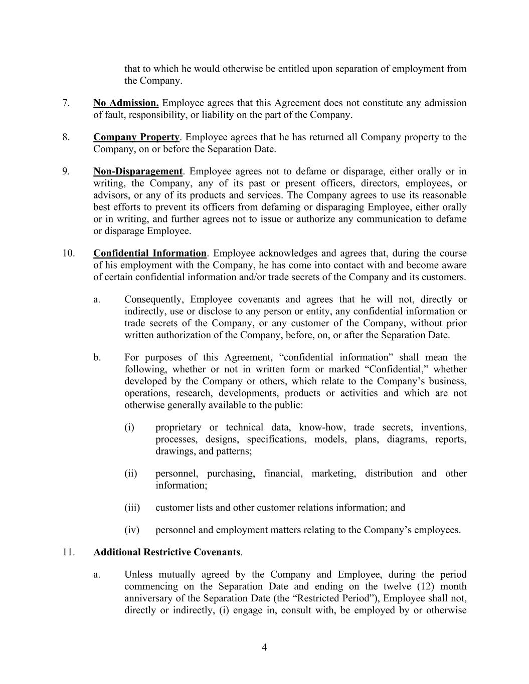 4 that to which he would otherwise be entitled upon separation of employment from the Company. 7. No Admission. Employee agrees that this Agreement does not constitute any admission of fault, responsibility, or liability on the part of the Company. 8. Company Property. Employee agrees that he has returned all Company property to the Company, on or before the Separation Date. 9. Non-Disparagement. Employee agrees not to defame or disparage, either orally or in writing, the Company, any of its past or present officers, directors, employees, or advisors, or any of its products and services. The Company agrees to use its reasonable best efforts to prevent its officers from defaming or disparaging Employee, either orally or in writing, and further agrees not to issue or authorize any communication to defame or disparage Employee. 10. Confidential Information. Employee acknowledges and agrees that, during the course of his employment with the Company, he has come into contact with and become aware of certain confidential information and/or trade secrets of the Company and its customers. a. Consequently, Employee covenants and agrees that he will not, directly or indirectly, use or disclose to any person or entity, any confidential information or trade secrets of the Company, or any customer of the Company, without prior written authorization of the Company, before, on, or after the Separation Date. b. For purposes of this Agreement, “confidential information” shall mean the following, whether or not in written form or marked “Confidential,” whether developed by the Company or others, which relate to the Company’s business, operations, research, developments, products or activities and which are not otherwise generally available to the public: (i) proprietary or technical data, know-how, trade secrets, inventions, processes, designs, specifications, models, plans, diagrams, reports, drawings, and patterns; (ii) personnel, purchasing, financial, marketing, distribution and other information; (iii) customer lists and other customer relations information; and (iv) personnel and employment matters relating to the Company’s employees. 11. Additional Restrictive Covenants. a. Unless mutually agreed by the Company and Employee, during the period commencing on the Separation Date and ending on the twelve (12) month anniversary of the Separation Date (the “Restricted Period”), Employee shall not, directly or indirectly, (i) engage in, consult with, be employed by or otherwise