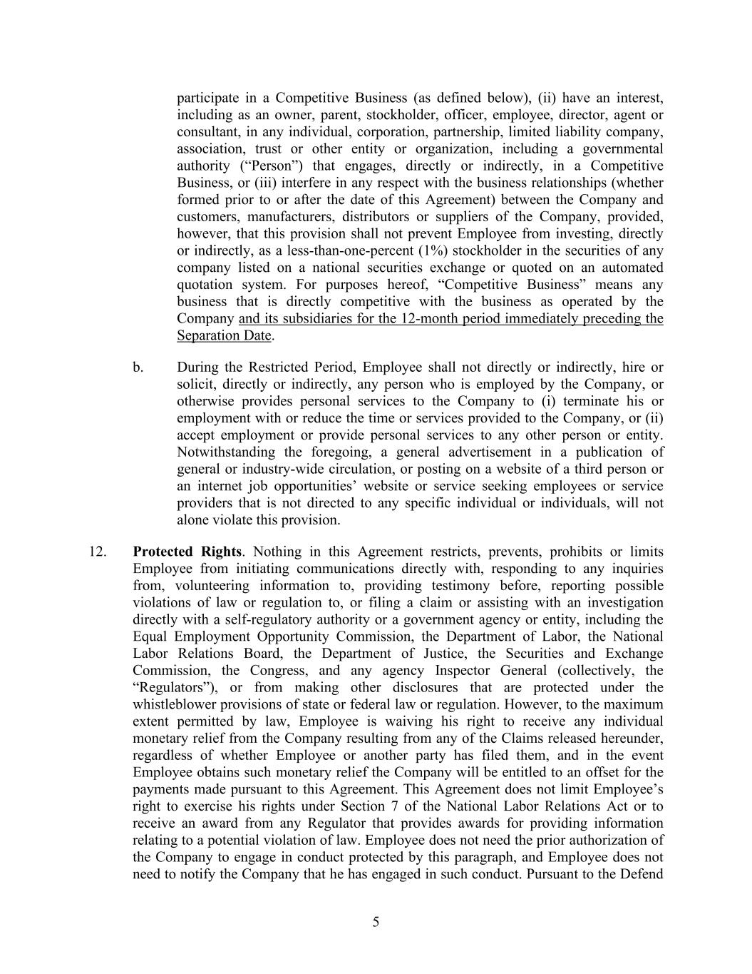 5 participate in a Competitive Business (as defined below), (ii) have an interest, including as an owner, parent, stockholder, officer, employee, director, agent or consultant, in any individual, corporation, partnership, limited liability company, association, trust or other entity or organization, including a governmental authority (“Person”) that engages, directly or indirectly, in a Competitive Business, or (iii) interfere in any respect with the business relationships (whether formed prior to or after the date of this Agreement) between the Company and customers, manufacturers, distributors or suppliers of the Company, provided, however, that this provision shall not prevent Employee from investing, directly or indirectly, as a less-than-one-percent (1%) stockholder in the securities of any company listed on a national securities exchange or quoted on an automated quotation system. For purposes hereof, “Competitive Business” means any business that is directly competitive with the business as operated by the Company and its subsidiaries for the 12-month period immediately preceding the Separation Date. b. During the Restricted Period, Employee shall not directly or indirectly, hire or solicit, directly or indirectly, any person who is employed by the Company, or otherwise provides personal services to the Company to (i) terminate his or employment with or reduce the time or services provided to the Company, or (ii) accept employment or provide personal services to any other person or entity. Notwithstanding the foregoing, a general advertisement in a publication of general or industry-wide circulation, or posting on a website of a third person or an internet job opportunities’ website or service seeking employees or service providers that is not directed to any specific individual or individuals, will not alone violate this provision. 12. Protected Rights. Nothing in this Agreement restricts, prevents, prohibits or limits Employee from initiating communications directly with, responding to any inquiries from, volunteering information to, providing testimony before, reporting possible violations of law or regulation to, or filing a claim or assisting with an investigation directly with a self-regulatory authority or a government agency or entity, including the Equal Employment Opportunity Commission, the Department of Labor, the National Labor Relations Board, the Department of Justice, the Securities and Exchange Commission, the Congress, and any agency Inspector General (collectively, the “Regulators”), or from making other disclosures that are protected under the whistleblower provisions of state or federal law or regulation. However, to the maximum extent permitted by law, Employee is waiving his right to receive any individual monetary relief from the Company resulting from any of the Claims released hereunder, regardless of whether Employee or another party has filed them, and in the event Employee obtains such monetary relief the Company will be entitled to an offset for the payments made pursuant to this Agreement. This Agreement does not limit Employee’s right to exercise his rights under Section 7 of the National Labor Relations Act or to receive an award from any Regulator that provides awards for providing information relating to a potential violation of law. Employee does not need the prior authorization of the Company to engage in conduct protected by this paragraph, and Employee does not need to notify the Company that he has engaged in such conduct. Pursuant to the Defend