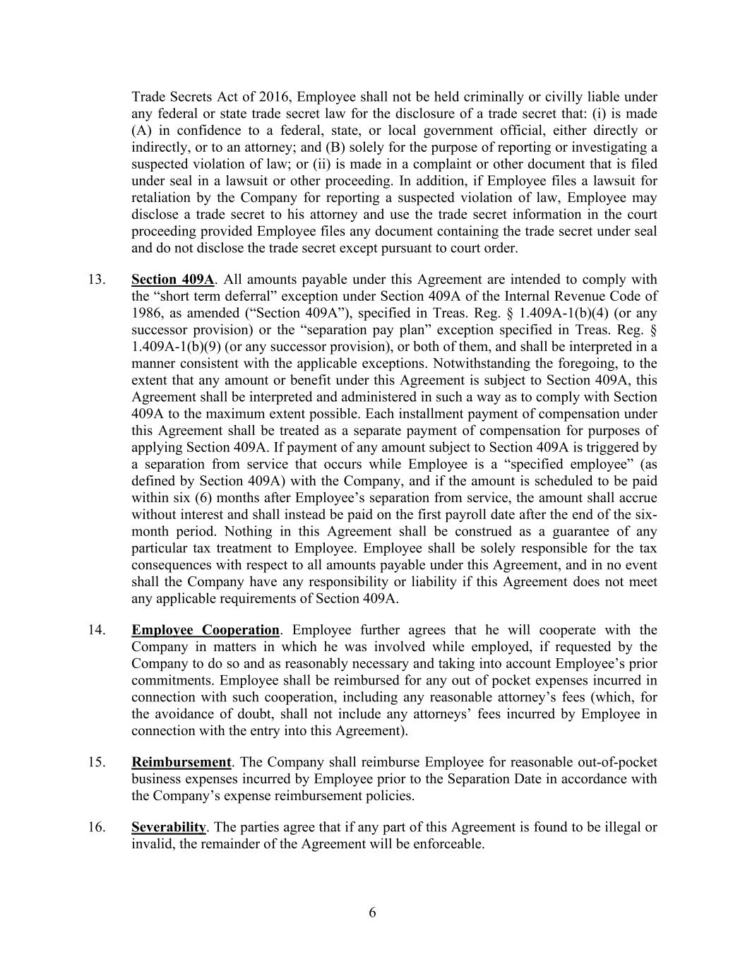 6 Trade Secrets Act of 2016, Employee shall not be held criminally or civilly liable under any federal or state trade secret law for the disclosure of a trade secret that: (i) is made (A) in confidence to a federal, state, or local government official, either directly or indirectly, or to an attorney; and (B) solely for the purpose of reporting or investigating a suspected violation of law; or (ii) is made in a complaint or other document that is filed under seal in a lawsuit or other proceeding. In addition, if Employee files a lawsuit for retaliation by the Company for reporting a suspected violation of law, Employee may disclose a trade secret to his attorney and use the trade secret information in the court proceeding provided Employee files any document containing the trade secret under seal and do not disclose the trade secret except pursuant to court order. 13. Section 409A. All amounts payable under this Agreement are intended to comply with the “short term deferral” exception under Section 409A of the Internal Revenue Code of 1986, as amended (“Section 409A”), specified in Treas. Reg. § 1.409A-1(b)(4) (or any successor provision) or the “separation pay plan” exception specified in Treas. Reg. § 1.409A-1(b)(9) (or any successor provision), or both of them, and shall be interpreted in a manner consistent with the applicable exceptions. Notwithstanding the foregoing, to the extent that any amount or benefit under this Agreement is subject to Section 409A, this Agreement shall be interpreted and administered in such a way as to comply with Section 409A to the maximum extent possible. Each installment payment of compensation under this Agreement shall be treated as a separate payment of compensation for purposes of applying Section 409A. If payment of any amount subject to Section 409A is triggered by a separation from service that occurs while Employee is a “specified employee” (as defined by Section 409A) with the Company, and if the amount is scheduled to be paid within six (6) months after Employee’s separation from service, the amount shall accrue without interest and shall instead be paid on the first payroll date after the end of the six- month period. Nothing in this Agreement shall be construed as a guarantee of any particular tax treatment to Employee. Employee shall be solely responsible for the tax consequences with respect to all amounts payable under this Agreement, and in no event shall the Company have any responsibility or liability if this Agreement does not meet any applicable requirements of Section 409A. 14. Employee Cooperation. Employee further agrees that he will cooperate with the Company in matters in which he was involved while employed, if requested by the Company to do so and as reasonably necessary and taking into account Employee’s prior commitments. Employee shall be reimbursed for any out of pocket expenses incurred in connection with such cooperation, including any reasonable attorney’s fees (which, for the avoidance of doubt, shall not include any attorneys’ fees incurred by Employee in connection with the entry into this Agreement). 15. Reimbursement. The Company shall reimburse Employee for reasonable out-of-pocket business expenses incurred by Employee prior to the Separation Date in accordance with the Company’s expense reimbursement policies. 16. Severability. The parties agree that if any part of this Agreement is found to be illegal or invalid, the remainder of the Agreement will be enforceable.
