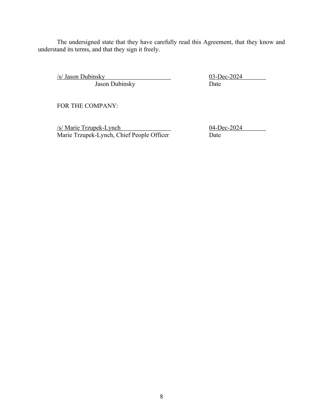 8 The undersigned state that they have carefully read this Agreement, that they know and understand its terms, and that they sign it freely. /s/ Jason Dubinsky 03-Dec-2024 Jason Dubinsky Date FOR THE COMPANY: /s/ Marie Trzupek-Lynch 04-Dec-2024 Marie Trzupek-Lynch, Chief People Officer Date