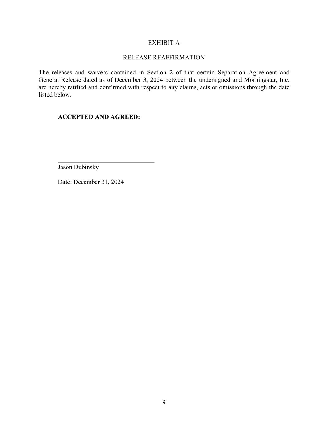 9 EXHIBIT A RELEASE REAFFIRMATION The releases and waivers contained in Section 2 of that certain Separation Agreement and General Release dated as of December 3, 2024 between the undersigned and Morningstar, Inc. are hereby ratified and confirmed with respect to any claims, acts or omissions through the date listed below. ACCEPTED AND AGREED: Jason Dubinsky Date: December 31, 2024