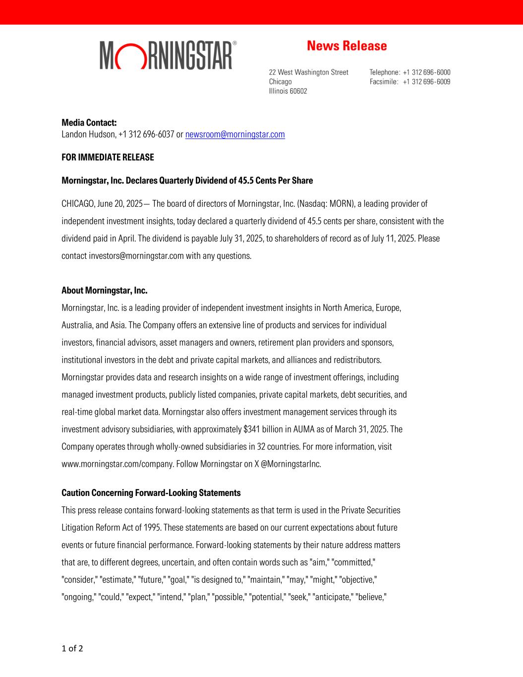 1 of 2 Media Contact: Landon Hudson, +1 312 696-6037 or newsroom@morningstar.com FOR IMMEDIATE RELEASE Morningstar, Inc. Declares Quarterly Dividend of 45.5 Cents Per Share CHICAGO, June 20, 2025— The board of directors of Morningstar, Inc. (Nasdaq: MORN), a leading provider of independent investment insights, today declared a quarterly dividend of 45.5 cents per share, consistent with the dividend paid in April. The dividend is payable July 31, 2025, to shareholders of record as of July 11, 2025. Please contact investors@morningstar.com with any questions. About Morningstar, Inc. Morningstar, Inc. is a leading provider of independent investment insights in North America, Europe, Australia, and Asia. The Company offers an extensive line of products and services for individual investors, financial advisors, asset managers and owners, retirement plan providers and sponsors, institutional investors in the debt and private capital markets, and alliances and redistributors. Morningstar provides data and research insights on a wide range of investment offerings, including managed investment products, publicly listed companies, private capital markets, debt securities, and real-time global market data. Morningstar also offers investment management services through its investment advisory subsidiaries, with approximately $341 billion in AUMA as of March 31, 2025. The Company operates through wholly-owned subsidiaries in 32 countries. For more information, visit www.morningstar.com/company. Follow Morningstar on X @MorningstarInc. Caution Concerning Forward-Looking Statements This press release contains forward-looking statements as that term is used in the Private Securities Litigation Reform Act of 1995. These statements are based on our current expectations about future events or future financial performance. Forward-looking statements by their nature address matters that are, to different degrees, uncertain, and often contain words such as "aim," "committed," "consider," "estimate," "future," "goal," "is designed to," "maintain," "may," "might," "objective," "ongoing," "could," "expect," "intend," "plan," "possible," "potential," "seek," "anticipate," "believe,"