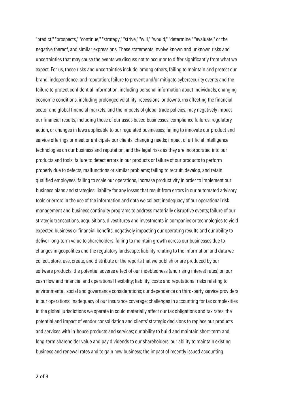 2 of 3 "predict," "prospects," "continue," "strategy," "strive," "will," "would," "determine," "evaluate," or the negative thereof, and similar expressions. These statements involve known and unknown risks and uncertainties that may cause the events we discuss not to occur or to differ significantly from what we expect. For us, these risks and uncertainties include, among others, failing to maintain and protect our brand, independence, and reputation; failure to prevent and/or mitigate cybersecurity events and the failure to protect confidential information, including personal information about individuals; changing economic conditions, including prolonged volatility, recessions, or downturns affecting the financial sector and global financial markets, and the impacts of global trade policies, may negatively impact our financial results, including those of our asset-based businesses; compliance failures, regulatory action, or changes in laws applicable to our regulated businesses; failing to innovate our product and service offerings or meet or anticipate our clients’ changing needs; impact of artificial intelligence technologies on our business and reputation, and the legal risks as they are incorporated into our products and tools; failure to detect errors in our products or failure of our products to perform properly due to defects, malfunctions or similar problems; failing to recruit, develop, and retain qualified employees; failing to scale our operations, increase productivity in order to implement our business plans and strategies; liability for any losses that result from errors in our automated advisory tools or errors in the use of the information and data we collect; inadequacy of our operational risk management and business continuity programs to address materially disruptive events; failure of our strategic transactions, acquisitions, divestitures and investments in companies or technologies to yield expected business or financial benefits, negatively impacting our operating results and our ability to deliver long-term value to shareholders; failing to maintain growth across our businesses due to changes in geopolitics and the regulatory landscape; liability relating to the information and data we collect, store, use, create, and distribute or the reports that we publish or are produced by our software products; the potential adverse effect of our indebtedness (and rising interest rates) on our cash flow and financial and operational flexibility; liability, costs and reputational risks relating to environmental, social and governance considerations; our dependence on third-party service providers in our operations; inadequacy of our insurance coverage; challenges in accounting for tax complexities in the global jurisdictions we operate in could materially affect our tax obligations and tax rates; the potential and impact of vendor consolidation and clients' strategic decisions to replace our products and services with in-house products and services; our ability to build and maintain short-term and long-term shareholder value and pay dividends to our shareholders; our ability to maintain existing business and renewal rates and to gain new business; the impact of recently issued accounting