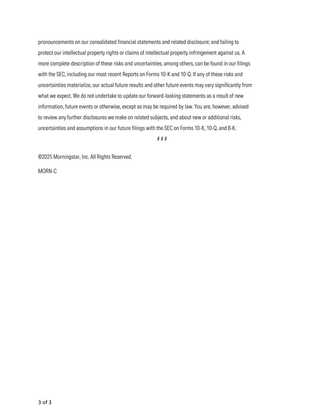 3 of 3 pronouncements on our consolidated financial statements and related disclosure; and failing to protect our intellectual property rights or claims of intellectual property infringement against us. A more complete description of these risks and uncertainties, among others, can be found in our filings with the SEC, including our most recent Reports on Forms 10-K and 10-Q. If any of these risks and uncertainties materialize, our actual future results and other future events may vary significantly from what we expect. We do not undertake to update our forward-looking statements as a result of new information, future events or otherwise, except as may be required by law. You are, however, advised to review any further disclosures we make on related subjects, and about new or additional risks, uncertainties and assumptions in our future filings with the SEC on Forms 10-K, 10-Q, and 8-K. # # # ©2025 Morningstar, Inc. All Rights Reserved. MORN-C