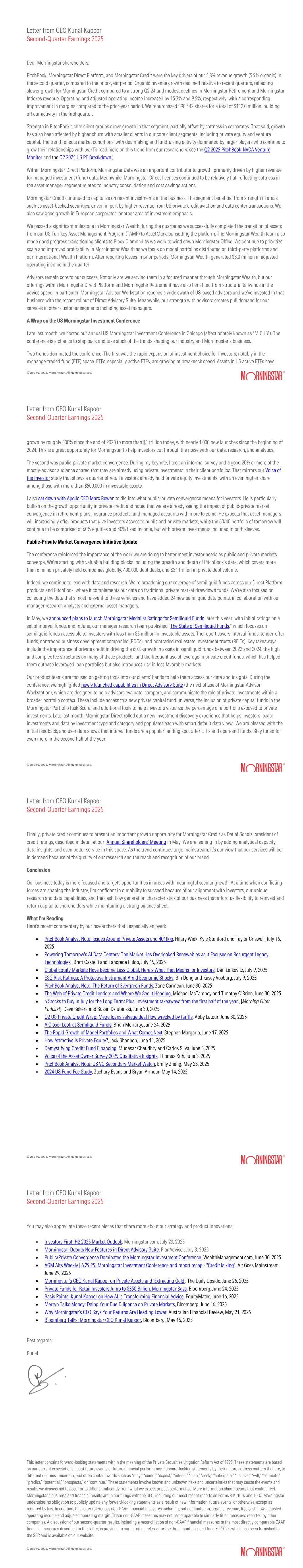 © July 30, 2025. Morningstar. All Rights Reserved. Letter from CEO Kunal Kapoor Second-Quarter Earnings 2025 Dear Morningstar shareholders, PitchBook, Morningstar Direct Platform, and Morningstar Credit were the key drivers of our 5.8% revenue growth (5.9% organic) in the second quarter, compared to the prior-year period. Organic revenue growth declined relative to recent quarters, reflecting slower growth for Morningstar Credit compared to a strong Q2 24 and modest declines in Morningstar Retirement and Morningstar Indexes revenue. Operating and adjusted operating income increased by 15.3% and 9.5%, respectively, with a corresponding improvement in margins compared to the prior-year period. We repurchased 398,442 shares for a total of $112.0 million, building off our activity in the first quarter. Strength in PitchBook’s core client groups drove growth in that segment, partially offset by softness in corporates. That said, growth has also been affected by higher churn with smaller clients in our core client segments, including private equity and venture capital. The trend reflects market conditions, with dealmaking and fundraising activity dominated by larger players who continue to grow their relationships with us. (To read more on this trend from our researchers, see the Q2 2025 PitchBook-NVCA Venture Monitor and the Q2 2025 US PE Breakdown.) Within Morningstar Direct Platform, Morningstar Data was an important contributor to growth, primarily driven by higher revenue for managed investment (fund) data. Meanwhile, Morningstar Direct licenses continued to be relatively flat, reflecting softness in the asset manager segment related to industry consolidation and cost savings actions. Morningstar Credit continued to capitalize on recent investments in the business. The segment benefited from strength in areas such as asset-backed securities, driven in part by higher revenue from US private credit aviation and data center transactions. We also saw good growth in European corporates, another area of investment emphasis. We passed a significant milestone in Morningstar Wealth during the quarter as we successfully completed the transition of assets from our US Turnkey Asset Management Program (TAMP) to AssetMark, sunsetting the platform. The Morningstar Wealth team also made good progress transitioning clients to Black Diamond as we work to wind down Morningstar Office. We continue to prioritize scale and improved profitability in Morningstar Wealth as we focus on model portfolios distributed on third-party platforms and our International Wealth Platform. After reporting losses in prior periods, Morningstar Wealth generated $3.0 million in adjusted operating income in the quarter. Advisors remain core to our success. Not only are we serving them in a focused manner through Morningstar Wealth, but our offerings within Morningstar Direct Platform and Morningstar Retirement have also benefited from structural tailwinds in the advice space. In particular, Morningstar Advisor Workstation reaches a wide swath of US-based advisors and we’ve invested in that business with the recent rollout of Direct Advisory Suite. Meanwhile, our strength with advisors creates pull demand for our services in other customer segments including asset managers. A Wrap on the US Morningstar Investment Conference Late last month, we hosted our annual US Morningstar Investment Conference in Chicago (affectionately known as “MICUS”). The conference is a chance to step back and take stock of the trends shaping our industry and Morningstar’s business. Two trends dominated the conference. The first was the rapid expansion of investment choice for investors, notably in the exchange-traded fund (ETF) space. ETFs, especially active ETFs, are growing at breakneck speed. Assets in US active ETFs have Letter from CEO Kunal Kapoor Second-Quarter Earnings 2025 © July 30, 2025. Morningstar. All Rights Reserved. grown by roughly 500% since the end of 2020 to more than $1 trillion today, with nearly 1,000 new launches since the beginning of 2024. This is a great opportunity for Morningstar to help investors cut through the noise with our data, research, and analytics. The second was public-private market convergence. During my keynote, I took an informal survey and a good 20% or more of the mostly-advisor audience shared that they are already using private investments in their client portfolios. That mirrors our Voice of the Investor study that shows a quarter of retail investors already hold private equity investments, with an even higher share among those with more than $500,000 in investable assets. I also sat down with Apollo CEO Marc Rowan to dig into what public-private convergence means for investors. He is particularly bullish on the growth opportunity in private credit and noted that we are already seeing the impact of public-private market convergence in retirement plans, insurance products, and managed accounts with more to come. He expects that asset managers will increasingly offer products that give investors access to public and private markets, while the 60/40 portfolio of tomorrow will continue to be comprised of 60% equities and 40% fixed income, but with private investments included in both sleeves. Public-Private Market Convergence Initiative Update The conference reinforced the importance of the work we are doing to better meet investor needs as public and private markets converge. We’re starting with valuable building blocks including the breadth and depth of PitchBook’s data, which covers more than 6 million privately held companies globally, 400,000 debt deals, and $31 trillion in private debt volume. Indeed, we continue to lead with data and research. We’re broadening our coverage of semiliquid funds across our Direct Platform products and PitchBook, where it complements our data on traditional private market drawdown funds. We’re also focused on collecting the data that’s most relevant to t
