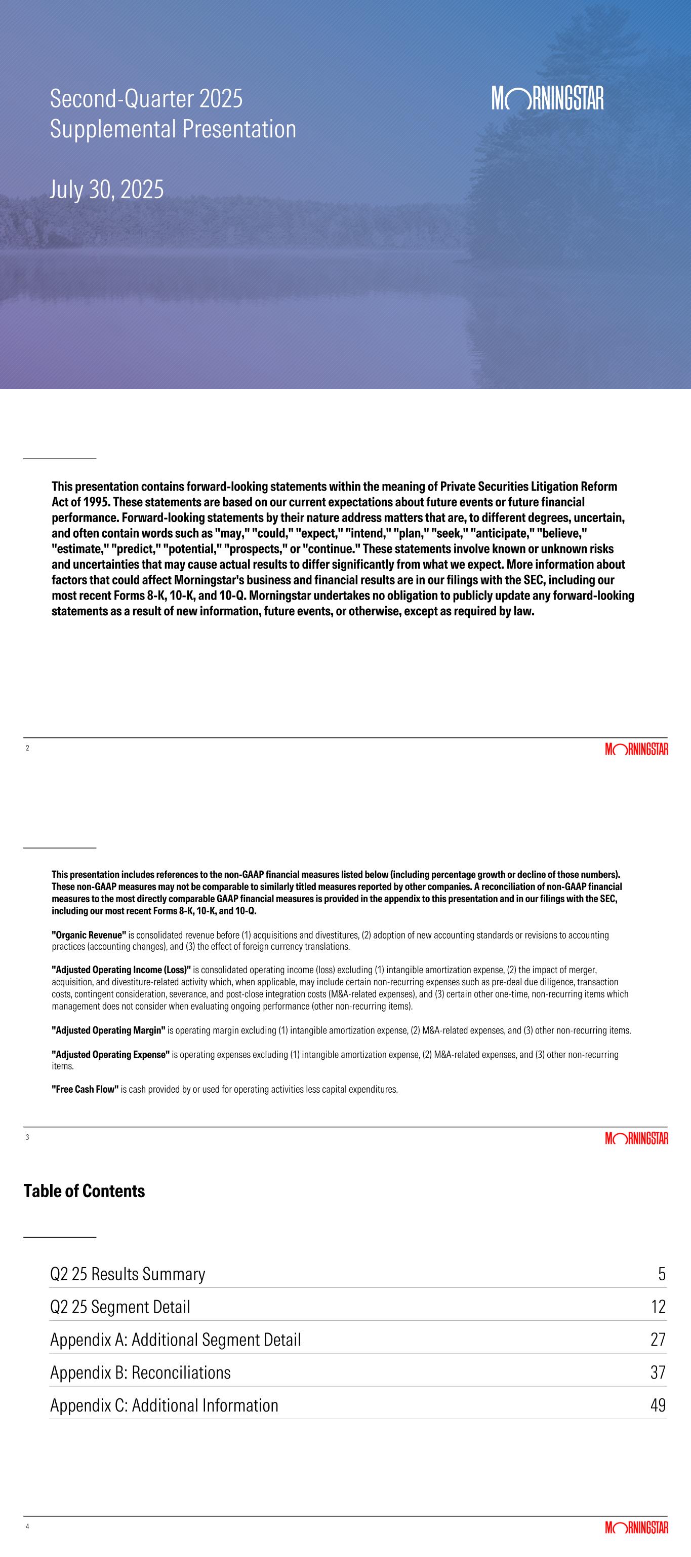 Second-Quarter 2025 Supplemental Presentation July 30, 2025 2 This presentation contains forward-looking statements within the meaning of Private Securities Litigation Reform Act of 1995. These statements are based on our current expectations about future events or future financial performance. Forward-looking statements by their nature address matters that are, to different degrees, uncertain, and often contain words such as "may," "could," "expect," "intend," "plan," "seek," "anticipate," "believe," "estimate," "predict," "potential," "prospects," or "continue." These statements involve known or unknown risks and uncertainties that may cause actual results to differ significantly from what we expect. More information about factors that could affect Morningstar's business and financial results are in our filings with the SEC, including our most recent Forms 8-K, 10-K, and 10-Q. Morningstar undertakes no obligation to publicly update any forward-looking statements as a result of new information, future events, or otherwise, except as required by law. 3 This presentation includes references to the non-GAAP financial measures listed below (including percentage growth or decline of those numbers). These non-GAAP measures may not be comparable to similarly titled measures reported by other companies. A reconciliation of non-GAAP financial measures to the most directly comparable GAAP financial measures is provided in the appendix to this presentation and in our filings with the SEC, including our most recent Forms 8-K, 10-K, and 10-Q. "Organic Revenue" is consolidated revenue before (1) acquisitions and divestitures, (2) adoption of new accounting standards or revisions to accounting practices (accounting changes), and (3) the effect of foreign currency translations. "Adjusted Operating Income (Loss)" is consolidated operating income (loss) excluding (1) intangible amortization expense, (2) the impact of merger, acquisition, and divestiture-related activity which, when applicable, may include certain non-recurring expenses such as pre-deal due diligence, transaction costs, contingent consideration, severance, and post-close integration costs (M&A-related expenses), and (3) certain other one-time, non-recurring items which management does not consider when evaluating ongoing performance (other non-recurring items). "Adjusted Operating Margin" is operating margin excluding (1) intangible amortization expense, (2) M&A-related expenses, and (3) other non-recurring items. "Adjusted Operating Expense" is operating expenses excluding (1) intangible amortization expense, (2) M&A-related expenses, and (3) other non-recurring items. "Free Cash Flow" is cash provided by or used for operating activities less capital expenditures. 4 Table of Contents Q2 25 Results Summary 5 Q2 25 Segment Detail 12 Appendix A: Additional Segment Detail 27 Appendix B: Reconciliations 37 Appendix C: Additional Information 49