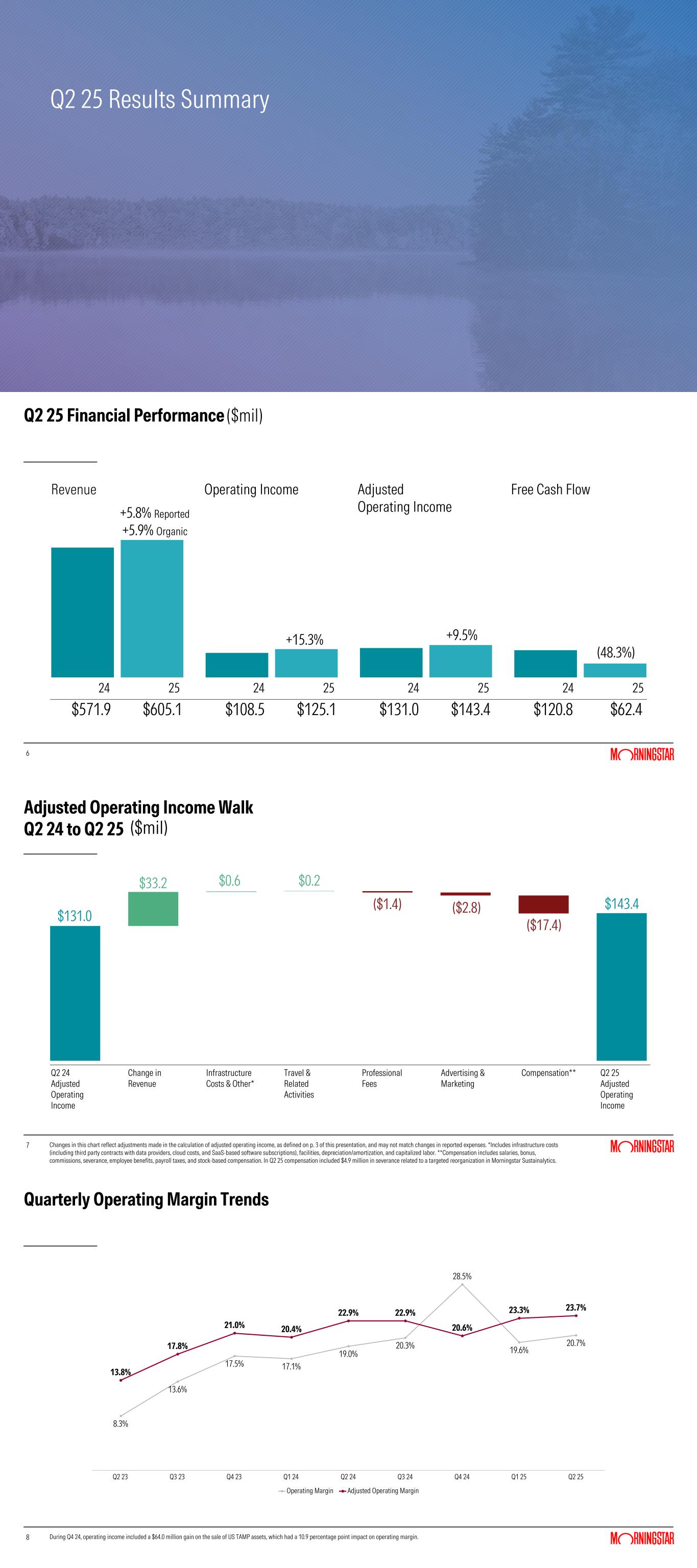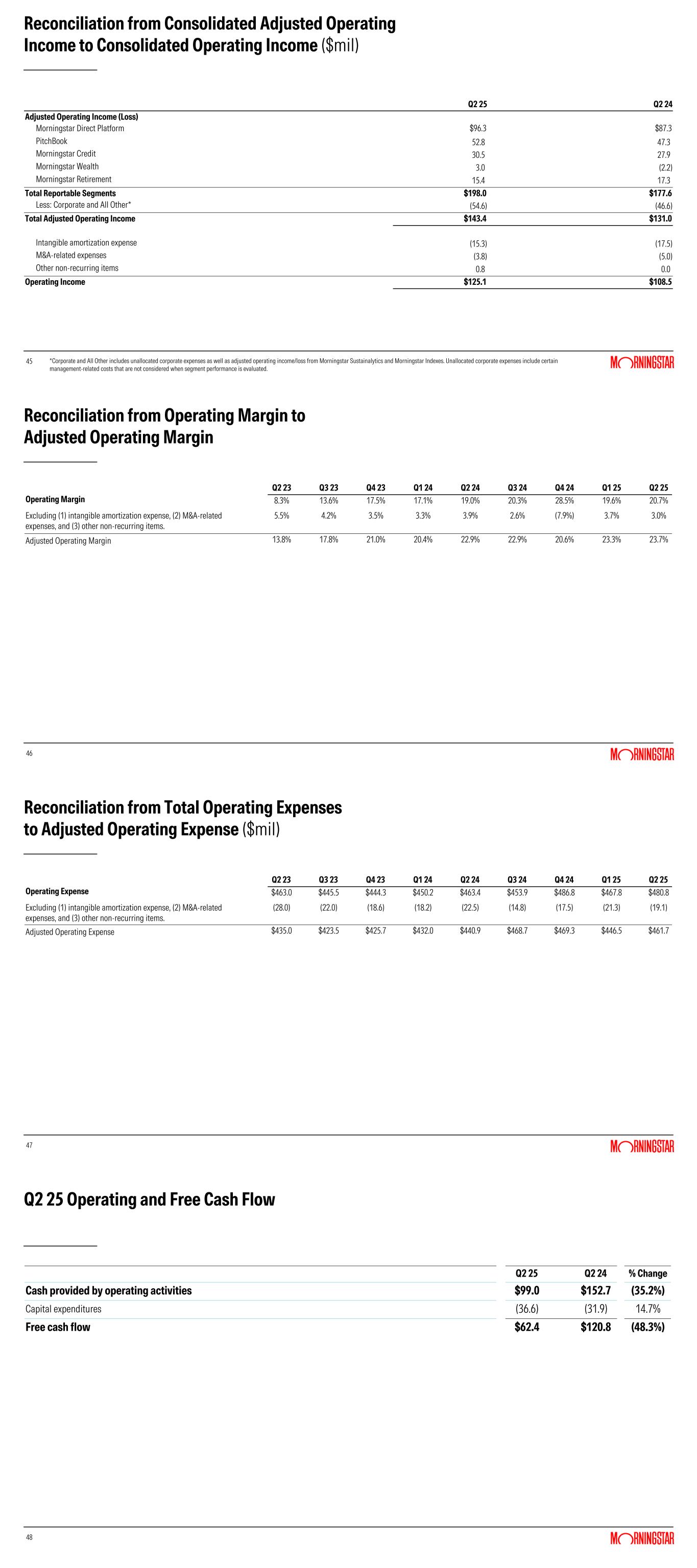 45 Reconciliation from Consolidated Adjusted Operating Income to Consolidated Operating Income ($mil) *Corporate and All Other includes unallocated corporate expenses as well as adjusted operating income/loss from Morningstar Sustainalytics and Morningstar Indexes. Unallocated corporate expenses include certain management-related costs that are not considered when segment performance is evaluated. Q2 25 Q2 24 Adjusted Operating Income (Loss) Morningstar Direct Platform $96.3 $87.3 PitchBook 52.8 47.3 Morningstar Credit 30.5 27.9 Morningstar Wealth 3.0 (2.2) Morningstar Retirement 15.4 17.3 Total Reportable Segments $198.0 $177.6 Less: Corporate and All Other* (54.6) (46.6) Total Adjusted Operating Income $143.4 $131.0 Intangible amortization expense (15.3) (17.5) M&A-related expenses (3.8) (5.0) Other non-recurring items 0.8 0.0 Operating Income $125.1 $108.5 46 Reconciliation from Operating Margin to Adjusted Operating Margin Q2 23 Q3 23 Q4 23 Q1 24 Q2 24 Q3 24 Q4 24 Q1 25 Q2 25 Operating Margin 8.3% 13.6% 17.5% 17.1% 19.0% 20.3% 28.5% 19.6% 20.7% Excluding (1) intangible amortization expense, (2) M&A-related expenses, and (3) other non-recurring items. 5.5% 4.2% 3.5% 3.3% 3.9% 2.6% (7.9%) 3.7% 3.0% Adjusted Operating Margin 13.8% 17.8% 21.0% 20.4% 22.9% 22.9% 20.6% 23.3% 23.7% 47 Reconciliation from Total Operating Expenses to Adjusted Operating Expense ($mil) Q2 23 Q3 23 Q4 23 Q1 24 Q2 24 Q3 24 Q4 24 Q1 25 Q2 25 Operating Expense $463.0 $445.5 $444.3 $450.2 $463.4 $453.9 $486.8 $467.8 $480.8 Excluding (1) intangible amortization expense, (2) M&A-related expenses, and (3) other non-recurring items. (28.0) (22.0) (18.6) (18.2) (22.5) (14.8) (17.5) (21.3) (19.1) Adjusted Operating Expense $435.0 $423.5 $425.7 $432.0 $440.9 $468.7 $469.3 $446.5 $461.7 48 Q2 25 Operating and Free Cash Flow Q2 25 Q2 24 % Change Cash provided by operating activities $99.0 $152.7 (35.2%) Capital expenditures (36.6) (31.9) 14.7% Free cash flow $62.4 $120.8 (48.3%)