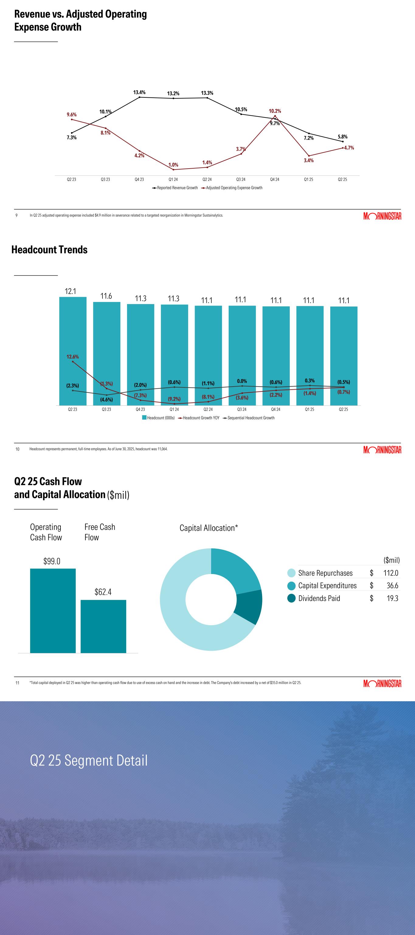 9 Revenue vs. Adjusted Operating Expense Growth 7.3% 10.1% 13.4% 13.2% 13.3% 10.5% 9.7% 7.2% 5.8% 9.6% 8.1% 4.2% 1.0% 1.4% 3.7% 10.2% 3.4% 4.7% Reported Revenue Growth Adjusted Operating Expense Growth Q2 23 Q3 23 Q4 23 Q1 24 Q2 24 Q3 24 Q4 24 Q1 25 Q2 25 In Q2 25 adjusted operating expense included $4.9 million in severance related to a targeted reorganization in Morningstar Sustainalytics. 10 Headcount Trends Headcount represents permanent, full-time employees. As of June 30, 2025, headcount was 11,064. 12.6% (1.3%) (7.3%) (9.2%) (8.1%) (3.6%) (2.2%) (1.4%) (0.7%) (2.3%) (4.6%) (2.0%) (0.6%) (1.1%) 0.0% (0.6%) 0.3% (0.5%) Headcount (000s) Headcount Growth YOY Sequential Headcount Growth Q2 23 Q3 23 Q4 23 Q1 24 Q2 24 Q3 24 Q4 24 Q1 25 Q2 25 12.1 11.6 11.3 11.3 11.1 11.1 11.1 11.1 11.1 11 Q2 25 Cash Flow and Capital Allocation 11 ($mil) Operating Cash Flow Free Cash Flow ($mil) Share Repurchases $ 112.0 Capital Expenditures $ 36.6 Dividends Paid $ 19.3 *Total capital deployed in Q2 25 was higher than operating cash flow due to use of excess cash on hand and the increase in debt. The Company's debt increased by a net of $35.0 million in Q2 25. Capital Allocation* $99.0 $62.4 Q2 25 Segment Detail