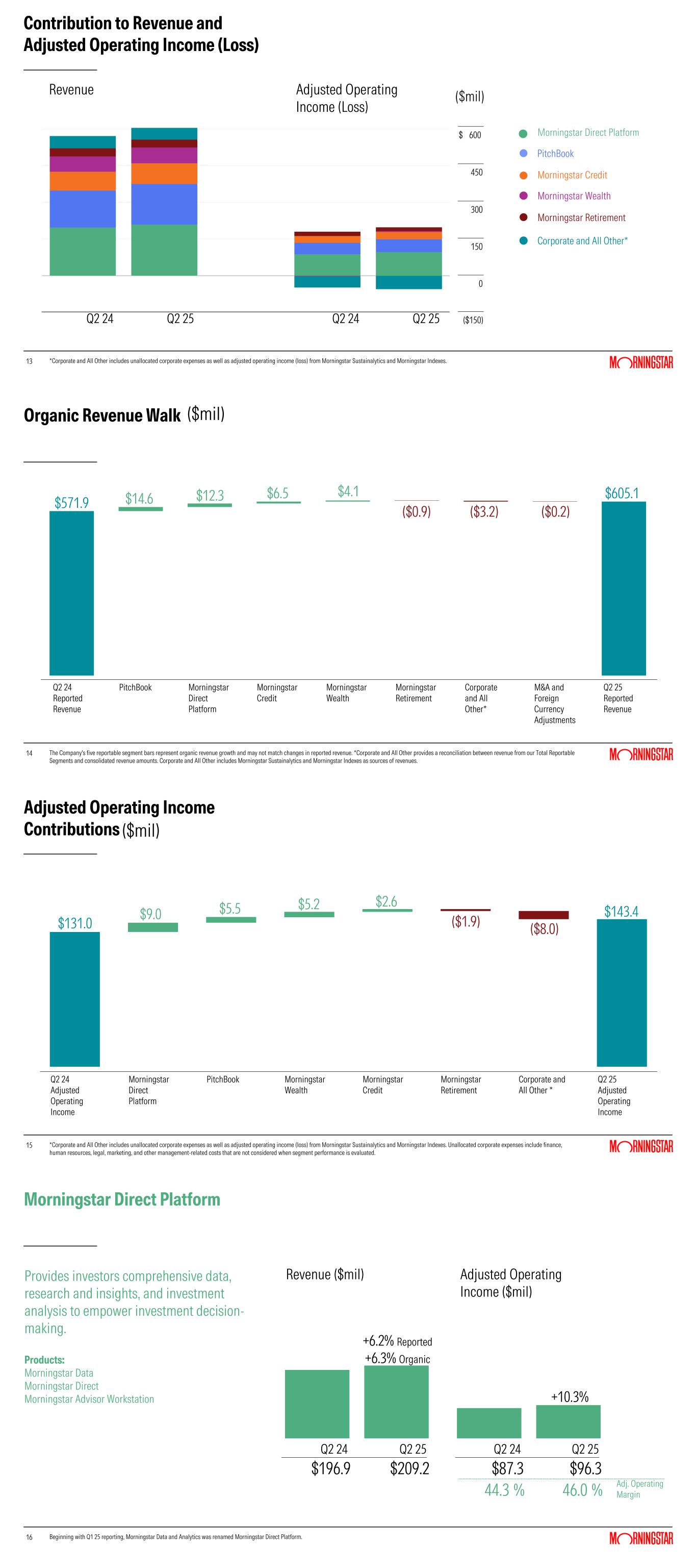 13 Contribution to Revenue and Adjusted Operating Income (Loss) 13 Morningstar Direct Platform Revenue Adjusted Operating Income (Loss) *Corporate and All Other includes unallocated corporate expenses as well as adjusted operating income (loss) from Morningstar Sustainalytics and Morningstar Indexes. Q2 24 Q2 25 Q2 24 Q2 25 $ 600 450 300 150 0 ($150) PitchBook Morningstar Credit Morningstar Wealth Morningstar Retirement Corporate and All Other* ($mil) 14 Organic Revenue Walk Q2 24 Reported Revenue PitchBook Morningstar Direct Platform Morningstar Credit Morningstar Wealth Morningstar Retirement Corporate and All Other* M&A and Foreign Currency Adjustments Q2 25 Reported Revenue ($mil) The Company's five reportable segment bars represent organic revenue growth and may not match changes in reported revenue. *Corporate and All Other provides a reconciliation between revenue from our Total Reportable Segments and consolidated revenue amounts. Corporate and All Other includes Morningstar Sustainalytics and Morningstar Indexes as sources of revenues. $571.9 $6.5$14.6 $12.3 ($0.9) $4.1 ($3.2) ($0.2) $605.1 15 Adjusted Operating Income Contributions Q2 24 Adjusted Operating Income Morningstar Direct Platform PitchBook Morningstar Wealth Morningstar Credit Morningstar Retirement Corporate and All Other * Q2 25 Adjusted Operating Income *Corporate and All Other includes unallocated corporate expenses as well as adjusted operating income (loss) from Morningstar Sustainalytics and Morningstar Indexes. Unallocated corporate expenses include finance, human resources, legal, marketing, and other management-related costs that are not considered when segment performance is evaluated. ($mil) $131.0 $5.5 $2.6$5.2 ($1.9)$9.0 ($8.0) $143.4 16 Morningstar Direct Platform 16 +6.2% Reported +6.3% Organic +10.3% $196.9 $209.2 $87.3 $96.3 44.3 % 46.0 % Adj. Operating Margin Revenue ($mil) Adjusted Operating Income ($mil) Beginning with Q1 25 reporting, Morningstar Data and Analytics was renamed Morningstar Direct Platform. Q2 24 Q2 25 Q2 24 Q2 25 Provides investors comprehensive data, research and insights, and investment analysis to empower investment decision- making. Products: Morningstar Data Morningstar Direct Morningstar Advisor Workstation