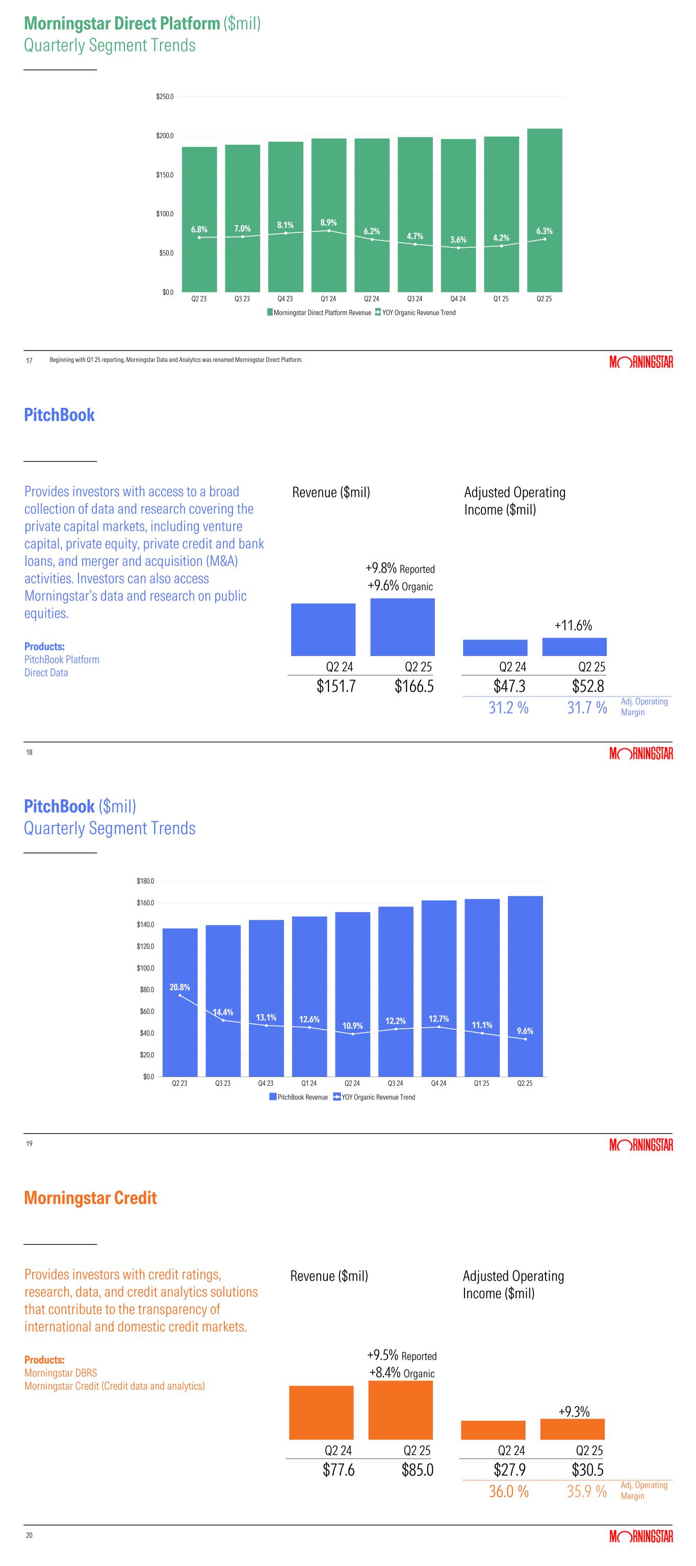 17 Morningstar Direct Platform ($mil) Quarterly Segment Trends 17 Beginning with Q1 25 reporting, Morningstar Data and Analytics was renamed Morningstar Direct Platform. 6.8% 7.0% 8.1% 8.9% 6.2% 4.7% 3.6% 4.2% 6.3% Morningstar Direct Platform Revenue YOY Organic Revenue Trend Q2 23 Q3 23 Q4 23 Q1 24 Q2 24 Q3 24 Q4 24 Q1 25 Q2 25 $0.0 $50.0 $100.0 $150.0 $200.0 $250.0 18 PitchBook 18 +9.8% Reported +9.6% Organic +11.6% $151.7 $166.5 $47.3 $52.8 31.2 % 31.7 % Adj. Operating Margin Revenue ($mil) Adjusted Operating Income ($mil) Q2 24 Q2 25 Q2 24 Q2 25 Provides investors with access to a broad collection of data and research covering the private capital markets, including venture capital, private equity, private credit and bank loans, and merger and acquisition (M&A) activities. Investors can also access Morningstar’s data and research on public equities. Products: PitchBook Platform Direct Data 19 PitchBook ($mil) Quarterly Segment Trends 19 20.8% 14.4% 13.1% 12.6% 10.9% 12.2% 12.7% 11.1% 9.6% PitchBook Revenue YOY Organic Revenue Trend Q2 23 Q3 23 Q4 23 Q1 24 Q2 24 Q3 24 Q4 24 Q1 25 Q2 25 $0.0 $20.0 $40.0 $60.0 $80.0 $100.0 $120.0 $140.0 $160.0 $180.0 20 Morningstar Credit 20 +9.5% Reported +8.4% Organic +9.3% $77.6 $85.0 $27.9 $30.5 36.0 % 35.9 % Adj. Operating Margin Revenue ($mil) Adjusted Operating Income ($mil) Q2 24 Q2 25 Q2 24 Q2 25 Provides investors with credit ratings, research, data, and credit analytics solutions that contribute to the transparency of international and domestic credit markets. Products: Morningstar DBRS Morningstar Credit (Credit data and analytics)