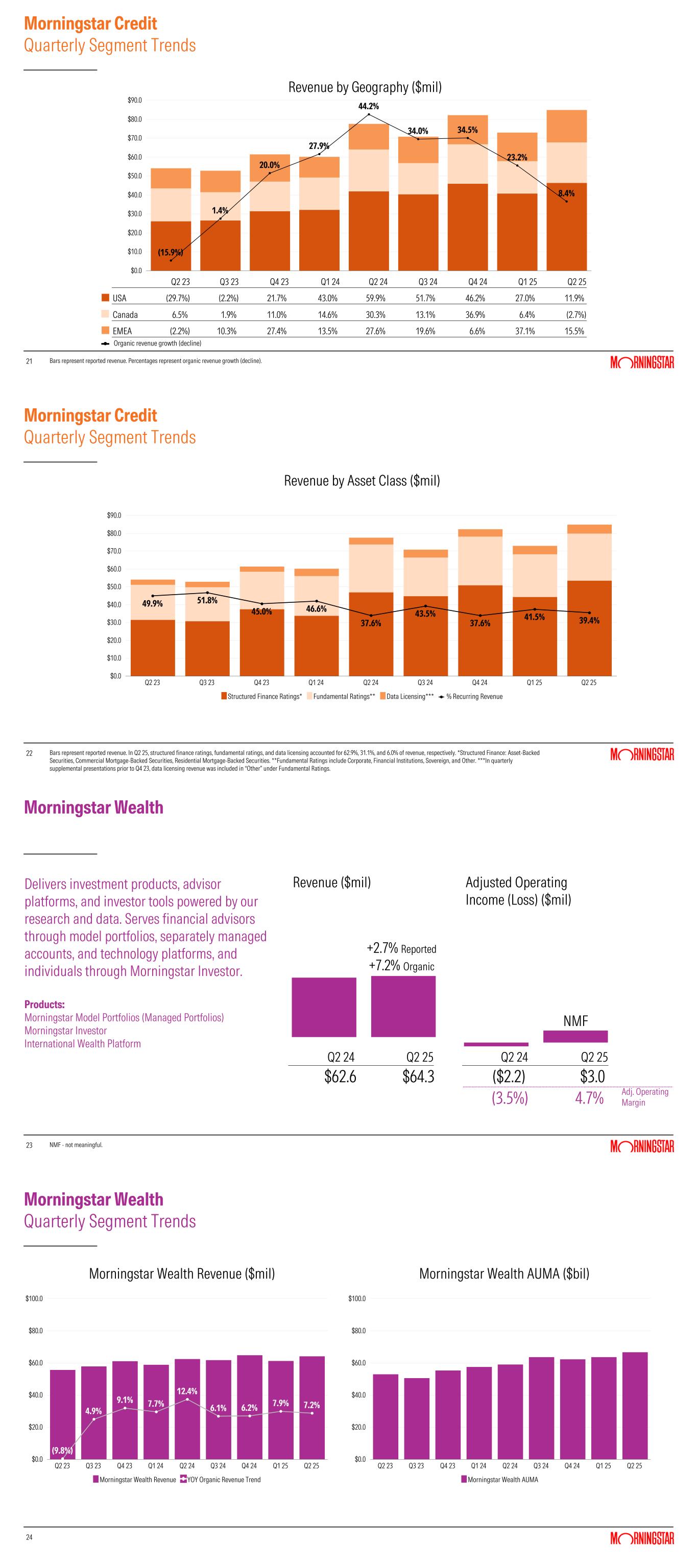 21 Morningstar Credit Quarterly Segment Trends 21 Bars represent reported revenue. Percentages represent organic revenue growth (decline). (15.9%) 1.4% 20.0% 27.9% 44.2% 34.0% 34.5% 23.2% 8.4% $0.0 $10.0 $20.0 $30.0 $40.0 $50.0 $60.0 $70.0 $80.0 $90.0 Revenue by Geography ($mil) Q2 23 Q3 23 Q4 23 Q1 24 Q2 24 Q3 24 Q4 24 Q1 25 Q2 25 USA (29.7%) (2.2%) 21.7% 43.0% 59.9% 51.7% 46.2% 27.0% 11.9% Canada 6.5% 1.9% 11.0% 14.6% 30.3% 13.1% 36.9% 6.4% (2.7%) EMEA (2.2%) 10.3% 27.4% 13.5% 27.6% 19.6% 6.6% 37.1% 15.5% Organic revenue growth (decline) 22 Morningstar Credit Quarterly Segment Trends 22 Bars represent reported revenue. In Q2 25, structured finance ratings, fundamental ratings, and data licensing accounted for 62.9%, 31.1%, and 6.0% of revenue, respectively. *Structured Finance: Asset-Backed Securities, Commercial Mortgage-Backed Securities, Residential Mortgage-Backed Securities. **Fundamental Ratings include Corporate, Financial Institutions, Sovereign, and Other. ***In quarterly supplemental presentations prior to Q4 23, data licensing revenue was included in “Other” under Fundamental Ratings. 49.9% 51.8% 45.0% 46.6% 37.6% 43.5% 37.6% 41.5% 39.4% Structured Finance Ratings* Fundamental Ratings** Data Licensing*** % Recurring Revenue Q2 23 Q3 23 Q4 23 Q1 24 Q2 24 Q3 24 Q4 24 Q1 25 Q2 25 $0.0 $10.0 $20.0 $30.0 $40.0 $50.0 $60.0 $70.0 $80.0 $90.0 Revenue by Asset Class ($mil) 23 Morningstar Wealth 23 +2.7% Reported +7.2% Organic NMF $62.6 $64.3 ($2.2) $3.0 (3.5%) 4.7% Adj. Operating Margin Revenue ($mil) Adjusted Operating Income (Loss) ($mil) NMF - not meaningful. Q2 24 Q2 25 Q2 24 Q2 25 Delivers investment products, advisor platforms, and investor tools powered by our research and data. Serves financial advisors through model portfolios, separately managed accounts, and technology platforms, and individuals through Morningstar Investor. Products: Morningstar Model Portfolios (Managed Portfolios) Morningstar Investor International Wealth Platform 24 Morningstar Wealth Quarterly Segment Trends 24 (9.8%) 4.9% 9.1% 7.7% 12.4% 6.1% 6.2% 7.9% 7.2% Morningstar Wealth Revenue YOY Organic Revenue Trend Q2 23 Q3 23 Q4 23 Q1 24 Q2 24 Q3 24 Q4 24 Q1 25 Q2 25 $0.0 $20.0 $40.0 $60.0 $80.0 $100.0 Morningstar Wealth AUMA Q2 23 Q3 23 Q4 23 Q1 24 Q2 24 Q3 24 Q4 24 Q1 25 Q2 25 $0.0 $20.0 $40.0 $60.0 $80.0 $100.0 Morningstar Wealth Revenue ($mil) Morningstar Wealth AUMA ($bil)