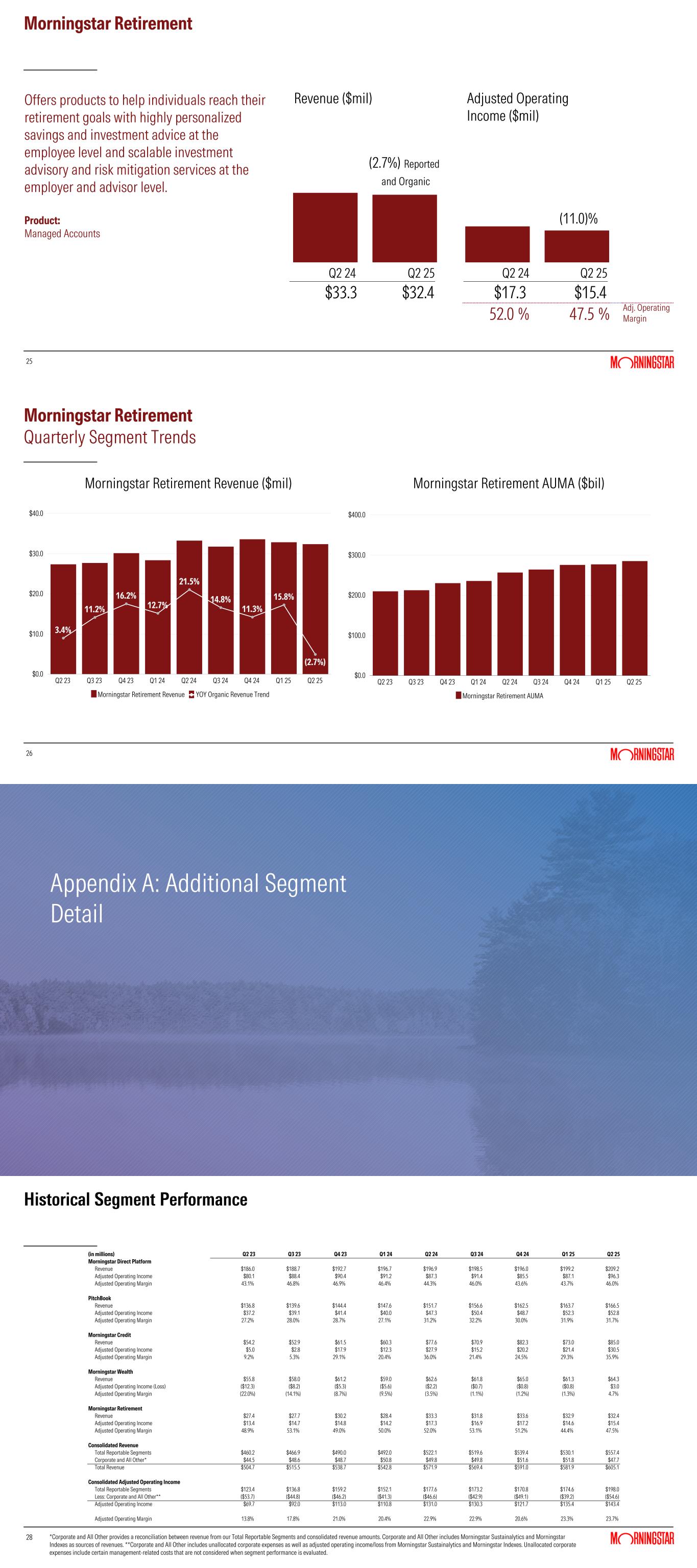 25 Morningstar Retirement 25 (2.7%) Reported and Organic (11.0)% $33.3 $32.4 $17.3 $15.4 52.0 % 47.5 % Adj. Operating Margin Revenue ($mil) Adjusted Operating Income ($mil) Q2 24 Q2 25 Q2 24 Q2 25 Offers products to help individuals reach their retirement goals with highly personalized savings and investment advice at the employee level and scalable investment advisory and risk mitigation services at the employer and advisor level. Product: Managed Accounts 26 Morningstar Retirement Quarterly Segment Trends 26 3.4% 11.2% 16.2% 12.7% 21.5% 14.8% 11.3% 15.8% (2.7%) Morningstar Retirement Revenue YOY Organic Revenue Trend Q2 23 Q3 23 Q4 23 Q1 24 Q2 24 Q3 24 Q4 24 Q1 25 Q2 25 $0.0 $10.0 $20.0 $30.0 $40.0 Morningstar Retirement AUMA Q2 23 Q3 23 Q4 23 Q1 24 Q2 24 Q3 24 Q4 24 Q1 25 Q2 25 $0.0 $100.0 $200.0 $300.0 $400.0 Morningstar Retirement Revenue ($mil) Morningstar Retirement AUMA ($bil) Appendix A: Additional Segment Detail 28 Historical Segment Performance *Corporate and All Other provides a reconciliation between revenue from our Total Reportable Segments and consolidated revenue amounts. Corporate and All Other includes Morningstar Sustainalytics and Morningstar Indexes as sources of revenues. **Corporate and All Other includes unallocated corporate expenses as well as adjusted operating income/loss from Morningstar Sustainalytics and Morningstar Indexes. Unallocated corporate expenses include certain management-related costs that are not considered when segment performance is evaluated. (in millions) Q2 23 Q3 23 Q4 23 Q1 24 Q2 24 Q3 24 Q4 24 Q1 25 Q2 25 Morningstar Direct Platform Revenue $186.0 $188.7 $192.7 $196.7 $196.9 $198.5 $196.0 $199.2 $209.2 Adjusted Operating Income $80.1 $88.4 $90.4 $91.2 $87.3 $91.4 $85.5 $87.1 $96.3 Adjusted Operating Margin 43.1% 46.8% 46.9% 46.4% 44.3% 46.0% 43.6% 43.7% 46.0% PitchBook Revenue $136.8 $139.6 $144.4 $147.6 $151.7 $156.6 $162.5 $163.7 $166.5 Adjusted Operating Income $37.2 $39.1 $41.4 $40.0 $47.3 $50.4 $48.7 $52.3 $52.8 Adjusted Operating Margin 27.2% 28.0% 28.7% 27.1% 31.2% 32.2% 30.0% 31.9% 31.7% Morningstar Credit Revenue $54.2 $52.9 $61.5 $60.3 $77.6 $70.9 $82.3 $73.0 $85.0 Adjusted Operating Income $5.0 $2.8 $17.9 $12.3 $27.9 $15.2 $20.2 $21.4 $30.5 Adjusted Operating Margin 9.2% 5.3% 29.1% 20.4% 36.0% 21.4% 24.5% 29.3% 35.9% Morningstar Wealth Revenue $55.8 $58.0 $61.2 $59.0 $62.6 $61.8 $65.0 $61.3 $64.3 Adjusted Operating Income (Loss) ($12.3) ($8.2) ($5.3) ($5.6) ($2.2) ($0.7) ($0.8) ($0.8) $3.0 Adjusted Operating Margin (22.0%) (14.1%) (8.7%) (9.5%) (3.5%) (1.1%) (1.2%) (1.3%) 4.7% Morningstar Retirement Revenue $27.4 $27.7 $30.2 $28.4 $33.3 $31.8 $33.6 $32.9 $32.4 Adjusted Operating Income $13.4 $14.7 $14.8 $14.2 $17.3 $16.9 $17.2 $14.6 $15.4 Adjusted Operating Margin 48.9% 53.1% 49.0% 50.0% 52.0% 53.1% 51.2% 44.4% 47.5% Consolidated Revenue Total Reportable Segments $460.2 $466.9 $490.0 $492.0 $522.1 $519.6 $539.4 $530.1 $557.4 Corporate and All Other* $44.5 $48.6 $48.7 $50.8 $49.8 $49.8 $51.6 $51.8 $47.7 Total Revenue $504.7 $515.5 $538.7 $542.8 $571.9 $569.4 $591.0 $581.9 $605.1 Consolidated Adjusted Operating Income Total Reportable Segments $123.4 $136.8 $159.2 $152.1 $177.6 $173.2 $170.8 $174.6 $198.0 Less: Corporate and All Other** ($53.7) ($44.8) ($46.2) ($41.3) ($46.6) ($42.9) ($49.1) ($39.2) ($54.6) Adjusted Operating Income $69.7 $92.0 $113.0 $110.8 $131.0 $130.3 $121.7 $135.4 $143.4 Adjusted Operating Margin 13.8% 17.8% 21.0% 20.4% 22.9% 22.9% 20.6% 23.3% 23.7%