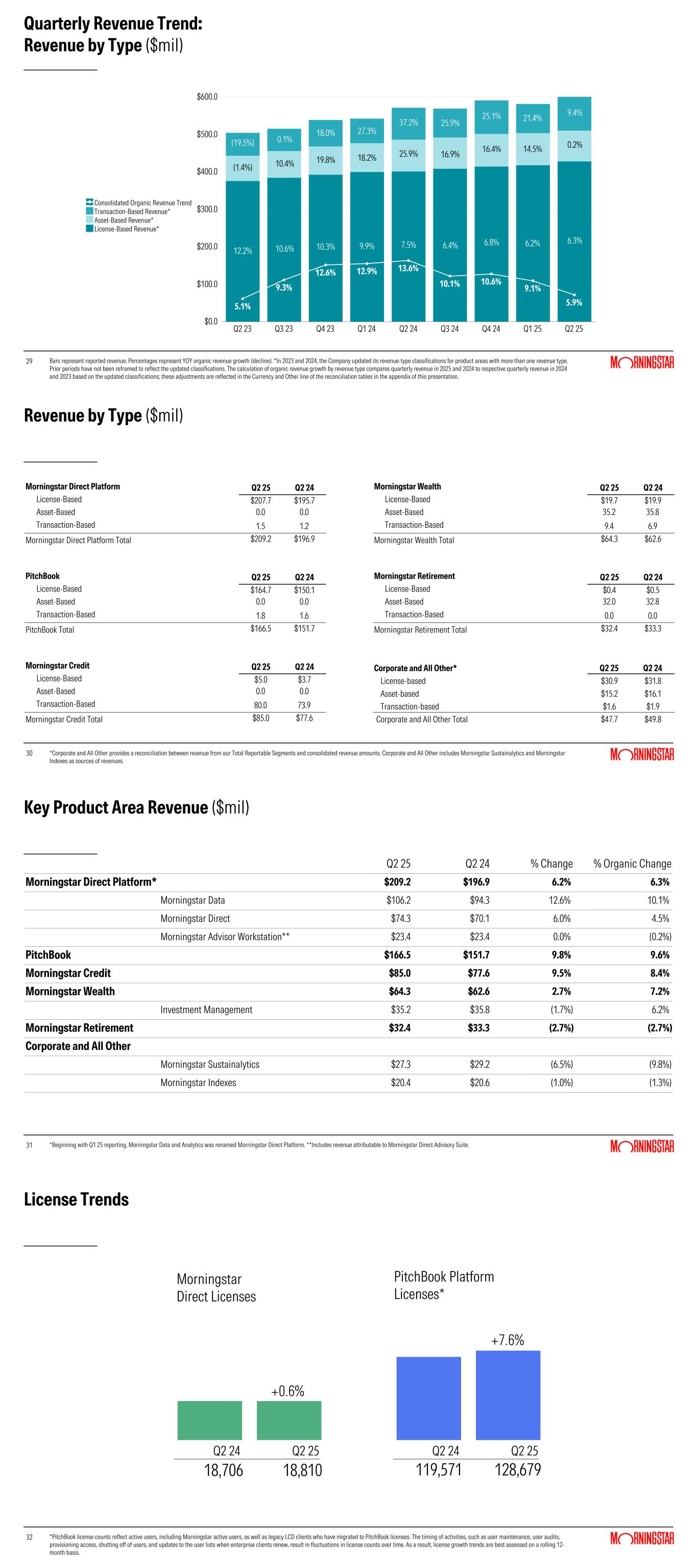 29 Quarterly Revenue Trend: Revenue by Type ($mil) 5.1% 9.3% 12.6% 12.9% 13.6% 10.1% 10.6% 9.1% 5.9% Consolidated Organic Revenue Trend Transaction-Based Revenue* Asset-Based Revenue* License-Based Revenue* Q2 23 Q3 23 Q4 23 Q1 24 Q2 24 Q3 24 Q4 24 Q1 25 Q2 25 $0.0 $100.0 $200.0 $300.0 $400.0 $500.0 $600.0 (19.5%) (1.4%) 12.2% 0.1% 10.4% 10.6% 18.0% 19.8% 10.3% 27.3% 18.2% 9.9% 37.2% 25.9% 7.5% 25.9% 16.9% 6.4% 25.1% 16.4% 6.8% 21.4% 14.5% 6.2% 9.4% 0.2% 6.3% Bars represent reported revenue. Percentages represent YOY organic revenue growth (decline). *In 2023 and 2024, the Company updated its revenue-type classifications for product areas with more than one revenue type. Prior periods have not been reframed to reflect the updated classifications. The calculation of organic revenue growth by revenue type compares quarterly revenue in 2025 and 2024 to respective quarterly revenue in 2024 and 2023 based on the updated classifications; these adjustments are reflected in the Currency and Other line of the reconciliation tables in the appendix of this presentation. 30 Revenue by Type ($mil) *Corporate and All Other provides a reconciliation between revenue from our Total Reportable Segments and consolidated revenue amounts. Corporate and All Other includes Morningstar Sustainalytics and Morningstar Indexes as sources of revenues. Morningstar Direct Platform Q2 25 Q2 24 Morningstar Wealth Q2 25 Q2 24 License-Based $207.7 $195.7 License-Based $19.7 $19.9 Asset-Based 0.0 0.0 Asset-Based 35.2 35.8 Transaction-Based 1.5 1.2 Transaction-Based 9.4 6.9 Morningstar Direct Platform Total $209.2 $196.9 Morningstar Wealth Total $64.3 $62.6 PitchBook Q2 25 Q2 24 Morningstar Retirement Q2 25 Q2 24 License-Based $164.7 $150.1 License-Based $0.4 $0.5 Asset-Based 0.0 0.0 Asset-Based 32.0 32.8 Transaction-Based 1.8 1.6 Transaction-Based 0.0 0.0 PitchBook Total $166.5 $151.7 Morningstar Retirement Total $32.4 $33.3 Morningstar Credit Q2 25 Q2 24 Corporate and All Other* Q2 25 Q2 24 License-Based $5.0 $3.7 License-based $30.9 $31.8 Asset-Based 0.0 0.0 Asset-based $15.2 $16.1 Transaction-Based 80.0 73.9 Transaction-based $1.6 $1.9 Morningstar Credit Total $85.0 $77.6 Corporate and All Other Total $47.7 $49.8 31 Key Product Area Revenue ($mil) *Beginning with Q1 25 reporting, Morningstar Data and Analytics was renamed Morningstar Direct Platform. **Includes revenue attributable to Morningstar Direct Advisory Suite. Q2 25 Q2 24 % Change % Organic Change Morningstar Direct Platform* $209.2 $196.9 6.2% 6.3% Morningstar Data $106.2 $94.3 12.6% 10.1% Morningstar Direct $74.3 $70.1 6.0% 4.5% Morningstar Advisor Workstation** $23.4 $23.4 0.0% (0.2%) PitchBook $166.5 $151.7 9.8% 9.6% Morningstar Credit $85.0 $77.6 9.5% 8.4% Morningstar Wealth $64.3 $62.6 2.7% 7.2% Investment Management $35.2 $35.8 (1.7%) 6.2% Morningstar Retirement $32.4 $33.3 (2.7%) (2.7%) Corporate and All Other Morningstar Sustainalytics $27.3 $29.2 (6.5%) (9.8%) Morningstar Indexes $20.4 $20.6 (1.0%) (1.3%) 32 License Trends 32 *PitchBook license counts reflect active users, including Morningstar active users, as well as legacy LCD clients who have migrated to PitchBook licenses. The timing of activities, such as user maintenance, user audits, provisioning access, shutting off of users, and updates to the user lists when enterprise clients renew, result in fluctuations in license counts over time. As a result, license growth trends are best assessed on a rolling 12- month basis. +0.6% 18,706 18,810 Morningstar Direct Licenses Q2 24 Q2 25 +7.6% 119,571 128,679 PitchBook Platform Licenses* Q2 24 Q2 25