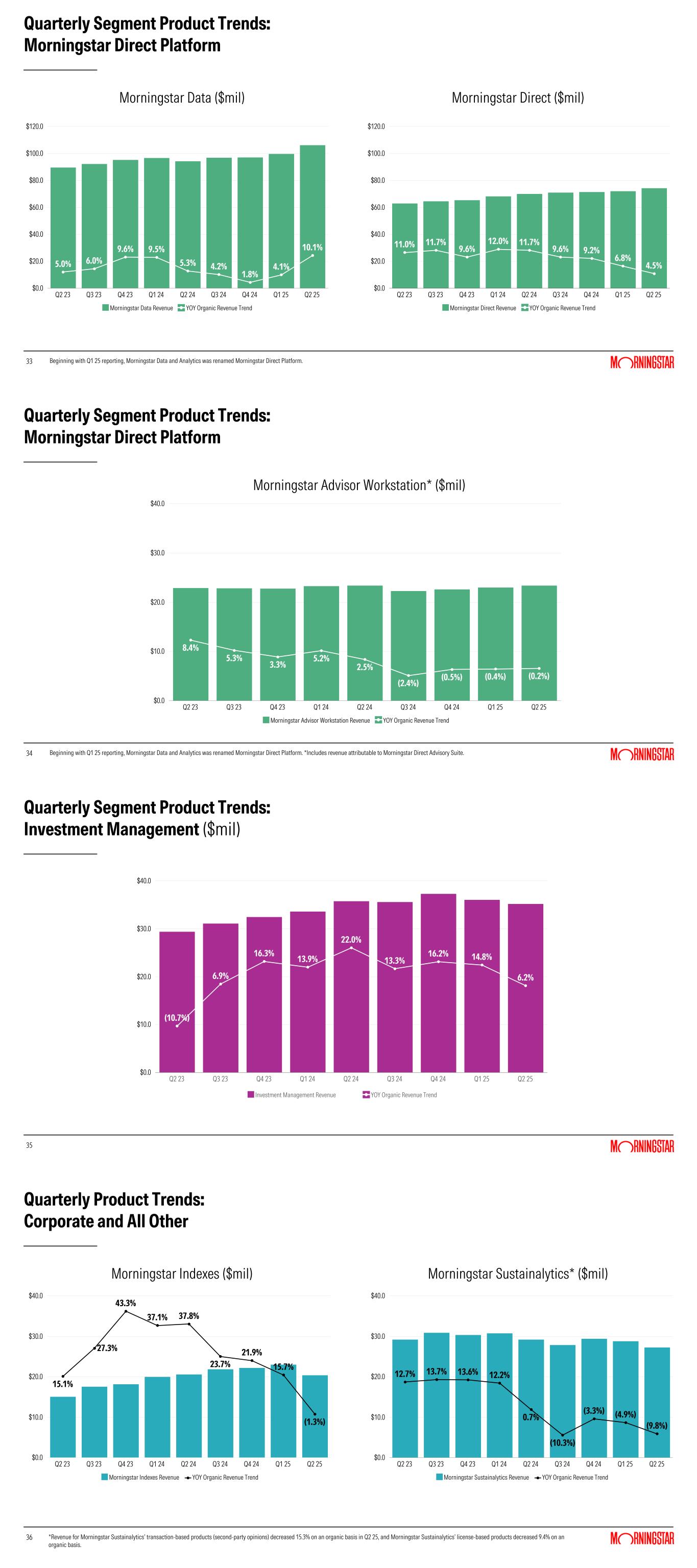 33 Quarterly Segment Product Trends: Morningstar Direct Platform 33 11.0% 11.7% 9.6% 12.0% 11.7% 9.6% 9.2% 6.8% 4.5% Morningstar Direct Revenue YOY Organic Revenue Trend Q2 23 Q3 23 Q4 23 Q1 24 Q2 24 Q3 24 Q4 24 Q1 25 Q2 25 $0.0 $20.0 $40.0 $60.0 $80.0 $100.0 $120.0 5.0% 6.0% 9.6% 9.5% 5.3% 4.2% 1.8% 4.1% 10.1% Morningstar Data Revenue YOY Organic Revenue Trend Q2 23 Q3 23 Q4 23 Q1 24 Q2 24 Q3 24 Q4 24 Q1 25 Q2 25 $0.0 $20.0 $40.0 $60.0 $80.0 $100.0 $120.0 Beginning with Q1 25 reporting, Morningstar Data and Analytics was renamed Morningstar Direct Platform. Morningstar Data ($mil) Morningstar Direct ($mil) 34 Quarterly Segment Product Trends: Morningstar Direct Platform 34 8.4% 5.3% 3.3% 5.2% 2.5% (2.4%) (0.5%) (0.4%) (0.2%) Morningstar Advisor Workstation Revenue YOY Organic Revenue Trend Q2 23 Q3 23 Q4 23 Q1 24 Q2 24 Q3 24 Q4 24 Q1 25 Q2 25 $0.0 $10.0 $20.0 $30.0 $40.0 Beginning with Q1 25 reporting, Morningstar Data and Analytics was renamed Morningstar Direct Platform. *Includes revenue attributable to Morningstar Direct Advisory Suite. Morningstar Advisor Workstation* ($mil) 35 Quarterly Segment Product Trends: Investment Management ($mil) 35 (10.7%) 6.9% 16.3% 13.9% 22.0% 13.3% 16.2% 14.8% 6.2% Investment Management Revenue YOY Organic Revenue Trend Q2 23 Q3 23 Q4 23 Q1 24 Q2 24 Q3 24 Q4 24 Q1 25 Q2 25 $0.0 $10.0 $20.0 $30.0 $40.0 36 Quarterly Product Trends: Corporate and All Other 36 15.1% 27.3% 43.3% 37.1% 37.8% 23.7% 21.9% 15.7% (1.3%) Morningstar Indexes Revenue YOY Organic Revenue Trend Q2 23 Q3 23 Q4 23 Q1 24 Q2 24 Q3 24 Q4 24 Q1 25 Q2 25 $0.0 $10.0 $20.0 $30.0 $40.0 12.7% 13.7% 13.6% 12.2% 0.7% (10.3%) (3.3%) (4.9%) (9.8%) Morningstar Sustainalytics Revenue YOY Organic Revenue Trend Q2 23 Q3 23 Q4 23 Q1 24 Q2 24 Q3 24 Q4 24 Q1 25 Q2 25 $0.0 $10.0 $20.0 $30.0 $40.0 *Revenue for Morningstar Sustainalytics’ transaction-based products (second-party opinions) decreased 15.3% on an organic basis in Q2 25, and Morningstar Sustainalytics’ license-based products decreased 9.4% on an organic basis. Morningstar Indexes ($mil) Morningstar Sustainalytics* ($mil)