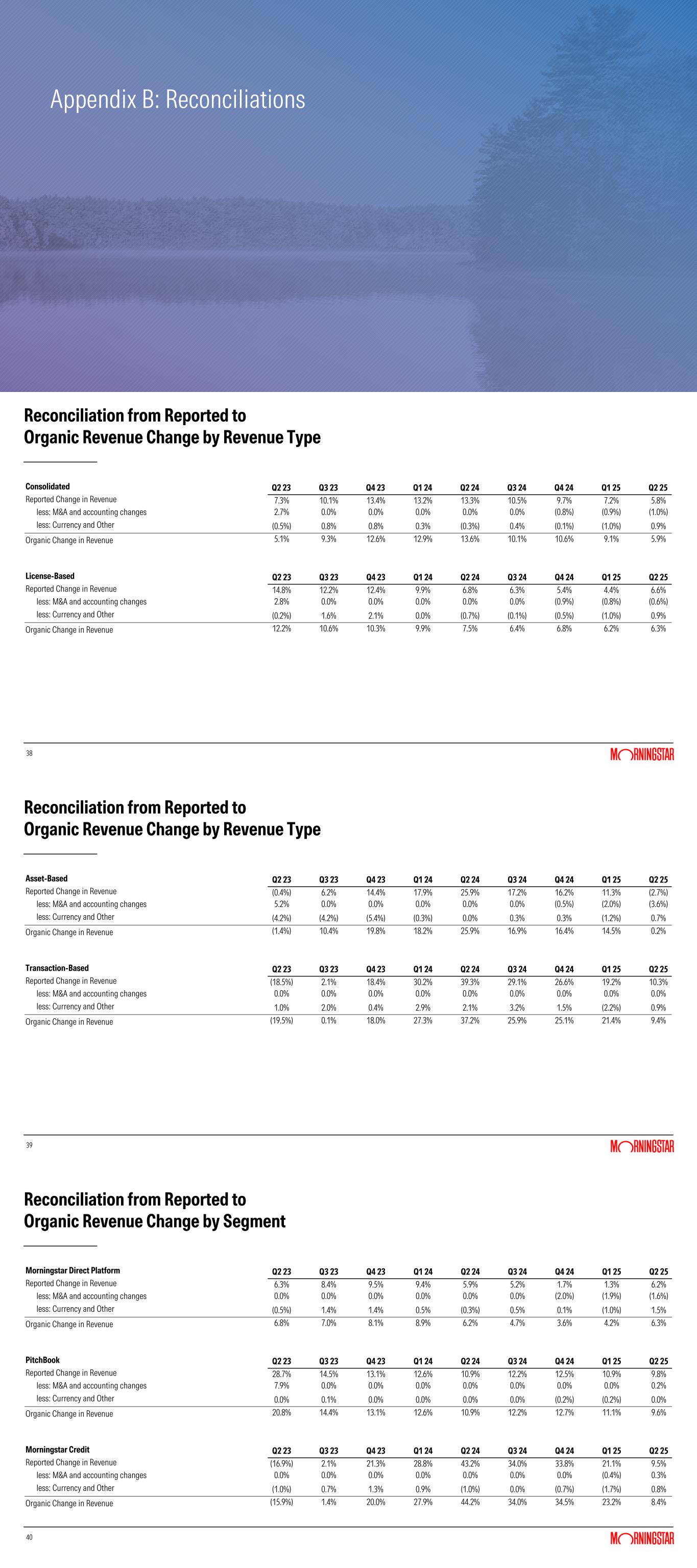 Appendix B: Reconciliations 38 Reconciliation from Reported to Organic Revenue Change by Revenue Type Consolidated Q2 23 Q3 23 Q4 23 Q1 24 Q2 24 Q3 24 Q4 24 Q1 25 Q2 25 Reported Change in Revenue 7.3% 10.1% 13.4% 13.2% 13.3% 10.5% 9.7% 7.2% 5.8% less: M&A and accounting changes 2.7% 0.0% 0.0% 0.0% 0.0% 0.0% (0.8%) (0.9%) (1.0%) less: Currency and Other (0.5%) 0.8% 0.8% 0.3% (0.3%) 0.4% (0.1%) (1.0%) 0.9% Organic Change in Revenue 5.1% 9.3% 12.6% 12.9% 13.6% 10.1% 10.6% 9.1% 5.9% License-Based Q2 23 Q3 23 Q4 23 Q1 24 Q2 24 Q3 24 Q4 24 Q1 25 Q2 25 Reported Change in Revenue 14.8% 12.2% 12.4% 9.9% 6.8% 6.3% 5.4% 4.4% 6.6% less: M&A and accounting changes 2.8% 0.0% 0.0% 0.0% 0.0% 0.0% (0.9%) (0.8%) (0.6%) less: Currency and Other (0.2%) 1.6% 2.1% 0.0% (0.7%) (0.1%) (0.5%) (1.0%) 0.9% Organic Change in Revenue 12.2% 10.6% 10.3% 9.9% 7.5% 6.4% 6.8% 6.2% 6.3% 39 Reconciliation from Reported to Organic Revenue Change by Revenue Type Asset-Based Q2 23 Q3 23 Q4 23 Q1 24 Q2 24 Q3 24 Q4 24 Q1 25 Q2 25 Reported Change in Revenue (0.4%) 6.2% 14.4% 17.9% 25.9% 17.2% 16.2% 11.3% (2.7%) less: M&A and accounting changes 5.2% 0.0% 0.0% 0.0% 0.0% 0.0% (0.5%) (2.0%) (3.6%) less: Currency and Other (4.2%) (4.2%) (5.4%) (0.3%) 0.0% 0.3% 0.3% (1.2%) 0.7% Organic Change in Revenue (1.4%) 10.4% 19.8% 18.2% 25.9% 16.9% 16.4% 14.5% 0.2% Transaction-Based Q2 23 Q3 23 Q4 23 Q1 24 Q2 24 Q3 24 Q4 24 Q1 25 Q2 25 Reported Change in Revenue (18.5%) 2.1% 18.4% 30.2% 39.3% 29.1% 26.6% 19.2% 10.3% less: M&A and accounting changes 0.0% 0.0% 0.0% 0.0% 0.0% 0.0% 0.0% 0.0% 0.0% less: Currency and Other 1.0% 2.0% 0.4% 2.9% 2.1% 3.2% 1.5% (2.2%) 0.9% Organic Change in Revenue (19.5%) 0.1% 18.0% 27.3% 37.2% 25.9% 25.1% 21.4% 9.4% 40 Reconciliation from Reported to Organic Revenue Change by Segment Morningstar Direct Platform Q2 23 Q3 23 Q4 23 Q1 24 Q2 24 Q3 24 Q4 24 Q1 25 Q2 25 Reported Change in Revenue 6.3% 8.4% 9.5% 9.4% 5.9% 5.2% 1.7% 1.3% 6.2% less: M&A and accounting changes 0.0% 0.0% 0.0% 0.0% 0.0% 0.0% (2.0%) (1.9%) (1.6%) less: Currency and Other (0.5%) 1.4% 1.4% 0.5% (0.3%) 0.5% 0.1% (1.0%) 1.5% Organic Change in Revenue 6.8% 7.0% 8.1% 8.9% 6.2% 4.7% 3.6% 4.2% 6.3% PitchBook Q2 23 Q3 23 Q4 23 Q1 24 Q2 24 Q3 24 Q4 24 Q1 25 Q2 25 Reported Change in Revenue 28.7% 14.5% 13.1% 12.6% 10.9% 12.2% 12.5% 10.9% 9.8% less: M&A and accounting changes 7.9% 0.0% 0.0% 0.0% 0.0% 0.0% 0.0% 0.0% 0.2% less: Currency and Other 0.0% 0.1% 0.0% 0.0% 0.0% 0.0% (0.2%) (0.2%) 0.0% Organic Change in Revenue 20.8% 14.4% 13.1% 12.6% 10.9% 12.2% 12.7% 11.1% 9.6% Morningstar Credit Q2 23 Q3 23 Q4 23 Q1 24 Q2 24 Q3 24 Q4 24 Q1 25 Q2 25 Reported Change in Revenue (16.9%) 2.1% 21.3% 28.8% 43.2% 34.0% 33.8% 21.1% 9.5% less: M&A and accounting changes 0.0% 0.0% 0.0% 0.0% 0.0% 0.0% 0.0% (0.4%) 0.3% less: Currency and Other (1.0%) 0.7% 1.3% 0.9% (1.0%) 0.0% (0.7%) (1.7%) 0.8% Organic Change in Revenue (15.9%) 1.4% 20.0% 27.9% 44.2% 34.0% 34.5% 23.2% 8.4%