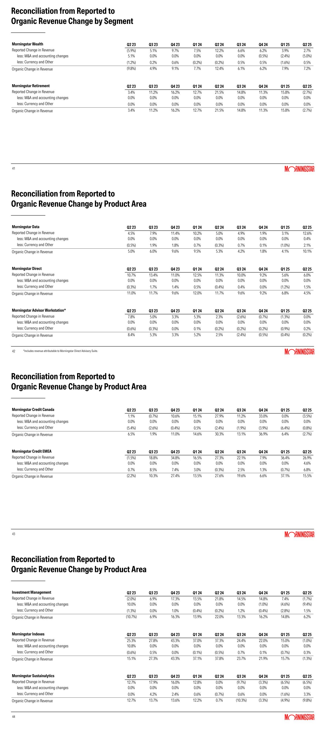 41 Reconciliation from Reported to Organic Revenue Change by Segment Morningstar Wealth Q2 23 Q3 23 Q4 23 Q1 24 Q2 24 Q3 24 Q4 24 Q1 25 Q2 25 Reported Change in Revenue (5.9%) 5.1% 9.7% 7.5% 12.2% 6.6% 6.2% 3.9% 2.7% less: M&A and accounting changes 5.1% 0.0% 0.0% 0.0% 0.0% 0.0% (0.5%) (2.4%) (5.0%) less: Currency and Other (1.2%) 0.2% 0.6% (0.2%) (0.2%) 0.5% 0.5% (1.6%) 0.5% Organic Change in Revenue (9.8%) 4.9% 9.1% 7.7% 12.4% 6.1% 6.2% 7.9% 7.2% Morningstar Retirement Q2 23 Q3 23 Q4 23 Q1 24 Q2 24 Q3 24 Q4 24 Q1 25 Q2 25 Reported Change in Revenue 3.4% 11.2% 16.2% 12.7% 21.5% 14.8% 11.3% 15.8% (2.7%) less: M&A and accounting changes 0.0% 0.0% 0.0% 0.0% 0.0% 0.0% 0.0% 0.0% 0.0% less: Currency and Other 0.0% 0.0% 0.0% 0.0% 0.0% 0.0% 0.0% 0.0% 0.0% Organic Change in Revenue 3.4% 11.2% 16.2% 12.7% 21.5% 14.8% 11.3% 15.8% (2.7%) 42 Reconciliation from Reported to Organic Revenue Change by Product Area Morningstar Data Q2 23 Q3 23 Q4 23 Q1 24 Q2 24 Q3 24 Q4 24 Q1 25 Q2 25 Reported Change in Revenue 4.5% 7.9% 11.4% 10.2% 5.0% 4.9% 1.9% 3.1% 12.6% less: M&A and accounting changes 0.0% 0.0% 0.0% 0.0% 0.0% 0.0% 0.0% 0.0% 0.4% less: Currency and Other (0.5%) 1.9% 1.8% 0.7% (0.3%) 0.7% 0.1% (1.0%) 2.1% Organic Change in Revenue 5.0% 6.0% 9.6% 9.5% 5.3% 4.2% 1.8% 4.1% 10.1% Morningstar Direct Q2 23 Q3 23 Q4 23 Q1 24 Q2 24 Q3 24 Q4 24 Q1 25 Q2 25 Reported Change in Revenue 10.7% 13.4% 11.0% 12.5% 11.3% 10.0% 9.2% 5.6% 6.0% less: M&A and accounting changes 0.0% 0.0% 0.0% 0.0% 0.0% 0.0% 0.0% 0.0% 0.0% less: Currency and Other (0.3%) 1.7% 1.4% 0.5% (0.4%) 0.4% 0.0% (1.2%) 1.5% Organic Change in Revenue 11.0% 11.7% 9.6% 12.0% 11.7% 9.6% 9.2% 6.8% 4.5% Morningstar Advisor Workstation* Q2 23 Q3 23 Q4 23 Q1 24 Q2 24 Q3 24 Q4 24 Q1 25 Q2 25 Reported Change in Revenue 7.8% 5.0% 3.3% 5.3% 2.3% (2.6%) (0.7%) (1.3%) 0.0% less: M&A and accounting changes 0.0% 0.0% 0.0% 0.0% 0.0% 0.0% 0.0% 0.0% 0.0% less: Currency and Other (0.6%) (0.3%) 0.0% 0.1% (0.2%) (0.2%) (0.2%) (0.9%) 0.2% Organic Change in Revenue 8.4% 5.3% 3.3% 5.2% 2.5% (2.4%) (0.5%) (0.4%) (0.2%) *Includes revenue attributable to Morningstar Direct Advisory Suite. 43 Reconciliation from Reported to Organic Revenue Change by Product Area Morningstar Credit Canada Q2 23 Q3 23 Q4 23 Q1 24 Q2 24 Q3 24 Q4 24 Q1 25 Q2 25 Reported Change in Revenue 1.1% (0.7%) 10.6% 15.1% 27.9% 11.2% 33.0% 0.0% (3.5%) less: M&A and accounting changes 0.0% 0.0% 0.0% 0.0% 0.0% 0.0% 0.0% 0.0% 0.0% less: Currency and Other (5.4%) (2.6%) (0.4%) 0.5% (2.4%) (1.9%) (3.9%) (6.4%) (0.8%) Organic Change in Revenue 6.5% 1.9% 11.0% 14.6% 30.3% 13.1% 36.9% 6.4% (2.7%) Morningstar Credit EMEA Q2 23 Q3 23 Q4 23 Q1 24 Q2 24 Q3 24 Q4 24 Q1 25 Q2 25 Reported Change in Revenue (1.5%) 18.8% 34.8% 16.5% 27.3% 22.1% 7.9% 36.4% 26.9% less: M&A and accounting changes 0.0% 0.0% 0.0% 0.0% 0.0% 0.0% 0.0% 0.0% 4.6% less: Currency and Other 0.7% 8.5% 7.4% 3.0% (0.3%) 2.5% 1.3% (0.7%) 6.8% Organic Change in Revenue (2.2%) 10.3% 27.4% 13.5% 27.6% 19.6% 6.6% 37.1% 15.5% 44 Reconciliation from Reported to Organic Revenue Change by Product Area Investment Management Q2 23 Q3 23 Q4 23 Q1 24 Q2 24 Q3 24 Q4 24 Q1 25 Q2 25 Reported Change in Revenue (2.0%) 6.9% 17.3% 13.5% 21.8% 14.5% 14.8% 7.4% (1.7%) less: M&A and accounting changes 10.0% 0.0% 0.0% 0.0% 0.0% 0.0% (1.0%) (4.6%) (9.4%) less: Currency and Other (1.3%) 0.0% 1.0% (0.4%) (0.2%) 1.2% (0.4%) (2.8%) 1.5% Organic Change in Revenue (10.7%) 6.9% 16.3% 13.9% 22.0% 13.3% 16.2% 14.8% 6.2% Morningstar Indexes Q2 23 Q3 23 Q4 23 Q1 24 Q2 24 Q3 24 Q4 24 Q1 25 Q2 25 Reported Change in Revenue 25.3% 27.8% 43.3% 37.0% 37.3% 24.4% 22.0% 15.0% (1.0%) less: M&A and accounting changes 10.8% 0.0% 0.0% 0.0% 0.0% 0.0% 0.0% 0.0% 0.0% less: Currency and Other (0.6%) 0.5% 0.0% (0.1%) (0.5%) 0.7% 0.1% (0.7%) 0.3% Organic Change in Revenue 15.1% 27.3% 43.3% 37.1% 37.8% 23.7% 21.9% 15.7% (1.3%) Morningstar Sustainalytics Q2 23 Q3 23 Q4 23 Q1 24 Q2 24 Q3 24 Q4 24 Q1 25 Q2 25 Reported Change in Revenue 12.7% 17.9% 16.0% 12.8% 0.0% (9.7%) (3.3%) (6.5%) (6.5%) less: M&A and accounting changes 0.0% 0.0% 0.0% 0.0% 0.0% 0.0% 0.0% 0.0% 0.0% less: Currency and Other 0.0% 4.2% 2.4% 0.6% (0.7%) 0.6% 0.0% (1.6%) 3.3% Organic Change in Revenue 12.7% 13.7% 13.6% 12.2% 0.7% (10.3%) (3.3%) (4.9%) (9.8%)