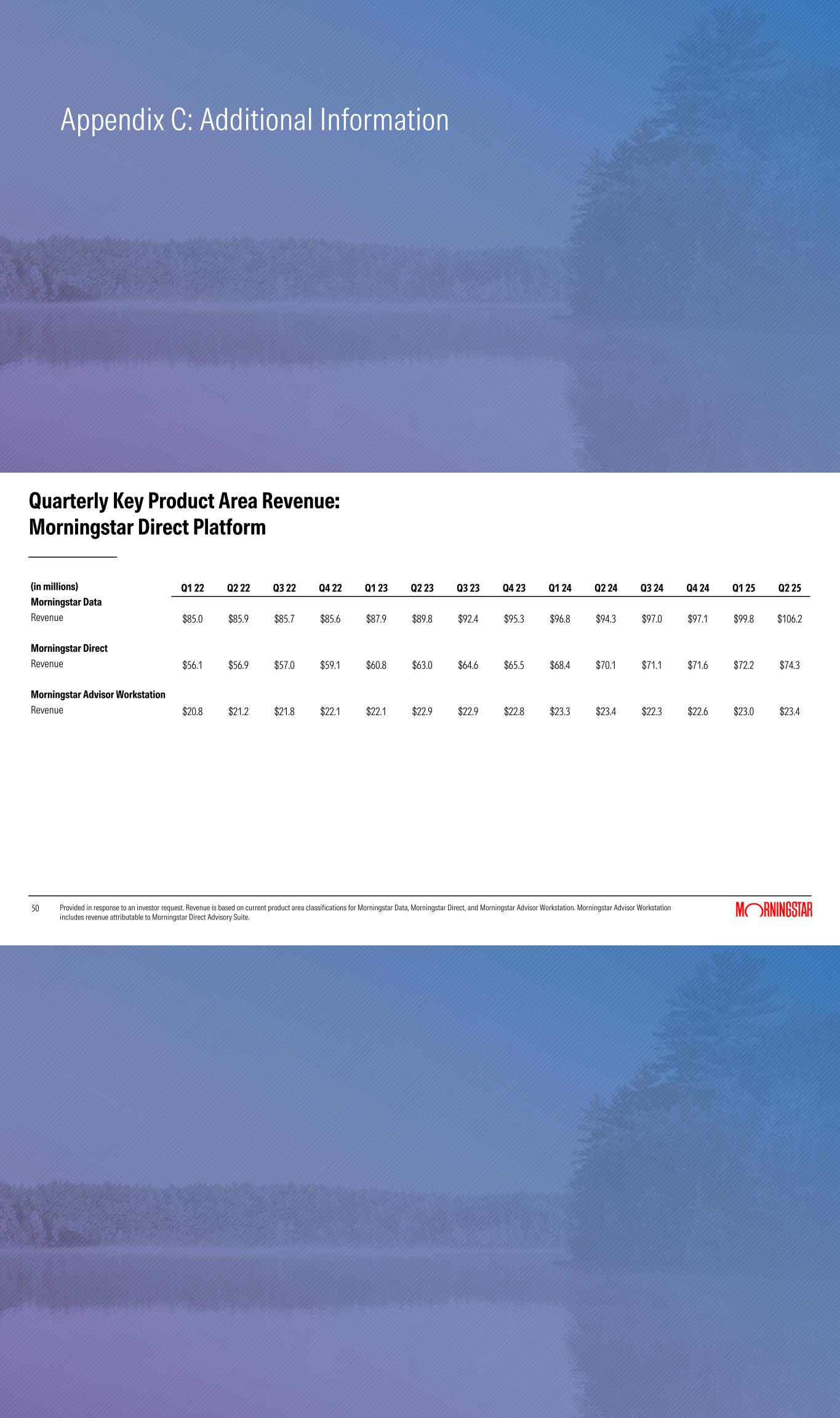 Appendix C: Additional Information 50 (in millions) Q1 22 Q2 22 Q3 22 Q4 22 Q1 23 Q2 23 Q3 23 Q4 23 Q1 24 Q2 24 Q3 24 Q4 24 Q1 25 Q2 25 Morningstar Data Revenue $85.0 $85.9 $85.7 $85.6 $87.9 $89.8 $92.4 $95.3 $96.8 $94.3 $97.0 $97.1 $99.8 $106.2 Morningstar Direct Revenue $56.1 $56.9 $57.0 $59.1 $60.8 $63.0 $64.6 $65.5 $68.4 $70.1 $71.1 $71.6 $72.2 $74.3 Morningstar Advisor Workstation Revenue $20.8 $21.2 $21.8 $22.1 $22.1 $22.9 $22.9 $22.8 $23.3 $23.4 $22.3 $22.6 $23.0 $23.4 Quarterly Key Product Area Revenue: Morningstar Direct Platform Provided in response to an investor request. Revenue is based on current product area classifications for Morningstar Data, Morningstar Direct, and Morningstar Advisor Workstation. Morningstar Advisor Workstation includes revenue attributable to Morningstar Direct Advisory Suite.