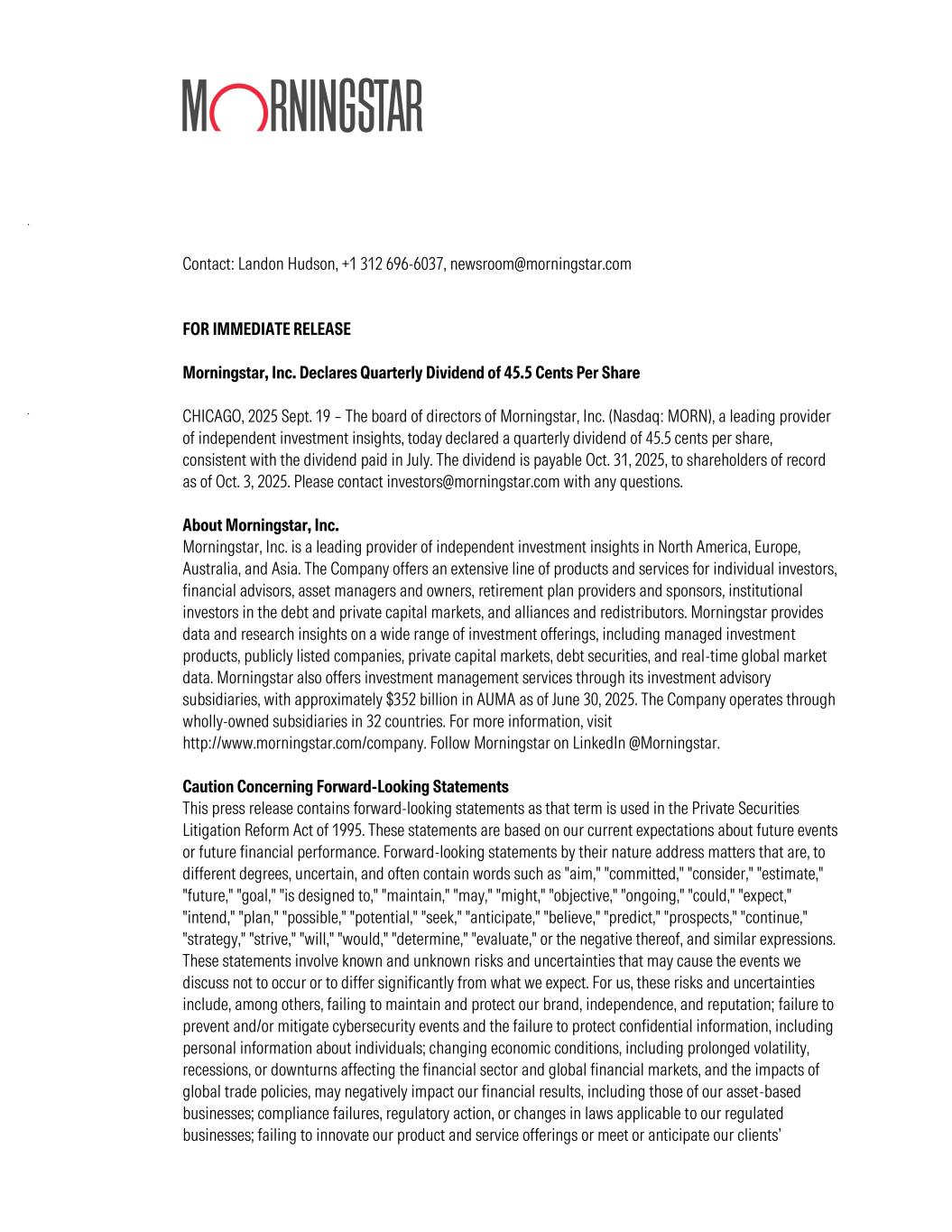 Contact: Landon Hudson, +1 312 696-6037, newsroom@morningstar.com FOR IMMEDIATE RELEASE Morningstar, Inc. Declares Quarterly Dividend of 45.5 Cents Per Share CHICAGO, 2025 Sept. 19 – The board of directors of Morningstar, Inc. (Nasdaq: MORN), a leading provider of independent investment insights, today declared a quarterly dividend of 45.5 cents per share, consistent with the dividend paid in July. The dividend is payable Oct. 31, 2025, to shareholders of record as of Oct. 3, 2025. Please contact investors@morningstar.com with any questions. About Morningstar, Inc. Morningstar, Inc. is a leading provider of independent investment insights in North America, Europe, Australia, and Asia. The Company offers an extensive line of products and services for individual investors, financial advisors, asset managers and owners, retirement plan providers and sponsors, institutional investors in the debt and private capital markets, and alliances and redistributors. Morningstar provides data and research insights on a wide range of investment offerings, including managed investment products, publicly listed companies, private capital markets, debt securities, and real-time global market data. Morningstar also offers investment management services through its investment advisory subsidiaries, with approximately $352 billion in AUMA as of June 30, 2025. The Company operates through wholly-owned subsidiaries in 32 countries. For more information, visit http://www.morningstar.com/company. Follow Morningstar on LinkedIn @Morningstar. Caution Concerning Forward-Looking Statements This press release contains forward-looking statements as that term is used in the Private Securities Litigation Reform Act of 1995. These statements are based on our current expectations about future events or future financial performance. Forward-looking statements by their nature address matters that are, to different degrees, uncertain, and often contain words such as "aim," "committed," "consider," "estimate," "future," "goal," "is designed to," "maintain," "may," "might," "objective," "ongoing," "could," "expect," "intend," "plan," "possible," "potential," "seek," "anticipate," "believe," "predict," "prospects," "continue," "strategy," "strive," "will," "would," "determine," "evaluate," or the negative thereof, and similar expressions. These statements involve known and unknown risks and uncertainties that may cause the events we discuss not to occur or to differ significantly from what we expect. For us, these risks and uncertainties include, among others, failing to maintain and protect our brand, independence, and reputation; failure to prevent and/or mitigate cybersecurity events and the failure to protect confidential information, including personal information about individuals; changing economic conditions, including prolonged volatility, recessions, or downturns affecting the financial sector and global financial markets, and the impacts of global trade policies, may negatively impact our financial results, including those of our asset-based businesses; compliance failures, regulatory action, or changes in laws applicable to our regulated businesses; failing to innovate our product and service offerings or meet or anticipate our clients’