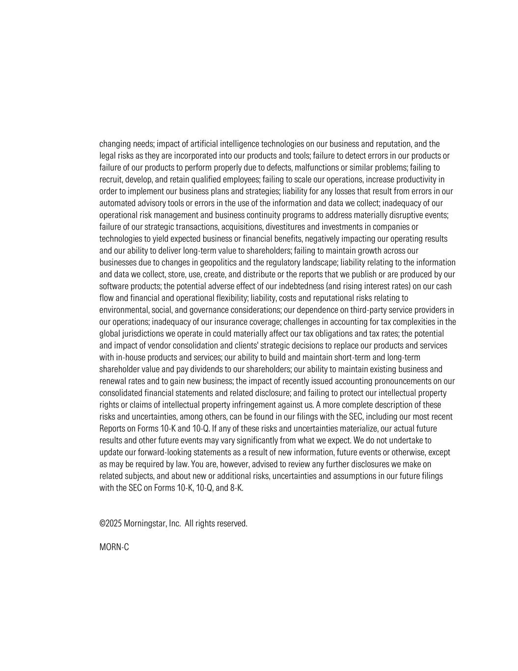 changing needs; impact of artificial intelligence technologies on our business and reputation, and the legal risks as they are incorporated into our products and tools; failure to detect errors in our products or failure of our products to perform properly due to defects, malfunctions or similar problems; failing to recruit, develop, and retain qualified employees; failing to scale our operations, increase productivity in order to implement our business plans and strategies; liability for any losses that result from errors in our automated advisory tools or errors in the use of the information and data we collect; inadequacy of our operational risk management and business continuity programs to address materially disruptive events; failure of our strategic transactions, acquisitions, divestitures and investments in companies or technologies to yield expected business or financial benefits, negatively impacting our operating results and our ability to deliver long-term value to shareholders; failing to maintain growth across our businesses due to changes in geopolitics and the regulatory landscape; liability relating to the information and data we collect, store, use, create, and distribute or the reports that we publish or are produced by our software products; the potential adverse effect of our indebtedness (and rising interest rates) on our cash flow and financial and operational flexibility; liability, costs and reputational risks relating to environmental, social, and governance considerations; our dependence on third-party service providers in our operations; inadequacy of our insurance coverage; challenges in accounting for tax complexities in the global jurisdictions we operate in could materially affect our tax obligations and tax rates; the potential and impact of vendor consolidation and clients' strategic decisions to replace our products and services with in-house products and services; our ability to build and maintain short-term and long-term shareholder value and pay dividends to our shareholders; our ability to maintain existing business and renewal rates and to gain new business; the impact of recently issued accounting pronouncements on our consolidated financial statements and related disclosure; and failing to protect our intellectual property rights or claims of intellectual property infringement against us. A more complete description of these risks and uncertainties, among others, can be found in our filings with the SEC, including our most recent Reports on Forms 10-K and 10-Q. If any of these risks and uncertainties materialize, our actual future results and other future events may vary significantly from what we expect. We do not undertake to update our forward-looking statements as a result of new information, future events or otherwise, except as may be required by law. You are, however, advised to review any further disclosures we make on related subjects, and about new or additional risks, uncertainties and assumptions in our future filings with the SEC on Forms 10-K, 10-Q, and 8-K. ©2025 Morningstar, Inc. All rights reserved. MORN-C