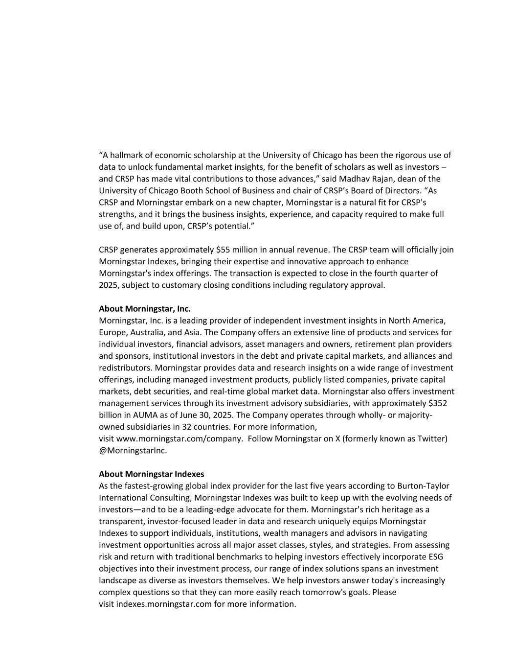 “A hallmark of economic scholarship at the University of Chicago has been the rigorous use of data to unlock fundamental market insights, for the benefit of scholars as well as investors – and CRSP has made vital contributions to those advances,” said Madhav Rajan, dean of the University of Chicago Booth School of Business and chair of CRSP’s Board of Directors. “As CRSP and Morningstar embark on a new chapter, Morningstar is a natural fit for CRSP's strengths, and it brings the business insights, experience, and capacity required to make full use of, and build upon, CRSP’s potential.” CRSP generates approximately $55 million in annual revenue. The CRSP team will officially join Morningstar Indexes, bringing their expertise and innovative approach to enhance Morningstar's index offerings. The transaction is expected to close in the fourth quarter of 2025, subject to customary closing conditions including regulatory approval. About Morningstar, Inc. Morningstar, Inc. is a leading provider of independent investment insights in North America, Europe, Australia, and Asia. The Company offers an extensive line of products and services for individual investors, financial advisors, asset managers and owners, retirement plan providers and sponsors, institutional investors in the debt and private capital markets, and alliances and redistributors. Morningstar provides data and research insights on a wide range of investment offerings, including managed investment products, publicly listed companies, private capital markets, debt securities, and real-time global market data. Morningstar also offers investment management services through its investment advisory subsidiaries, with approximately $352 billion in AUMA as of June 30, 2025. The Company operates through wholly- or majority- owned subsidiaries in 32 countries. For more information, visit www.morningstar.com/company. Follow Morningstar on X (formerly known as Twitter) @MorningstarInc. About Morningstar Indexes As the fastest-growing global index provider for the last five years according to Burton-Taylor International Consulting, Morningstar Indexes was built to keep up with the evolving needs of investors—and to be a leading-edge advocate for them. Morningstar's rich heritage as a transparent, investor-focused leader in data and research uniquely equips Morningstar Indexes to support individuals, institutions, wealth managers and advisors in navigating investment opportunities across all major asset classes, styles, and strategies. From assessing risk and return with traditional benchmarks to helping investors effectively incorporate ESG objectives into their investment process, our range of index solutions spans an investment landscape as diverse as investors themselves. We help investors answer today's increasingly complex questions so that they can more easily reach tomorrow's goals. Please visit indexes.morningstar.com for more information.