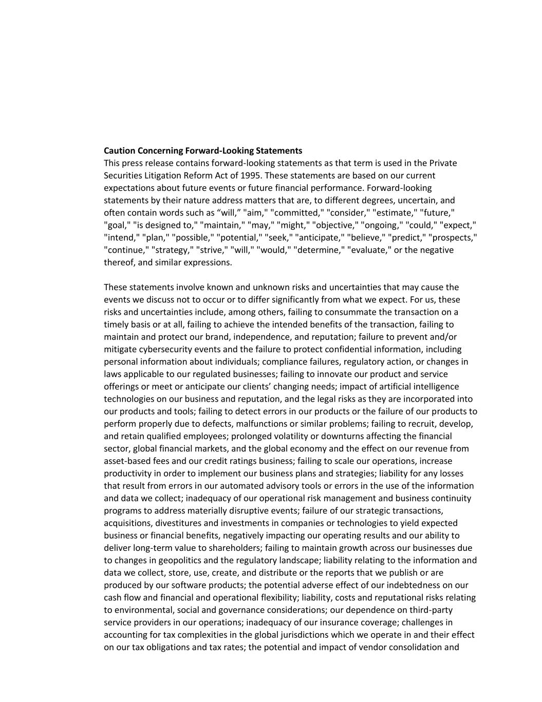 Caution Concerning Forward-Looking Statements This press release contains forward-looking statements as that term is used in the Private Securities Litigation Reform Act of 1995. These statements are based on our current expectations about future events or future financial performance. Forward-looking statements by their nature address matters that are, to different degrees, uncertain, and often contain words such as “will,” "aim," "committed," "consider," "estimate," "future," "goal," "is designed to," "maintain," "may," "might," "objective," "ongoing," "could," "expect," "intend," "plan," "possible," "potential," "seek," "anticipate," "believe," "predict," "prospects," "continue," "strategy," "strive," "will," "would," "determine," "evaluate," or the negative thereof, and similar expressions. These statements involve known and unknown risks and uncertainties that may cause the events we discuss not to occur or to differ significantly from what we expect. For us, these risks and uncertainties include, among others, failing to consummate the transaction on a timely basis or at all, failing to achieve the intended benefits of the transaction, failing to maintain and protect our brand, independence, and reputation; failure to prevent and/or mitigate cybersecurity events and the failure to protect confidential information, including personal information about individuals; compliance failures, regulatory action, or changes in laws applicable to our regulated businesses; failing to innovate our product and service offerings or meet or anticipate our clients’ changing needs; impact of artificial intelligence technologies on our business and reputation, and the legal risks as they are incorporated into our products and tools; failing to detect errors in our products or the failure of our products to perform properly due to defects, malfunctions or similar problems; failing to recruit, develop, and retain qualified employees; prolonged volatility or downturns affecting the financial sector, global financial markets, and the global economy and the effect on our revenue from asset-based fees and our credit ratings business; failing to scale our operations, increase productivity in order to implement our business plans and strategies; liability for any losses that result from errors in our automated advisory tools or errors in the use of the information and data we collect; inadequacy of our operational risk management and business continuity programs to address materially disruptive events; failure of our strategic transactions, acquisitions, divestitures and investments in companies or technologies to yield expected business or financial benefits, negatively impacting our operating results and our ability to deliver long-term value to shareholders; failing to maintain growth across our businesses due to changes in geopolitics and the regulatory landscape; liability relating to the information and data we collect, store, use, create, and distribute or the reports that we publish or are produced by our software products; the potential adverse effect of our indebtedness on our cash flow and financial and operational flexibility; liability, costs and reputational risks relating to environmental, social and governance considerations; our dependence on third-party service providers in our operations; inadequacy of our insurance coverage; challenges in accounting for tax complexities in the global jurisdictions which we operate in and their effect on our tax obligations and tax rates; the potential and impact of vendor consolidation and