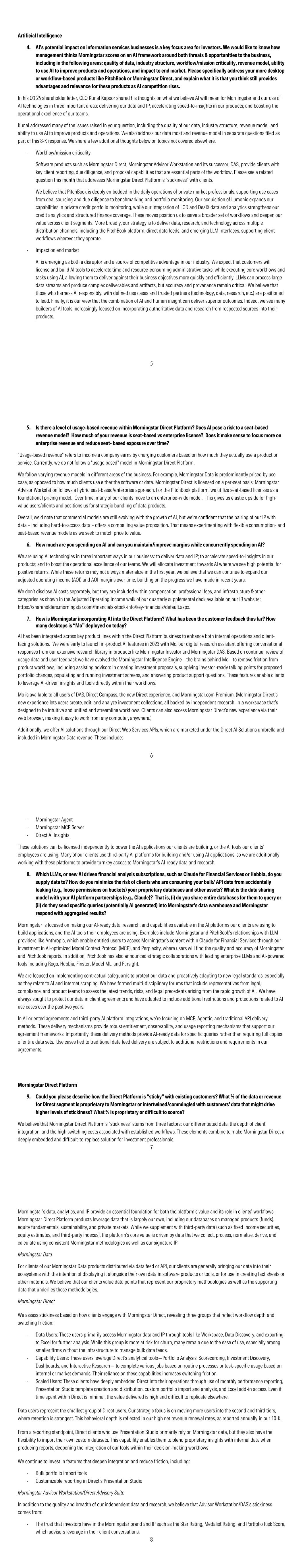 5 Artificial Intelligence 4. AI’s potential impact on information services businesses is a key focus area for investors. We would like to know how management thinks Morningstar scores on an AI framework around both threats & opportunities to the business, including in the following areas: quality of data, industry structure, workflow/mission criticality, revenue model, ability to use AI to improve products and operations, and impact to end market. Please specifically address your more desktop or workflow-based products like PitchBook or Morningstar Direct, and explain what it is that you think still provides advantages and relevance for these products as AI competition rises. In his Q3 25 shareholder letter, CEO Kunal Kapoor shared his thoughts on what we believe AI will mean for Morningstar and our use of AI technologies in three important areas: delivering our data and IP; accelerating speed-to-insights in our products; and boosting the operational excellence of our teams. Kunal addressed many of the issues raised in your question, including the quality of our data, industry structure, revenue model, and ability to use AI to improve products and operations. We also address our data moat and revenue model in separate questions filed as part of this 8-K response. We share a few additional thoughts below on topics not covered elsewhere. - Workflow/mission criticality Software products such as Morningstar Direct, Morningstar Advisor Workstation and its successor, DAS, provide clients with key client reporting, due diligence, and proposal capabilities that are essential parts of the workflow. Please see a related question this month that addresses Morningstar Direct Platform’s “stickiness” with clients. We believe that PitchBook is deeply embedded in the daily operations of private market professionals, supporting use cases from deal sourcing and due diligence to benchmarking and portfolio monitoring. Our acquisition of Lumonic expands our capabilities in private credit portfolio monitoring, while our integration of LCD and DealX data and analytics strengthens our credit analytics and structured finance coverage. These moves position us to serve a broader set of workflows and deepen our value across client segments. More broadly, our strategy is to deliver data, research, and technology across multiple distribution channels, including the PitchBook platform, direct data feeds, and emerging LLM interfaces, supporting client workflows wherever they operate. - Impact on end market AI is emerging as both a disruptor and a source of competitive advantage in our industry. We expect that customers will license and build AI tools to accelerate time and resource-consuming administrative tasks, while executing core workflows and tasks using AI, allowing them to deliver against their business objectives more quickly and efficiently. LLMs can process large data streams and produce complex deliverables and artifacts, but accuracy and provenance remain critical. We believe that those who harness AI responsibly, with defined use cases and trusted partners (technology, data, research, etc.) are positioned to lead. Finally, it is our view that the combination of AI and human insight can deliver superior outcomes. Indeed, we see many builders of AI tools increasingly focused on incorporating authoritative data and research from respected sources into their products. 6 5. Is there a level of usage-based revenue within Morningstar Direct Platform? Does AI pose a risk to a seat-based revenue model? How much of your revenue is seat-based vs enterprise license? Does it make sense to focus more on enterprise revenue and reduce seat- based exposure over time? “Usage-based revenue” refers to income a company earns by charging customers based on how much they actually use a product or service. Currently, we do not follow a “usage based” model in Morningstar Direct Platform. We follow varying revenue models in different areas of the business. For example, Morningstar Data is predominantly priced by use case, as opposed to how much clients use either the software or data. Morningstar Direct is licensed on a per-seat basis; Morningstar Advisor Workstation follows a hybrid seat-based/enterprise approach. For the PitchBook platform, we utilize seat-based licenses as a foundational pricing model. Over time, many of our clients move to an enterprise-wide model. This gives us elastic upside for high- value users/clients and positions us for strategic bundling of data products. Overall, we’d note that commercial models are still evolving with the growth of AI, but we’re confident that the pairing of our IP with data – including hard-to-access data – offers a compelling value proposition. That means experimenting with flexible consumption- and seat-based revenue models as we seek to match price to value. 6. How much are you spending on AI and can you maintain/improve margins while concurrently spending on AI? We are using AI technologies in three important ways in our business: to deliver data and IP; to accelerate speed-to-insights in our products; and to boost the operational excellence of our teams. We will allocate investment towards AI where we see high potential for positive returns. While these returns may not always materialize in the first year, we believe that we can continue to expand our adjusted operating income (AOI) and AOI margins over time, building on the progress we have made in recent years. We don’t disclose AI costs separately, but they are included within compensation, professional fees, and infrastructure & other categories as shown in the Adjusted Operating Income walk of our quarterly supplemental deck available on our IR website: https://shareholders.morningstar.com/financials-stock-info/key-financials/default.aspx. 7. How is Morningstar incorporating AI into the Direct Platform? What has been the customer feedback thus far? How many desktops is “Mo” deployed on today? A