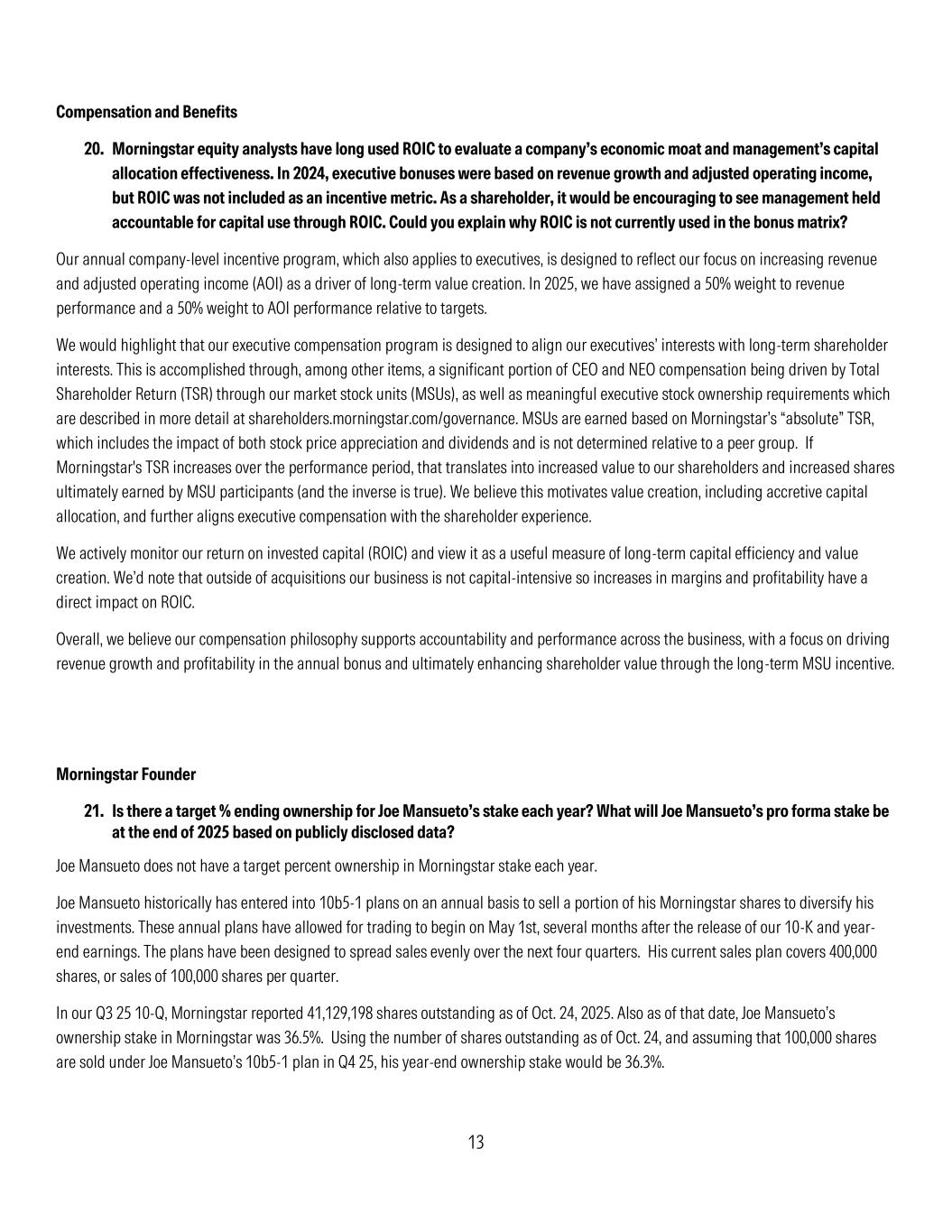 13 Compensation and Benefits 20. Morningstar equity analysts have long used ROIC to evaluate a company’s economic moat and management’s capital allocation effectiveness. In 2024, executive bonuses were based on revenue growth and adjusted operating income, but ROIC was not included as an incentive metric. As a shareholder, it would be encouraging to see management held accountable for capital use through ROIC. Could you explain why ROIC is not currently used in the bonus matrix? Our annual company-level incentive program, which also applies to executives, is designed to reflect our focus on increasing revenue and adjusted operating income (AOI) as a driver of long-term value creation. In 2025, we have assigned a 50% weight to revenue performance and a 50% weight to AOI performance relative to targets. We would highlight that our executive compensation program is designed to align our executives’ interests with long-term shareholder interests. This is accomplished through, among other items, a significant portion of CEO and NEO compensation being driven by Total Shareholder Return (TSR) through our market stock units (MSUs), as well as meaningful executive stock ownership requirements which are described in more detail at shareholders.morningstar.com/governance. MSUs are earned based on Morningstar’s “absolute” TSR, which includes the impact of both stock price appreciation and dividends and is not determined relative to a peer group. If Morningstar's TSR increases over the performance period, that translates into increased value to our shareholders and increased shares ultimately earned by MSU participants (and the inverse is true). We believe this motivates value creation, including accretive capital allocation, and further aligns executive compensation with the shareholder experience. We actively monitor our return on invested capital (ROIC) and view it as a useful measure of long-term capital efficiency and value creation. We’d note that outside of acquisitions our business is not capital-intensive so increases in margins and profitability have a direct impact on ROIC. Overall, we believe our compensation philosophy supports accountability and performance across the business, with a focus on driving revenue growth and profitability in the annual bonus and ultimately enhancing shareholder value through the long-term MSU incentive. Morningstar Founder 21. Is there a target % ending ownership for Joe Mansueto’s stake each year? What will Joe Mansueto’s pro forma stake be at the end of 2025 based on publicly disclosed data? Joe Mansueto does not have a target percent ownership in Morningstar stake each year. Joe Mansueto historically has entered into 10b5-1 plans on an annual basis to sell a portion of his Morningstar shares to diversify his investments. These annual plans have allowed for trading to begin on May 1st, several months after the release of our 10-K and year- end earnings. The plans have been designed to spread sales evenly over the next four quarters. His current sales plan covers 400,000 shares, or sales of 100,000 shares per quarter. In our Q3 25 10-Q, Morningstar reported 41,129,198 shares outstanding as of Oct. 24, 2025. Also as of that date, Joe Mansueto’s ownership stake in Morningstar was 36.5%. Using the number of shares outstanding as of Oct. 24, and assuming that 100,000 shares are sold under Joe Mansueto’s 10b5-1 plan in Q4 25, his year-end ownership stake would be 36.3%.