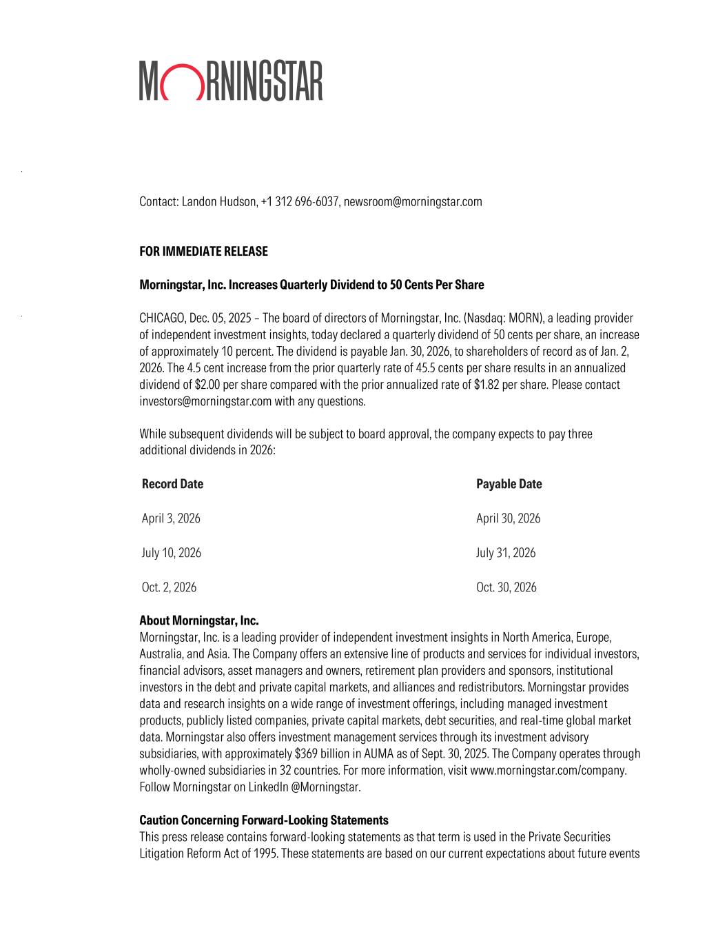 Contact: Landon Hudson, +1 312 696-6037, newsroom@morningstar.com FOR IMMEDIATE RELEASE Morningstar, Inc. Increases Quarterly Dividend to 50 Cents Per Share CHICAGO, Dec. 05, 2025 – The board of directors of Morningstar, Inc. (Nasdaq: MORN), a leading provider of independent investment insights, today declared a quarterly dividend of 50 cents per share, an increase of approximately 10 percent. The dividend is payable Jan. 30, 2026, to shareholders of record as of Jan. 2, 2026. The 4.5 cent increase from the prior quarterly rate of 45.5 cents per share results in an annualized dividend of $2.00 per share compared with the prior annualized rate of $1.82 per share. Please contact investors@morningstar.com with any questions. While subsequent dividends will be subject to board approval, the company expects to pay three additional dividends in 2026: Record Date Payable Date April 3, 2026 April 30, 2026 July 10, 2026 July 31, 2026 Oct. 2, 2026 Oct. 30, 2026 About Morningstar, Inc. Morningstar, Inc. is a leading provider of independent investment insights in North America, Europe, Australia, and Asia. The Company offers an extensive line of products and services for individual investors, financial advisors, asset managers and owners, retirement plan providers and sponsors, institutional investors in the debt and private capital markets, and alliances and redistributors. Morningstar provides data and research insights on a wide range of investment offerings, including managed investment products, publicly listed companies, private capital markets, debt securities, and real-time global market data. Morningstar also offers investment management services through its investment advisory subsidiaries, with approximately $369 billion in AUMA as of Sept. 30, 2025. The Company operates through wholly-owned subsidiaries in 32 countries. For more information, visit www.morningstar.com/company. Follow Morningstar on LinkedIn @Morningstar. Caution Concerning Forward-Looking Statements This press release contains forward-looking statements as that term is used in the Private Securities Litigation Reform Act of 1995. These statements are based on our current expectations about future events