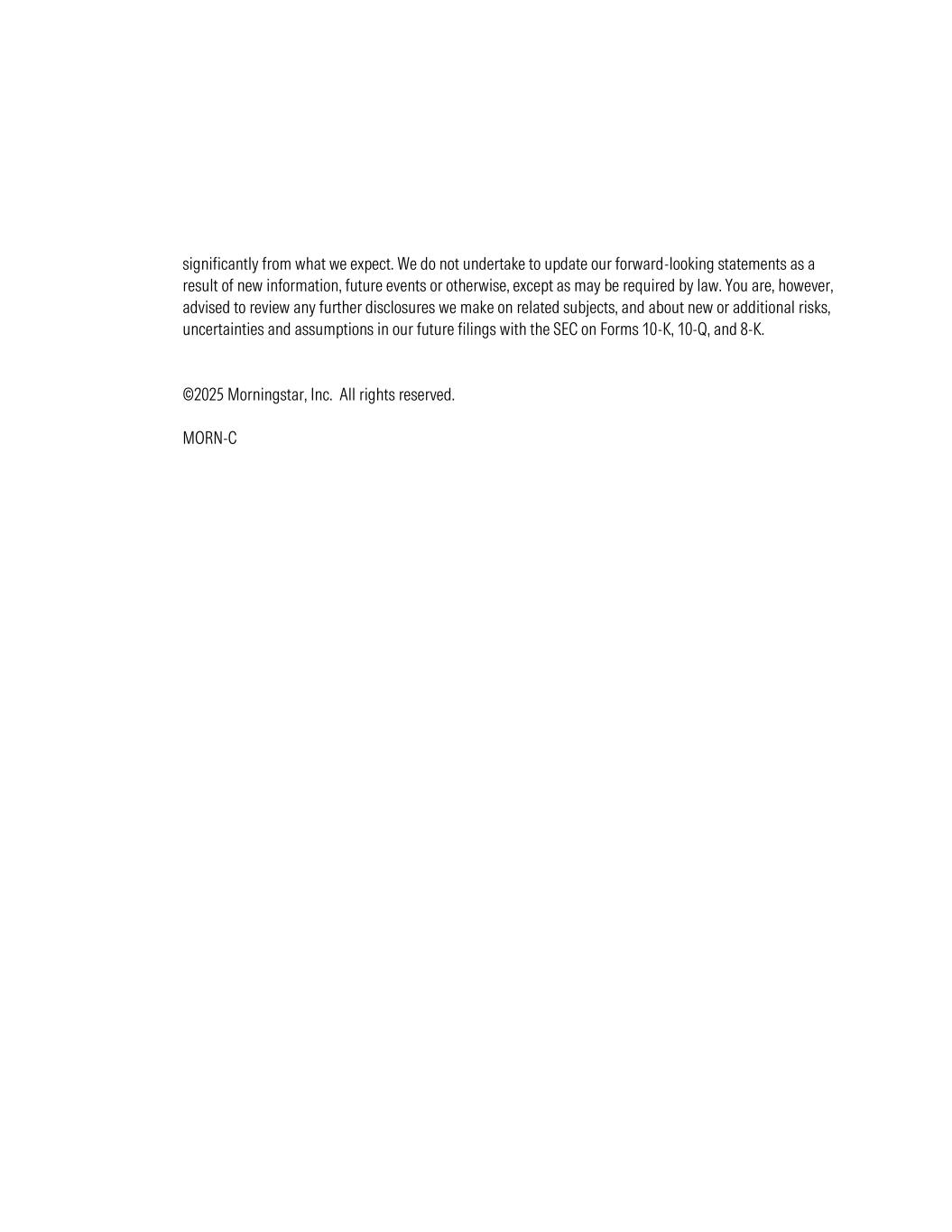 significantly from what we expect. We do not undertake to update our forward-looking statements as a result of new information, future events or otherwise, except as may be required by law. You are, however, advised to review any further disclosures we make on related subjects, and about new or additional risks, uncertainties and assumptions in our future filings with the SEC on Forms 10-K, 10-Q, and 8-K. ©2025 Morningstar, Inc. All rights reserved. MORN-C