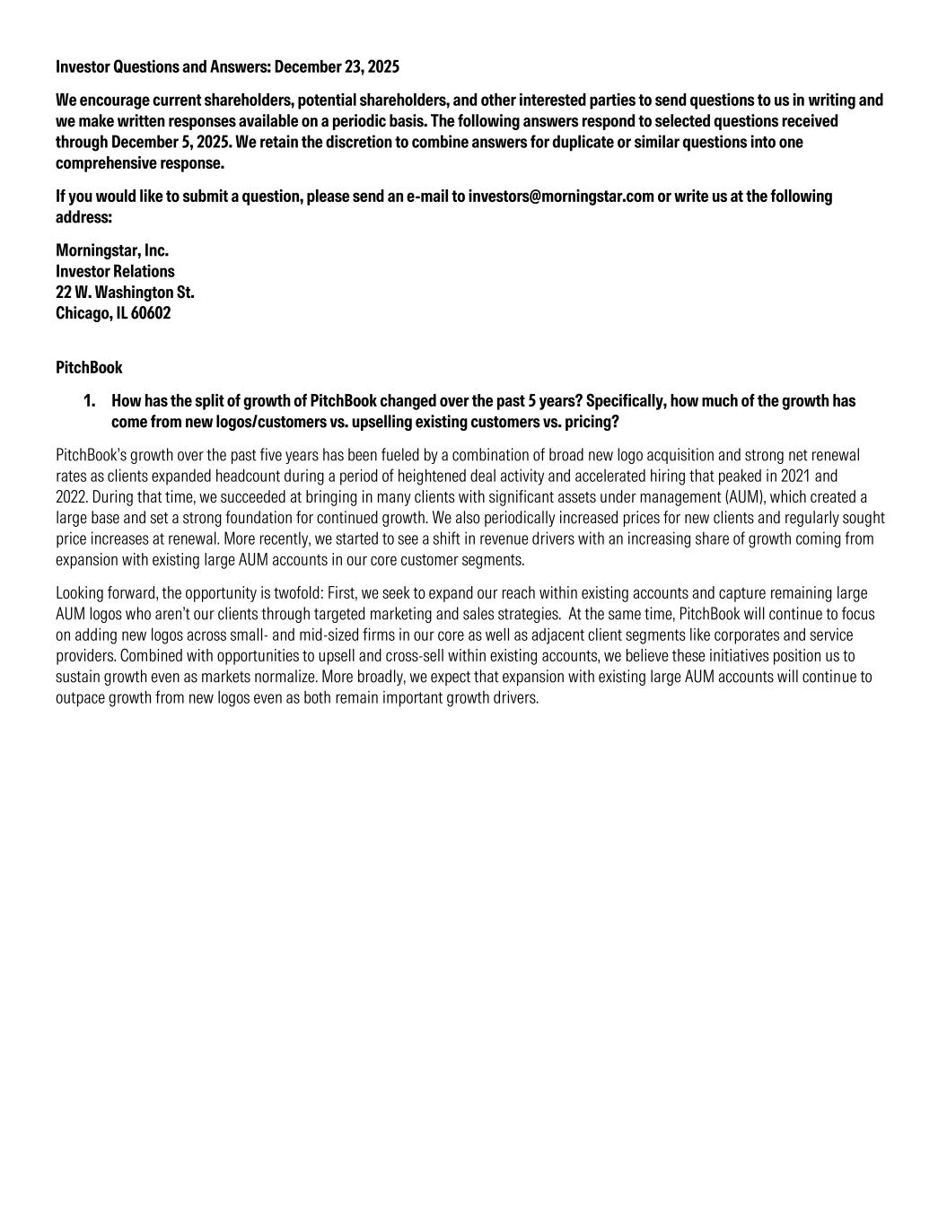Investor Questions and Answers: December 23, 2025    We encourage current shareholders, potential shareholders, and other interested parties to send questions to us in writing and we make written responses available on a periodic basis. The following answers respond to selected questions received through December 5, 2025. We retain the discretion to combine answers for duplicate or similar questions into one comprehensive response.    If you would like to submit a question, please send an e-mail to investors@morningstar.com or write us at the following address:    Morningstar, Inc.    Investor Relations    22 W. Washington St.    Chicago, IL 60602   PitchBook 1. How has the split of growth of PitchBook changed over the past 5 years? Specifically, how much of the growth has come from new logos/customers vs. upselling existing customers vs. pricing? PitchBook’s growth over the past five years has been fueled by a combination of broad new logo acquisition and strong net renewal rates as clients expanded headcount during a period of heightened deal activity and accelerated hiring that peaked in 2021 and 2022. During that time, we succeeded at bringing in many clients with significant assets under management (AUM), which created a large base and set a strong foundation for continued growth. We also periodically increased prices for new clients and regularly sought price increases at renewal. More recently, we started to see a shift in revenue drivers with an increasing share of growth coming from expansion with existing large AUM accounts in our core customer segments. Looking forward, the opportunity is twofold: First, we seek to expand our reach within existing accounts and capture remaining large AUM logos who aren’t our clients through targeted marketing and sales strategies. At the same time, PitchBook will continue to focus on adding new logos across small- and mid-sized firms in our core as well as adjacent client segments like corporates and service providers. Combined with opportunities to upsell and cross-sell within existing accounts, we believe these initiatives position us to sustain growth even as markets normalize. More broadly, we expect that expansion with existing large AUM accounts will continue to outpace growth from new logos even as both remain important growth drivers.