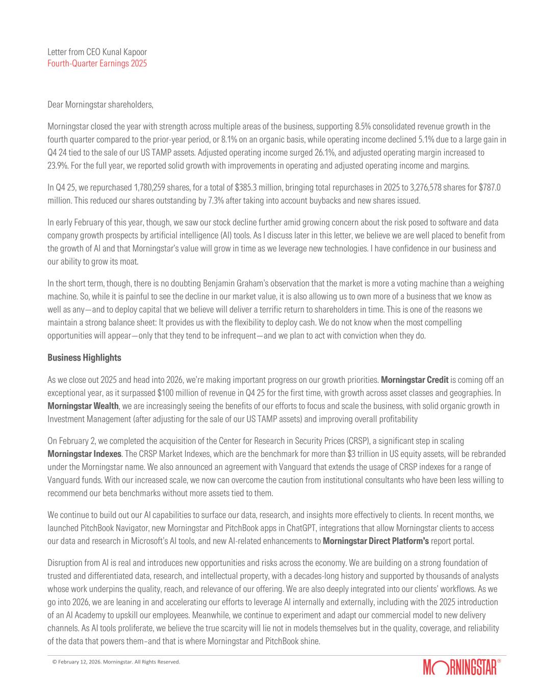© February 12, 2026. Morningstar. All Rights Reserved. Letter from CEO Kunal Kapoor Fourth-Quarter Earnings 2025 Dear Morningstar shareholders, Morningstar closed the year with strength across multiple areas of the business, supporting 8.5% consolidated revenue growth in the fourth quarter compared to the prior-year period, or 8.1% on an organic basis, while operating income declined 5.1% due to a large gain in Q4 24 tied to the sale of our US TAMP assets. Adjusted operating income surged 26.1%, and adjusted operating margin increased to 23.9%. For the full year, we reported solid growth with improvements in operating and adjusted operating income and margins. In Q4 25, we repurchased 1,780,259 shares, for a total of $385.3 million, bringing total repurchases in 2025 to 3,276,578 shares for $787.0 million. This reduced our shares outstanding by 7.3% after taking into account buybacks and new shares issued. In early February of this year, though, we saw our stock decline further amid growing concern about the risk posed to software and data company growth prospects by artificial intelligence (AI) tools. As I discuss later in this letter, we believe we are well placed to benefit from the growth of AI and that Morningstar’s value will grow in time as we leverage new technologies. I have confidence in our business and our ability to grow its moat. In the short term, though, there is no doubting Benjamin Graham’s observation that the market is more a voting machine than a weighing machine. So, while it is painful to see the decline in our market value, it is also allowing us to own more of a business that we know as well as any—and to deploy capital that we believe will deliver a terrific return to shareholders in time. This is one of the reasons we maintain a strong balance sheet: It provides us with the flexibility to deploy cash. We do not know when the most compelling opportunities will appear—only that they tend to be infrequent—and we plan to act with conviction when they do. Business Highlights As we close out 2025 and head into 2026, we’re making important progress on our growth priorities. Morningstar Credit is coming off an exceptional year, as it surpassed $100 million of revenue in Q4 25 for the first time, with growth across asset classes and geographies. In Morningstar Wealth, we are increasingly seeing the benefits of our efforts to focus and scale the business, with solid organic growth in Investment Management (after adjusting for the sale of our US TAMP assets) and improving overall profitability On February 2, we completed the acquisition of the Center for Research in Security Prices (CRSP), a significant step in scaling Morningstar Indexes. The CRSP Market Indexes, which are the benchmark for more than $3 trillion in US equity assets, will be rebranded under the Morningstar name. We also announced an agreement with Vanguard that extends the usage of CRSP indexes for a range of Vanguard funds. With our increased scale, we now can overcome the caution from institutional consultants who have been less willing to recommend our beta benchmarks without more assets tied to them. We continue to build out our AI capabilities to surface our data, research, and insights more effectively to clients. In recent months, we launched PitchBook Navigator, new Morningstar and PitchBook apps in ChatGPT, integrations that allow Morningstar clients to access our data and research in Microsoft’s AI tools, and new AI-related enhancements to Morningstar Direct Platform’s report portal. Disruption from AI is real and introduces new opportunities and risks across the economy. We are building on a strong foundation of trusted and differentiated data, research, and intellectual property, with a decades-long history and supported by thousands of analysts whose work underpins the quality, reach, and relevance of our offering. We are also deeply integrated into our clients’ workflows. As we go into 2026, we are leaning in and accelerating our efforts to leverage AI internally and externally, including with the 2025 introduction of an AI Academy to upskill our employees. Meanwhile, we continue to experiment and adapt our commercial model to new delivery channels. As AI tools proliferate, we believe the true scarcity will lie not in models themselves but in the quality, coverage, and reliability of the data that powers them–and that is where Morningstar and PitchBook shine.