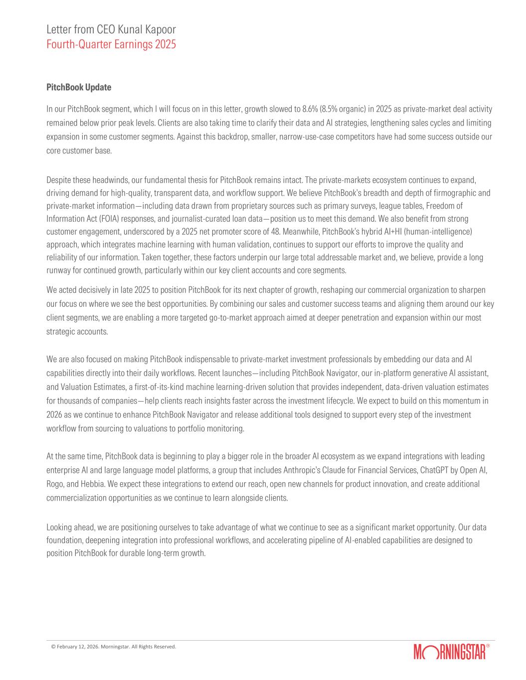 Letter from CEO Kunal Kapoor Fourth-Quarter Earnings 2025 © February 12, 2026. Morningstar. All Rights Reserved. PitchBook Update In our PitchBook segment, which I will focus on in this letter, growth slowed to 8.6% (8.5% organic) in 2025 as private‑market deal activity remained below prior peak levels. Clients are also taking time to clarify their data and AI strategies, lengthening sales cycles and limiting expansion in some customer segments. Against this backdrop, smaller, narrow‑use‑case competitors have had some success outside our core customer base. Despite these headwinds, our fundamental thesis for PitchBook remains intact. The private‑markets ecosystem continues to expand, driving demand for high-quality, transparent data, and workflow support. We believe PitchBook’s breadth and depth of firmographic and private-market information—including data drawn from proprietary sources such as primary surveys, league tables, Freedom of Information Act (FOIA) responses, and journalist-curated loan data—position us to meet this demand. We also benefit from strong customer engagement, underscored by a 2025 net promoter score of 48. Meanwhile, PitchBook’s hybrid AI+HI (human-intelligence) approach, which integrates machine learning with human validation, continues to support our efforts to improve the quality and reliability of our information. Taken together, these factors underpin our large total addressable market and, we believe, provide a long runway for continued growth, particularly within our key client accounts and core segments. We acted decisively in late 2025 to position PitchBook for its next chapter of growth, reshaping our commercial organization to sharpen our focus on where we see the best opportunities. By combining our sales and customer success teams and aligning them around our key client segments, we are enabling a more targeted go-to-market approach aimed at deeper penetration and expansion within our most strategic accounts. We are also focused on making PitchBook indispensable to private-market investment professionals by embedding our data and AI capabilities directly into their daily workflows. Recent launches—including PitchBook Navigator, our in-platform generative AI assistant, and Valuation Estimates, a first-of-its-kind machine learning-driven solution that provides independent, data-driven valuation estimates for thousands of companies—help clients reach insights faster across the investment lifecycle. We expect to build on this momentum in 2026 as we continue to enhance PitchBook Navigator and release additional tools designed to support every step of the investment workflow from sourcing to valuations to portfolio monitoring. At the same time, PitchBook data is beginning to play a bigger role in the broader AI ecosystem as we expand integrations with leading enterprise AI and large language model platforms, a group that includes Anthropic’s Claude for Financial Services, ChatGPT by Open AI, Rogo, and Hebbia. We expect these integrations to extend our reach, open new channels for product innovation, and create additional commercialization opportunities as we continue to learn alongside clients. Looking ahead, we are positioning ourselves to take advantage of what we continue to see as a significant market opportunity. Our data foundation, deepening integration into professional workflows, and accelerating pipeline of AI-enabled capabilities are designed to position PitchBook for durable long-term growth.