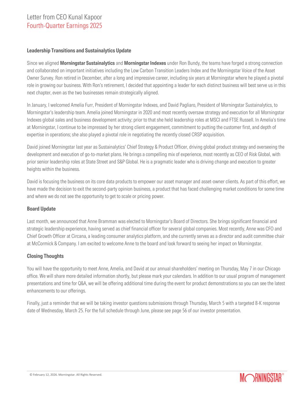 Letter from CEO Kunal Kapoor Fourth-Quarter Earnings 2025 © February 12, 2026. Morningstar. All Rights Reserved. Leadership Transitions and Sustainalytics Update Since we aligned Morningstar Sustainalytics and Morningstar Indexes under Ron Bundy, the teams have forged a strong connection and collaborated on important initiatives including the Low Carbon Transition Leaders Index and the Morningstar Voice of the Asset Owner Survey. Ron retired in December, after a long and impressive career, including six years at Morningstar where he played a pivotal role in growing our business. With Ron’s retirement, I decided that appointing a leader for each distinct business will best serve us in this next chapter, even as the two businesses remain strategically aligned. In January, I welcomed Amelia Furr, President of Morningstar Indexes, and David Pagliaro, President of Morningstar Sustainalytics, to Morningstar’s leadership team. Amelia joined Morningstar in 2020 and most recently oversaw strategy and execution for all Morningstar Indexes global sales and business development activity; prior to that she held leadership roles at MSCI and FTSE Russell. In Amelia’s time at Morningstar, I continue to be impressed by her strong client engagement, commitment to putting the customer first, and depth of expertise in operations; she also played a pivotal role in negotiating the recently closed CRSP acquisition. David joined Morningstar last year as Sustainalytics’ Chief Strategy & Product Officer, driving global product strategy and overseeing the development and execution of go-to-market plans. He brings a compelling mix of experience, most recently as CEO of Risk Global, with prior senior leadership roles at State Street and S&P Global. He is a pragmatic leader who is driving change and execution to greater heights within the business. David is focusing the business on its core data products to empower our asset manager and asset-owner clients. As part of this effort, we have made the decision to exit the second-party opinion business, a product that has faced challenging market conditions for some time and where we do not see the opportunity to get to scale or pricing power. Board Update Last month, we announced that Anne Bramman was elected to Morningstar’s Board of Directors. She brings significant financial and strategic leadership experience, having served as chief financial officer for several global companies. Most recently, Anne was CFO and Chief Growth Officer at Circana, a leading consumer analytics platform, and she currently serves as a director and audit committee chair at McCormick & Company. I am excited to welcome Anne to the board and look forward to seeing her impact on Morningstar. Closing Thoughts You will have the opportunity to meet Anne, Amelia, and David at our annual shareholders’ meeting on Thursday, May 7 in our Chicago office. We will share more detailed information shortly, but please mark your calendars. In addition to our usual program of management presentations and time for Q&A, we will be offering additional time during the event for product demonstrations so you can see the latest enhancements to our offerings. Finally, just a reminder that we will be taking investor questions submissions through Thursday, March 5 with a targeted 8-K response date of Wednesday, March 25. For the full schedule through June, please see page 56 of our investor presentation.