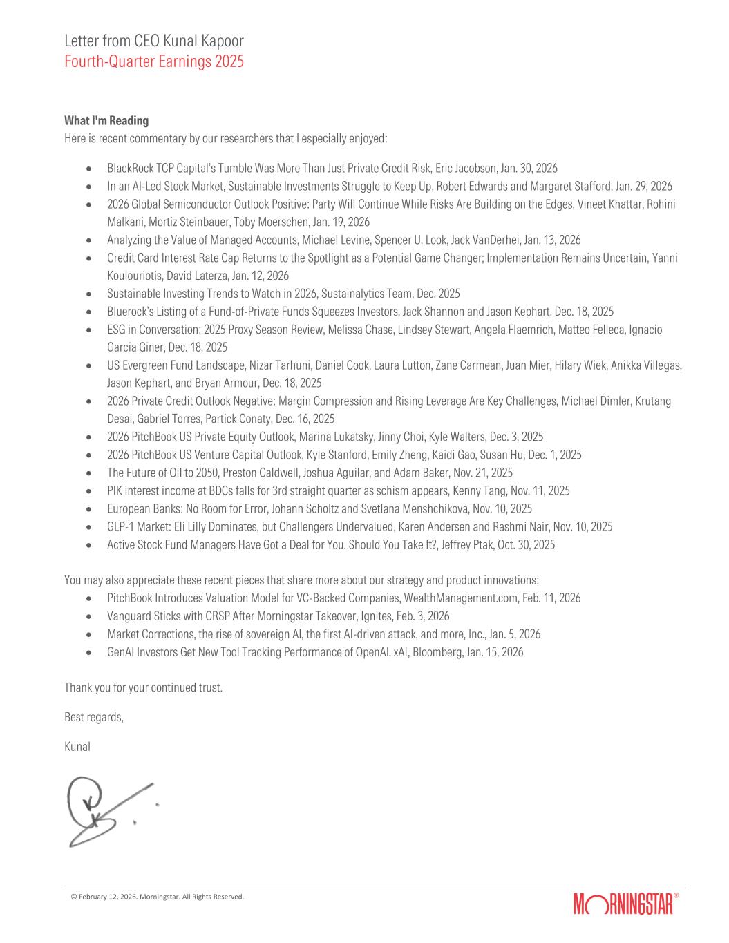 Letter from CEO Kunal Kapoor Fourth-Quarter Earnings 2025 © February 12, 2026. Morningstar. All Rights Reserved. What I'm Reading Here is recent commentary by our researchers that I especially enjoyed: • BlackRock TCP Capital’s Tumble Was More Than Just Private Credit Risk, Eric Jacobson, Jan. 30, 2026 • In an AI-Led Stock Market, Sustainable Investments Struggle to Keep Up, Robert Edwards and Margaret Stafford, Jan. 29, 2026 • 2026 Global Semiconductor Outlook Positive: Party Will Continue While Risks Are Building on the Edges, Vineet Khattar, Rohini Malkani, Mortiz Steinbauer, Toby Moerschen, Jan. 19, 2026 • Analyzing the Value of Managed Accounts, Michael Levine, Spencer U. Look, Jack VanDerhei, Jan. 13, 2026 • Credit Card Interest Rate Cap Returns to the Spotlight as a Potential Game Changer; Implementation Remains Uncertain, Yanni Koulouriotis, David Laterza, Jan. 12, 2026 • Sustainable Investing Trends to Watch in 2026, Sustainalytics Team, Dec. 2025 • Bluerock’s Listing of a Fund-of-Private Funds Squeezes Investors, Jack Shannon and Jason Kephart, Dec. 18, 2025 • ESG in Conversation: 2025 Proxy Season Review, Melissa Chase, Lindsey Stewart, Angela Flaemrich, Matteo Felleca, Ignacio Garcia Giner, Dec. 18, 2025 • US Evergreen Fund Landscape, Nizar Tarhuni, Daniel Cook, Laura Lutton, Zane Carmean, Juan Mier, Hilary Wiek, Anikka Villegas, Jason Kephart, and Bryan Armour, Dec. 18, 2025 • 2026 Private Credit Outlook Negative: Margin Compression and Rising Leverage Are Key Challenges, Michael Dimler, Krutang Desai, Gabriel Torres, Partick Conaty, Dec. 16, 2025 • 2026 PitchBook US Private Equity Outlook, Marina Lukatsky, Jinny Choi, Kyle Walters, Dec. 3, 2025 • 2026 PitchBook US Venture Capital Outlook, Kyle Stanford, Emily Zheng, Kaidi Gao, Susan Hu, Dec. 1, 2025 • The Future of Oil to 2050, Preston Caldwell, Joshua Aguilar, and Adam Baker, Nov. 21, 2025 • PIK interest income at BDCs falls for 3rd straight quarter as schism appears, Kenny Tang, Nov. 11, 2025 • European Banks: No Room for Error, Johann Scholtz and Svetlana Menshchikova, Nov. 10, 2025 • GLP-1 Market: Eli Lilly Dominates, but Challengers Undervalued, Karen Andersen and Rashmi Nair, Nov. 10, 2025 • Active Stock Fund Managers Have Got a Deal for You. Should You Take It?, Jeffrey Ptak, Oct. 30, 2025 You may also appreciate these recent pieces that share more about our strategy and product innovations: • PitchBook Introduces Valuation Model for VC-Backed Companies, WealthManagement.com, Feb. 11, 2026 • Vanguard Sticks with CRSP After Morningstar Takeover, Ignites, Feb. 3, 2026 • Market Corrections, the rise of sovereign AI, the first AI-driven attack, and more, Inc., Jan. 5, 2026 • GenAI Investors Get New Tool Tracking Performance of OpenAI, xAI, Bloomberg, Jan. 15, 2026 Thank you for your continued trust. Best regards, Kunal