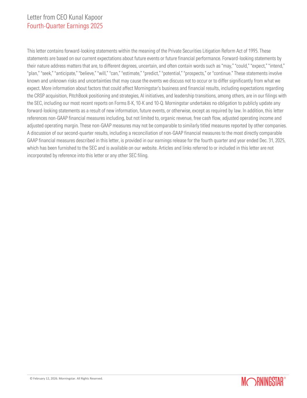 Letter from CEO Kunal Kapoor Fourth-Quarter Earnings 2025 © February 12, 2026. Morningstar. All Rights Reserved. This letter contains forward-looking statements within the meaning of the Private Securities Litigation Reform Act of 1995. These statements are based on our current expectations about future events or future financial performance. Forward-looking statements by their nature address matters that are, to different degrees, uncertain, and often contain words such as “may,” “could,” “expect,” “intend,” “plan,” “seek,” “anticipate,” “believe,” “will,” “can,” “estimate,” “predict,” “potential,” “prospects,” or “continue.” These statements involve known and unknown risks and uncertainties that may cause the events we discuss not to occur or to differ significantly from what we expect. More information about factors that could affect Morningstar’s business and financial results, including expectations regarding the CRSP acquisition, PitchBook positioning and strategies, AI initiatives, and leadership transitions, among others, are in our filings with the SEC, including our most recent reports on Forms 8-K, 10-K and 10-Q. Morningstar undertakes no obligation to publicly update any forward-looking statements as a result of new information, future events, or otherwise, except as required by law. In addition, this letter references non-GAAP financial measures including, but not limited to, organic revenue, free cash flow, adjusted operating income and adjusted operating margin. These non-GAAP measures may not be comparable to similarly titled measures reported by other companies. A discussion of our second-quarter results, including a reconciliation of non-GAAP financial measures to the most directly comparable GAAP financial measures described in this letter, is provided in our earnings release for the fourth quarter and year ended Dec. 31, 2025, which has been furnished to the SEC and is available on our website. Articles and links referred to or included in this letter are not incorporated by reference into this letter or any other SEC filing.