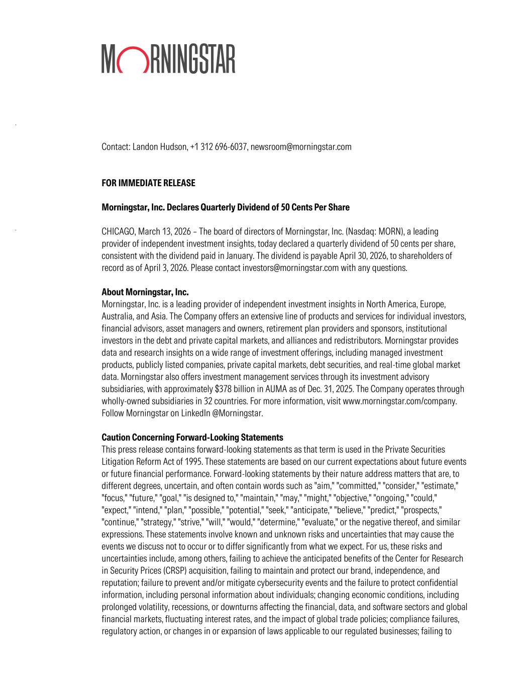 Contact: Landon Hudson, +1 312 696-6037, newsroom@morningstar.com FOR IMMEDIATE RELEASE Morningstar, Inc. Declares Quarterly Dividend of 50 Cents Per Share CHICAGO, March 13, 2026 – The board of directors of Morningstar, Inc. (Nasdaq: MORN), a leading provider of independent investment insights, today declared a quarterly dividend of 50 cents per share, consistent with the dividend paid in January. The dividend is payable April 30, 2026, to shareholders of record as of April 3, 2026. Please contact investors@morningstar.com with any questions. About Morningstar, Inc. Morningstar, Inc. is a leading provider of independent investment insights in North America, Europe, Australia, and Asia. The Company offers an extensive line of products and services for individual investors, financial advisors, asset managers and owners, retirement plan providers and sponsors, institutional investors in the debt and private capital markets, and alliances and redistributors. Morningstar provides data and research insights on a wide range of investment offerings, including managed investment products, publicly listed companies, private capital markets, debt securities, and real-time global market data. Morningstar also offers investment management services through its investment advisory subsidiaries, with approximately $378 billion in AUMA as of Dec. 31, 2025. The Company operates through wholly-owned subsidiaries in 32 countries. For more information, visit www.morningstar.com/company. Follow Morningstar on LinkedIn @Morningstar. Caution Concerning Forward-Looking Statements This press release contains forward-looking statements as that term is used in the Private Securities Litigation Reform Act of 1995. These statements are based on our current expectations about future events or future financial performance. Forward-looking statements by their nature address matters that are, to different degrees, uncertain, and often contain words such as "aim," "committed," "consider," "estimate," "focus," "future," "goal," "is designed to," "maintain," "may," "might," "objective," "ongoing," "could," "expect," "intend," "plan," "possible," "potential," "seek," "anticipate," "believe," "predict," "prospects," "continue," "strategy," "strive," "will," "would," "determine," "evaluate," or the negative thereof, and similar expressions. These statements involve known and unknown risks and uncertainties that may cause the events we discuss not to occur or to differ significantly from what we expect. For us, these risks and uncertainties include, among others, failing to achieve the anticipated benefits of the Center for Research in Security Prices (CRSP) acquisition, failing to maintain and protect our brand, independence, and reputation; failure to prevent and/or mitigate cybersecurity events and the failure to protect confidential information, including personal information about individuals; changing economic conditions, including prolonged volatility, recessions, or downturns affecting the financial, data, and software sectors and global financial markets, fluctuating interest rates, and the impact of global trade policies; compliance failures, regulatory action, or changes in or expansion of laws applicable to our regulated businesses; failing to