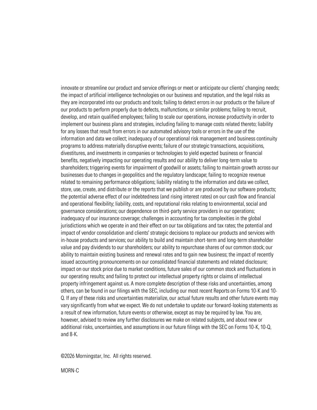 innovate or streamline our product and service offerings or meet or anticipate our clients’ changing needs; the impact of artificial intelligence technologies on our business and reputation, and the legal risks as they are incorporated into our products and tools; failing to detect errors in our products or the failure of our products to perform properly due to defects, malfunctions, or similar problems; failing to recruit, develop, and retain qualified employees; failing to scale our operations, increase productivity in order to implement our business plans and strategies, including failing to manage costs related thereto; liability for any losses that result from errors in our automated advisory tools or errors in the use of the information and data we collect; inadequacy of our operational risk management and business continuity programs to address materially disruptive events; failure of our strategic transactions, acquisitions, divestitures, and investments in companies or technologies to yield expected business or financial benefits, negatively impacting our operating results and our ability to deliver long-term value to shareholders; triggering events for impairment of goodwill or assets; failing to maintain growth across our businesses due to changes in geopolitics and the regulatory landscape; failing to recognize revenue related to remaining performance obligations; liability relating to the information and data we collect, store, use, create, and distribute or the reports that we publish or are produced by our software products; the potential adverse effect of our indebtedness (and rising interest rates) on our cash flow and financial and operational flexibility; liability, costs, and reputational risks relating to environmental, social and governance considerations; our dependence on third-party service providers in our operations; inadequacy of our insurance coverage; challenges in accounting for tax complexities in the global jurisdictions which we operate in and their effect on our tax obligations and tax rates; the potential and impact of vendor consolidation and clients' strategic decisions to replace our products and services with in-house products and services; our ability to build and maintain short-term and long-term shareholder value and pay dividends to our shareholders; our ability to repurchase shares of our common stock; our ability to maintain existing business and renewal rates and to gain new business; the impact of recently issued accounting pronouncements on our consolidated financial statements and related disclosure; impact on our stock price due to market conditions, future sales of our common stock and fluctuations in our operating results; and failing to protect our intellectual property rights or claims of intellectual property infringement against us. A more complete description of these risks and uncertainties, among others, can be found in our filings with the SEC, including our most recent Reports on Forms 10-K and 10- Q. If any of these risks and uncertainties materialize, our actual future results and other future events may vary significantly from what we expect. We do not undertake to update our forward-looking statements as a result of new information, future events or otherwise, except as may be required by law. You are, however, advised to review any further disclosures we make on related subjects, and about new or additional risks, uncertainties, and assumptions in our future filings with the SEC on Forms 10-K, 10-Q, and 8-K. ©2026 Morningstar, Inc. All rights reserved. MORN-C