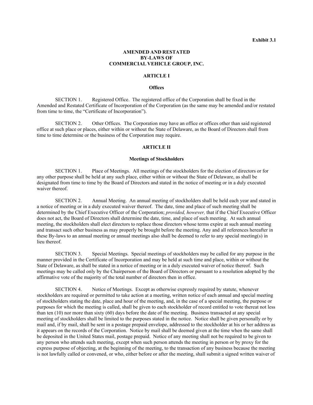 Exhibit 3.1 AMENDED AND RESTATED BY-LAWS OF COMMERCIAL VEHICLE GROUP, INC. ARTICLE I Offices SECTION 1. Registered Office. The registered office of the Corporation shall be fixed in the Amended and Restated Certificate of Incorporation of the Corporation (as the same may be amended and/or restated from time to time, the “Certificate of Incorporation”). SECTION 2. Other Offices. The Corporation may have an office or offices other than said registered office at such place or places, either within or without the State of Delaware, as the Board of Directors shall from time to time determine or the business of the Corporation may require. ARTICLE II Meetings of Stockholders SECTION 1. Place of Meetings. All meetings of the stockholders for the election of directors or for any other purpose shall be held at any such place, either within or without the State of Delaware, as shall be designated from time to time by the Board of Directors and stated in the notice of meeting or in a duly executed waiver thereof. SECTION 2. Annual Meeting. An annual meeting of stockholders shall be held each year and stated in a notice of meeting or in a duly executed waiver thereof. The date, time and place of such meeting shall be determined by the Chief Executive Officer of the Corporation; provided, however, that if the Chief Executive Officer does not act, the Board of Directors shall determine the date, time, and place of such meeting. At such annual meeting, the stockholders shall elect directors to replace those directors whose terms expire at such annual meeting and transact such other business as may properly be brought before the meeting. Any and all references hereafter in these By-laws to an annual meeting or annual meetings also shall be deemed to refer to any special meeting(s) in lieu thereof. SECTION 3. Special Meetings. Special meetings of stockholders may be called for any purpose in the manner provided in the Certificate of Incorporation and may be held at such time and place, within or without the State of Delaware, as shall be stated in a notice of meeting or in a duly executed waiver of notice thereof. Such meetings may be called only by the Chairperson of the Board of Directors or pursuant to a resolution adopted by the affirmative vote of the majority of the total number of directors then in office. SECTION 4. Notice of Meetings. Except as otherwise expressly required by statute, whenever stockholders are required or permitted to take action at a meeting, written notice of each annual and special meeting of stockholders stating the date, place and hour of the meeting, and, in the case of a special meeting, the purpose or purposes for which the meeting is called, shall be given to each stockholder of record entitled to vote thereat not less than ten (10) nor more than sixty (60) days before the date of the meeting. Business transacted at any special meeting of stockholders shall be limited to the purposes stated in the notice. Notice shall be given personally or by mail and, if by mail, shall be sent in a postage prepaid envelope, addressed to the stockholder at his or her address as it appears on the records of the Corporation. Notice by mail shall be deemed given at the time when the same shall be deposited in the United States mail, postage prepaid. Notice of any meeting shall not be required to be given to any person who attends such meeting, except when such person attends the meeting in person or by proxy for the express purpose of objecting, at the beginning of the meeting, to the transaction of any business because the meeting is not lawfully called or convened, or who, either before or after the meeting, shall submit a signed written waiver of