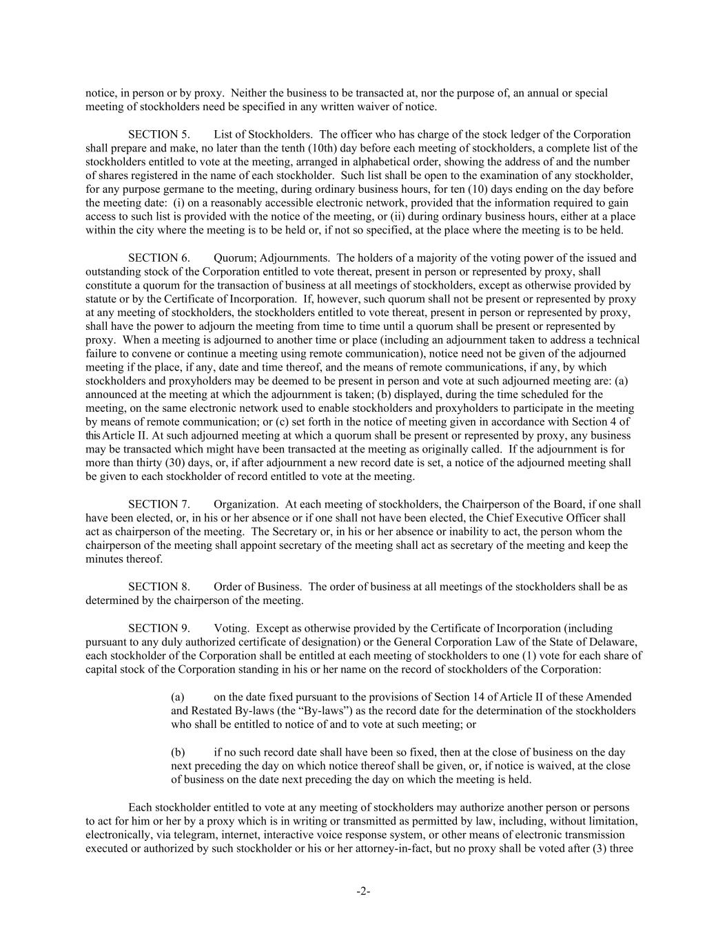-2- notice, in person or by proxy. Neither the business to be transacted at, nor the purpose of, an annual or special meeting of stockholders need be specified in any written waiver of notice. SECTION 5. List of Stockholders. The officer who has charge of the stock ledger of the Corporation shall prepare and make, no later than the tenth (10th) day before each meeting of stockholders, a complete list of the stockholders entitled to vote at the meeting, arranged in alphabetical order, showing the address of and the number of shares registered in the name of each stockholder. Such list shall be open to the examination of any stockholder, for any purpose germane to the meeting, during ordinary business hours, for ten (10) days ending on the day before the meeting date: (i) on a reasonably accessible electronic network, provided that the information required to gain access to such list is provided with the notice of the meeting, or (ii) during ordinary business hours, either at a place within the city where the meeting is to be held or, if not so specified, at the place where the meeting is to be held. SECTION 6. Quorum; Adjournments. The holders of a majority of the voting power of the issued and outstanding stock of the Corporation entitled to vote thereat, present in person or represented by proxy, shall constitute a quorum for the transaction of business at all meetings of stockholders, except as otherwise provided by statute or by the Certificate of Incorporation. If, however, such quorum shall not be present or represented by proxy at any meeting of stockholders, the stockholders entitled to vote thereat, present in person or represented by proxy, shall have the power to adjourn the meeting from time to time until a quorum shall be present or represented by proxy. When a meeting is adjourned to another time or place (including an adjournment taken to address a technical failure to convene or continue a meeting using remote communication), notice need not be given of the adjourned meeting if the place, if any, date and time thereof, and the means of remote communications, if any, by which stockholders and proxyholders may be deemed to be present in person and vote at such adjourned meeting are: (a) announced at the meeting at which the adjournment is taken; (b) displayed, during the time scheduled for the meeting, on the same electronic network used to enable stockholders and proxyholders to participate in the meeting by means of remote communication; or (c) set forth in the notice of meeting given in accordance with Section 4 of this Article II. At such adjourned meeting at which a quorum shall be present or represented by proxy, any business may be transacted which might have been transacted at the meeting as originally called. If the adjournment is for more than thirty (30) days, or, if after adjournment a new record date is set, a notice of the adjourned meeting shall be given to each stockholder of record entitled to vote at the meeting. SECTION 7. Organization. At each meeting of stockholders, the Chairperson of the Board, if one shall have been elected, or, in his or her absence or if one shall not have been elected, the Chief Executive Officer shall act as chairperson of the meeting. The Secretary or, in his or her absence or inability to act, the person whom the chairperson of the meeting shall appoint secretary of the meeting shall act as secretary of the meeting and keep the minutes thereof. SECTION 8. Order of Business. The order of business at all meetings of the stockholders shall be as determined by the chairperson of the meeting. SECTION 9. Voting. Except as otherwise provided by the Certificate of Incorporation (including pursuant to any duly authorized certificate of designation) or the General Corporation Law of the State of Delaware, each stockholder of the Corporation shall be entitled at each meeting of stockholders to one (1) vote for each share of capital stock of the Corporation standing in his or her name on the record of stockholders of the Corporation: (a) on the date fixed pursuant to the provisions of Section 14 of Article II of these Amended and Restated By-laws (the “By-laws”) as the record date for the determination of the stockholders who shall be entitled to notice of and to vote at such meeting; or (b) if no such record date shall have been so fixed, then at the close of business on the day next preceding the day on which notice thereof shall be given, or, if notice is waived, at the close of business on the date next preceding the day on which the meeting is held. Each stockholder entitled to vote at any meeting of stockholders may authorize another person or persons to act for him or her by a proxy which is in writing or transmitted as permitted by law, including, without limitation, electronically, via telegram, internet, interactive voice response system, or other means of electronic transmission executed or authorized by such stockholder or his or her attorney-in-fact, but no proxy shall be voted after (3) three