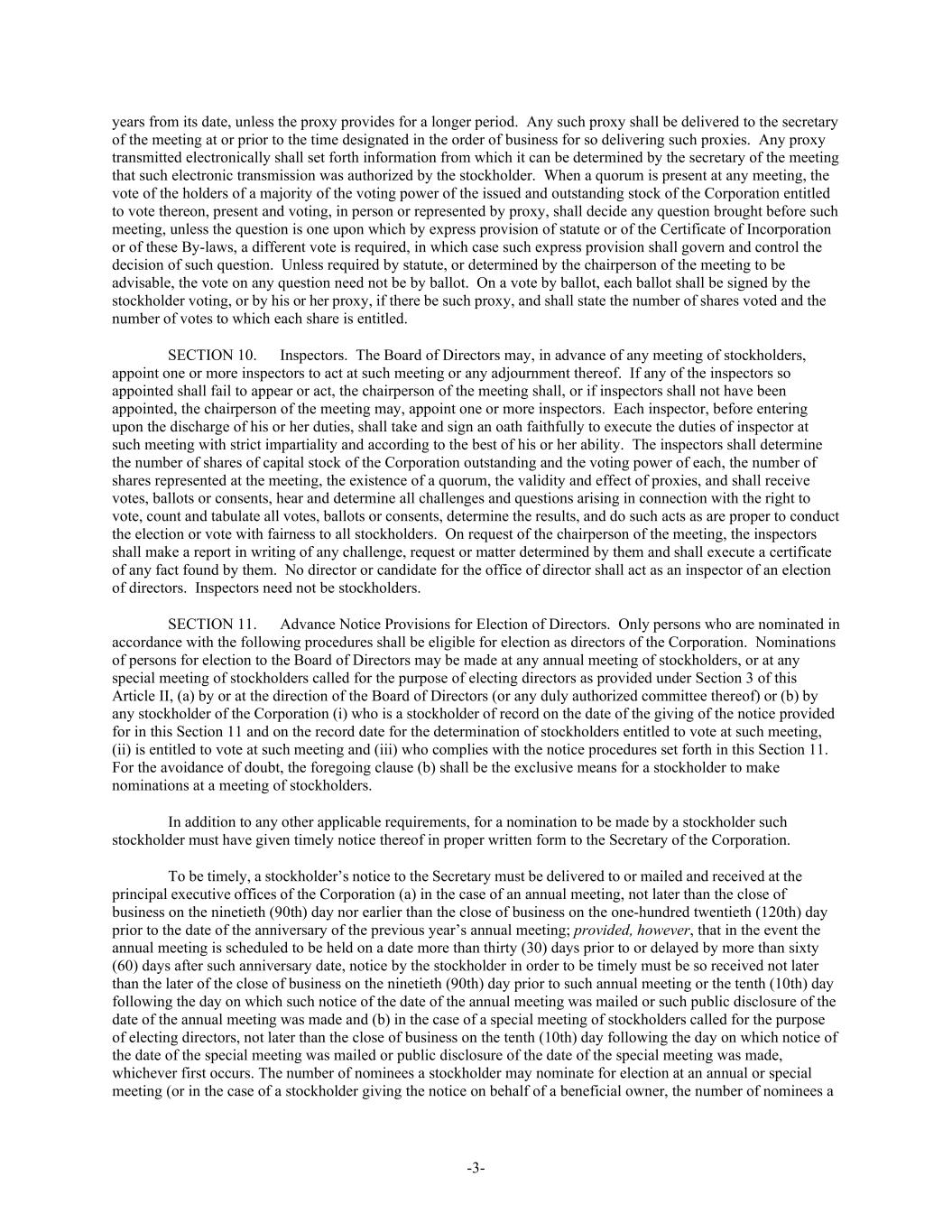 -3- years from its date, unless the proxy provides for a longer period. Any such proxy shall be delivered to the secretary of the meeting at or prior to the time designated in the order of business for so delivering such proxies. Any proxy transmitted electronically shall set forth information from which it can be determined by the secretary of the meeting that such electronic transmission was authorized by the stockholder. When a quorum is present at any meeting, the vote of the holders of a majority of the voting power of the issued and outstanding stock of the Corporation entitled to vote thereon, present and voting, in person or represented by proxy, shall decide any question brought before such meeting, unless the question is one upon which by express provision of statute or of the Certificate of Incorporation or of these By-laws, a different vote is required, in which case such express provision shall govern and control the decision of such question. Unless required by statute, or determined by the chairperson of the meeting to be advisable, the vote on any question need not be by ballot. On a vote by ballot, each ballot shall be signed by the stockholder voting, or by his or her proxy, if there be such proxy, and shall state the number of shares voted and the number of votes to which each share is entitled. SECTION 10. Inspectors. The Board of Directors may, in advance of any meeting of stockholders, appoint one or more inspectors to act at such meeting or any adjournment thereof. If any of the inspectors so appointed shall fail to appear or act, the chairperson of the meeting shall, or if inspectors shall not have been appointed, the chairperson of the meeting may, appoint one or more inspectors. Each inspector, before entering upon the discharge of his or her duties, shall take and sign an oath faithfully to execute the duties of inspector at such meeting with strict impartiality and according to the best of his or her ability. The inspectors shall determine the number of shares of capital stock of the Corporation outstanding and the voting power of each, the number of shares represented at the meeting, the existence of a quorum, the validity and effect of proxies, and shall receive votes, ballots or consents, hear and determine all challenges and questions arising in connection with the right to vote, count and tabulate all votes, ballots or consents, determine the results, and do such acts as are proper to conduct the election or vote with fairness to all stockholders. On request of the chairperson of the meeting, the inspectors shall make a report in writing of any challenge, request or matter determined by them and shall execute a certificate of any fact found by them. No director or candidate for the office of director shall act as an inspector of an election of directors. Inspectors need not be stockholders. SECTION 11. Advance Notice Provisions for Election of Directors. Only persons who are nominated in accordance with the following procedures shall be eligible for election as directors of the Corporation. Nominations of persons for election to the Board of Directors may be made at any annual meeting of stockholders, or at any special meeting of stockholders called for the purpose of electing directors as provided under Section 3 of this Article II, (a) by or at the direction of the Board of Directors (or any duly authorized committee thereof) or (b) by any stockholder of the Corporation (i) who is a stockholder of record on the date of the giving of the notice provided for in this Section 11 and on the record date for the determination of stockholders entitled to vote at such meeting, (ii) is entitled to vote at such meeting and (iii) who complies with the notice procedures set forth in this Section 11. For the avoidance of doubt, the foregoing clause (b) shall be the exclusive means for a stockholder to make nominations at a meeting of stockholders. In addition to any other applicable requirements, for a nomination to be made by a stockholder such stockholder must have given timely notice thereof in proper written form to the Secretary of the Corporation. To be timely, a stockholder’s notice to the Secretary must be delivered to or mailed and received at the principal executive offices of the Corporation (a) in the case of an annual meeting, not later than the close of business on the ninetieth (90th) day nor earlier than the close of business on the one-hundred twentieth (120th) day prior to the date of the anniversary of the previous year’s annual meeting; provided, however, that in the event the annual meeting is scheduled to be held on a date more than thirty (30) days prior to or delayed by more than sixty (60) days after such anniversary date, notice by the stockholder in order to be timely must be so received not later than the later of the close of business on the ninetieth (90th) day prior to such annual meeting or the tenth (10th) day following the day on which such notice of the date of the annual meeting was mailed or such public disclosure of the date of the annual meeting was made and (b) in the case of a special meeting of stockholders called for the purpose of electing directors, not later than the close of business on the tenth (10th) day following the day on which notice of the date of the special meeting was mailed or public disclosure of the date of the special meeting was made, whichever first occurs. The number of nominees a stockholder may nominate for election at an annual or special meeting (or in the case of a stockholder giving the notice on behalf of a beneficial owner, the number of nominees a
