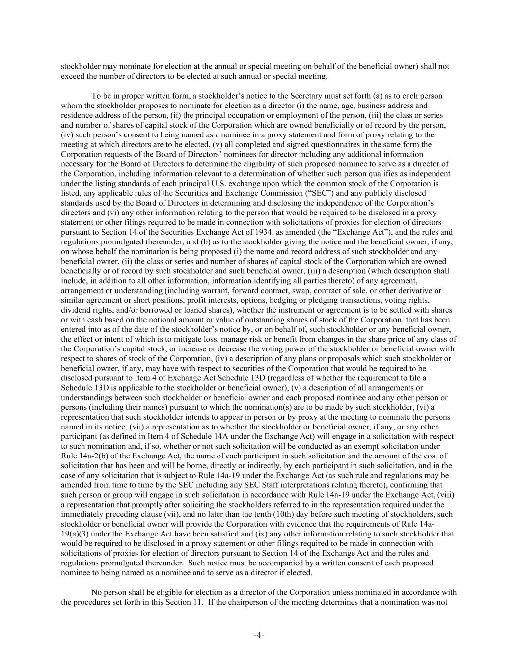 -4- stockholder may nominate for election at the annual or special meeting on behalf of the beneficial owner) shall not exceed the number of directors to be elected at such annual or special meeting. To be in proper written form, a stockholder’s notice to the Secretary must set forth (a) as to each person whom the stockholder proposes to nominate for election as a director (i) the name, age, business address and residence address of the person, (ii) the principal occupation or employment of the person, (iii) the class or series and number of shares of capital stock of the Corporation which are owned beneficially or of record by the person, (iv) such person’s consent to being named as a nominee in a proxy statement and form of proxy relating to the meeting at which directors are to be elected, (v) all completed and signed questionnaires in the same form the Corporation requests of the Board of Directors’ nominees for director including any additional information necessary for the Board of Directors to determine the eligibility of such proposed nominee to serve as a director of the Corporation, including information relevant to a determination of whether such person qualifies as independent under the listing standards of each principal U.S. exchange upon which the common stock of the Corporation is listed, any applicable rules of the Securities and Exchange Commission (“SEC”) and any publicly disclosed standards used by the Board of Directors in determining and disclosing the independence of the Corporation’s directors and (vi) any other information relating to the person that would be required to be disclosed in a proxy statement or other filings required to be made in connection with solicitations of proxies for election of directors pursuant to Section 14 of the Securities Exchange Act of 1934, as amended (the “Exchange Act”), and the rules and regulations promulgated thereunder; and (b) as to the stockholder giving the notice and the beneficial owner, if any, on whose behalf the nomination is being proposed (i) the name and record address of such stockholder and any beneficial owner, (ii) the class or series and number of shares of capital stock of the Corporation which are owned beneficially or of record by such stockholder and such beneficial owner, (iii) a description (which description shall include, in addition to all other information, information identifying all parties thereto) of any agreement, arrangement or understanding (including warrant, forward contract, swap, contract of sale, or other derivative or similar agreement or short positions, profit interests, options, hedging or pledging transactions, voting rights, dividend rights, and/or borrowed or loaned shares), whether the instrument or agreement is to be settled with shares or with cash based on the notional amount or value of outstanding shares of stock of the Corporation, that has been entered into as of the date of the stockholder’s notice by, or on behalf of, such stockholder or any beneficial owner, the effect or intent of which is to mitigate loss, manage risk or benefit from changes in the share price of any class of the Corporation’s capital stock, or increase or decrease the voting power of the stockholder or beneficial owner with respect to shares of stock of the Corporation, (iv) a description of any plans or proposals which such stockholder or beneficial owner, if any, may have with respect to securities of the Corporation that would be required to be disclosed pursuant to Item 4 of Exchange Act Schedule 13D (regardless of whether the requirement to file a Schedule 13D is applicable to the stockholder or beneficial owner), (v) a description of all arrangements or understandings between such stockholder or beneficial owner and each proposed nominee and any other person or persons (including their names) pursuant to which the nomination(s) are to be made by such stockholder, (vi) a representation that such stockholder intends to appear in person or by proxy at the meeting to nominate the persons named in its notice, (vii) a representation as to whether the stockholder or beneficial owner, if any, or any other participant (as defined in Item 4 of Schedule 14A under the Exchange Act) will engage in a solicitation with respect to such nomination and, if so, whether or not such solicitation will be conducted as an exempt solicitation under Rule 14a-2(b) of the Exchange Act, the name of each participant in such solicitation and the amount of the cost of solicitation that has been and will be borne, directly or indirectly, by each participant in such solicitation, and in the case of any solicitation that is subject to Rule 14a-19 under the Exchange Act (as such rule and regulations may be amended from time to time by the SEC including any SEC Staff interpretations relating thereto), confirming that such person or group will engage in such solicitation in accordance with Rule 14a-19 under the Exchange Act, (viii) a representation that promptly after soliciting the stockholders referred to in the representation required under the immediately preceding clause (vii), and no later than the tenth (10th) day before such meeting of stockholders, such stockholder or beneficial owner will provide the Corporation with evidence that the requirements of Rule 14a- 19(a)(3) under the Exchange Act have been satisfied and (ix) any other information relating to such stockholder that would be required to be disclosed in a proxy statement or other filings required to be made in connection with solicitations of proxies for election of directors pursuant to Section 14 of the Exchange Act and the rules and regulations promulgated thereunder. Such notice must be accompanied by a written consent of each proposed nominee to being named as a nominee and to serve as a director if elected. No person shall be eligible for election as a director of the Corporation unless nominated in accordance with the procedures set fort